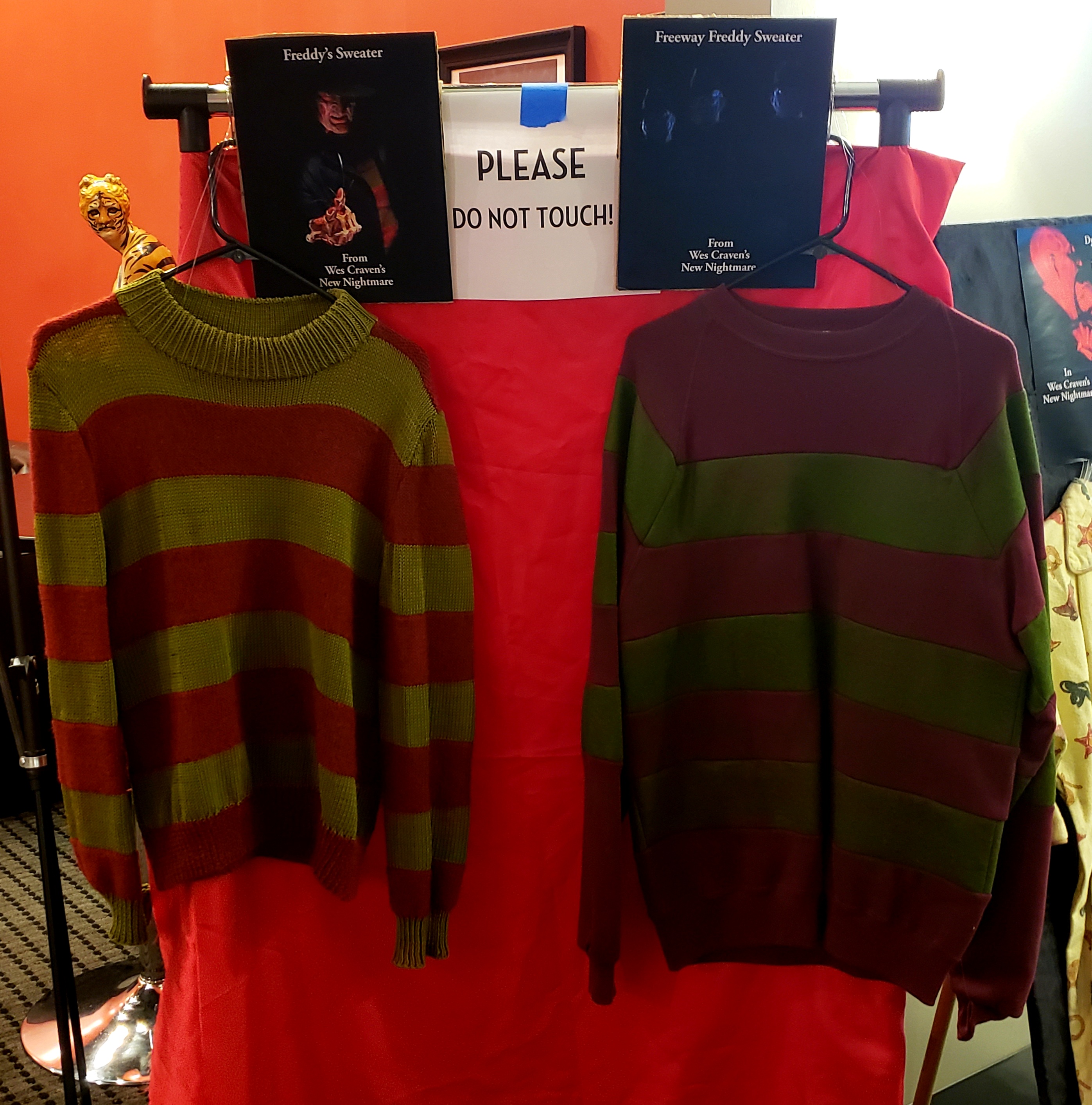 The tops on display were two different versions of the Freddy Krueger look; “Freddy’s Sweater”, a ribbed knit sweater with the trademark red and green stripes, and the “Freeway Freddy” sweater, which has a darker red and green color combination. The left version shows off its uniqueness in that is the only version seen in the ANOES series that is actually two sweaters in one, and one that has a higher necked collar than the other sweaters in parts 1-6. Upon scrutiny, it would appear that the wooly red stripes come from a different sweater and have been sewn onto the mock-necked pea-green sweater, giving the red stripes a thicker, leavened appearance against the ribbing of the sweater underneath. The “Freeway Freddy” sweater doesn’t seem to be a sweater at all. It has the look of a heavy cotton sweatshirt, or rather two sweatshirts, sewn together to create one, like the sweater on the left. To be honest, after recently re-watching New Nightmare, I wasn’t able to spot this particular top on Freddy in the freeway scene.