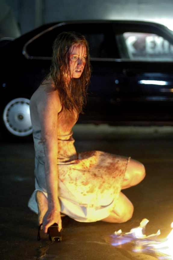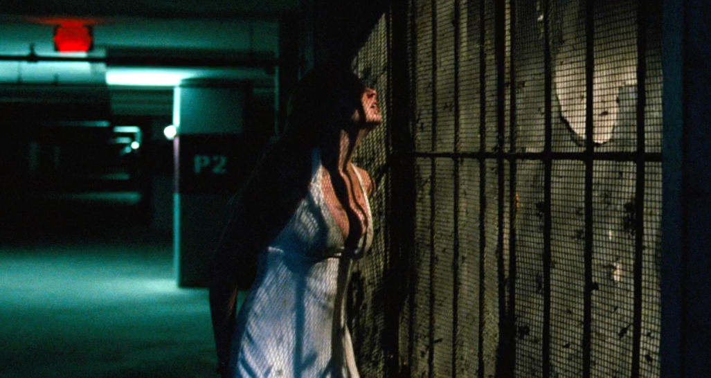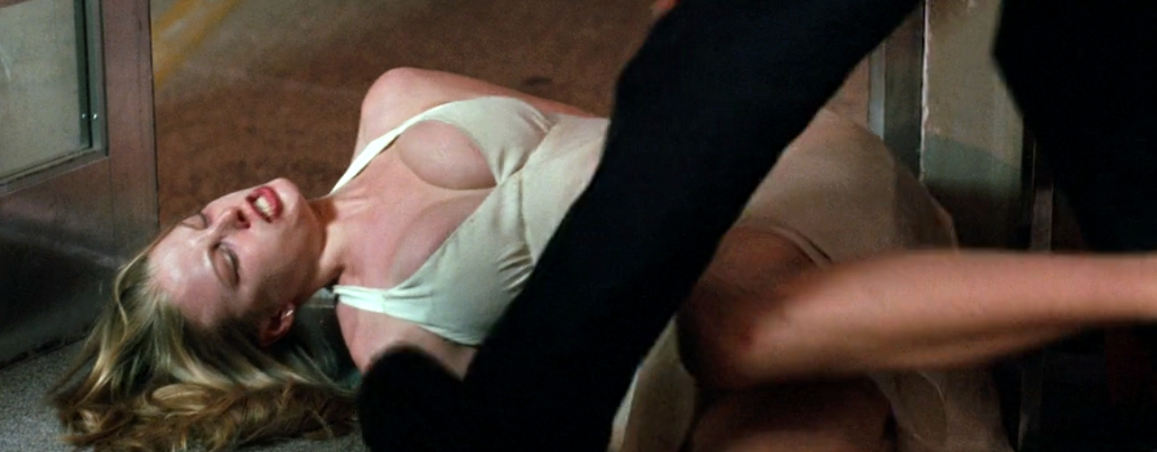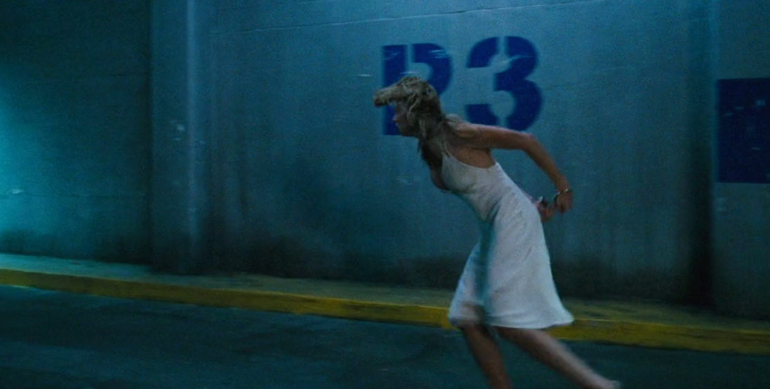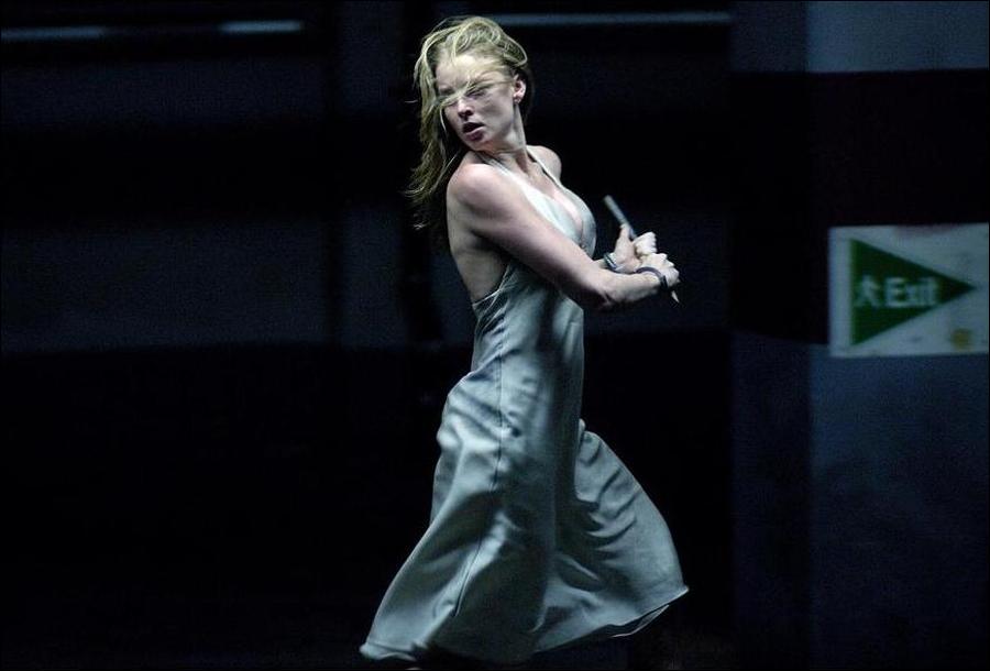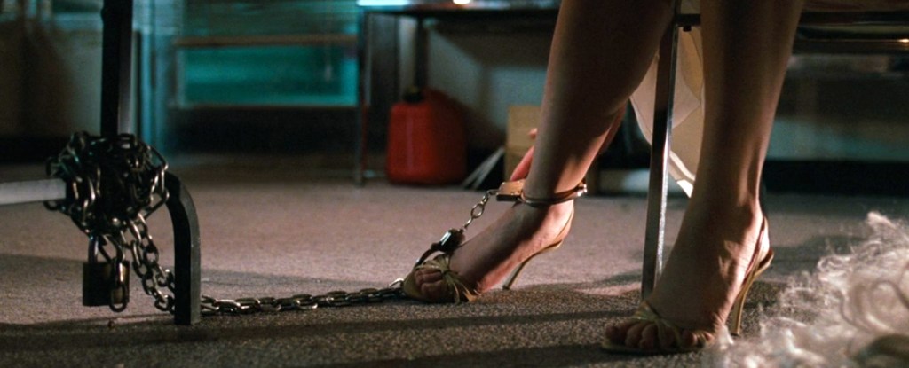 Her dinner attire is an ivory white backless halter neck moment in silk georgette, which later turns into a dingy, dirty, bloody mess. It’s a stand-out piece for one obvious reason; it showcases Angela’s impressive cleavage. Designed by Ruth Secord, the dress takes after Marilyn Monroe’s famous white frock from “The Seven Year Itch” with a much wider reveal of decolletage that seems to remain firmly in place, against all odds. As Angela battles her way through the rest of the film, it acts as a sort of super-dress from which her bosoms never escape. The fact that it doesn’t rip it to shreds by the end of the movie could be considered a Christmas miracle.