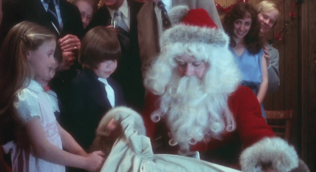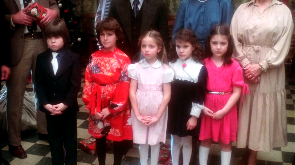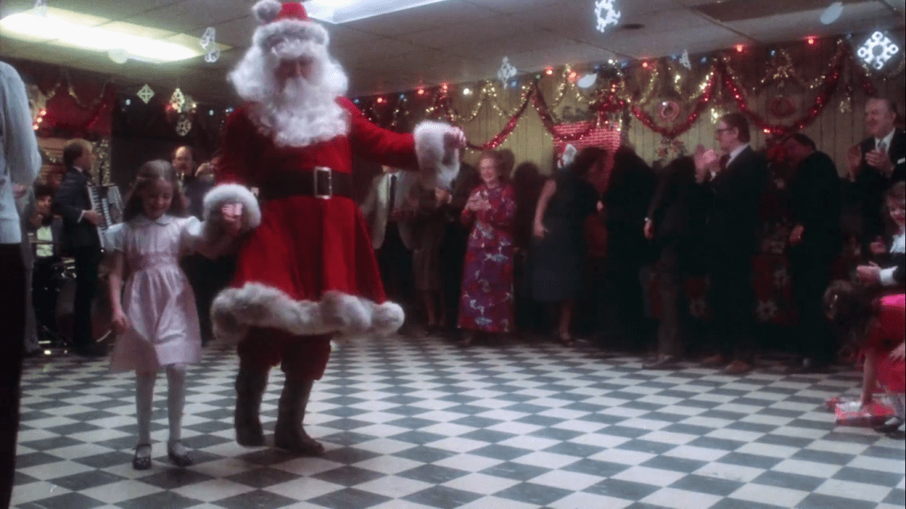 Murderous Santa impersonator Harry Stadling crashes a neighborhood Christmas party with his bag of stolen toys. Harry is merrily welcomed by the locals, including a group of children dressed in their holiday best. Though the lovely brunette in an ethereal lacey top who greets him with a hot beverage deserves a mention, this party fashion moment belongs to the younger partygoers; the boy in the black suit and white tie, the little lady in a red printed dress and black tights, the blonde in a cute pink and white peter pan collar dress, the brown curly-haired girl in a black velvet dress with a white lace bib collar and cuffs, and lastly, the young girl in a sweet tie-sleeve pink dress and gold belt.