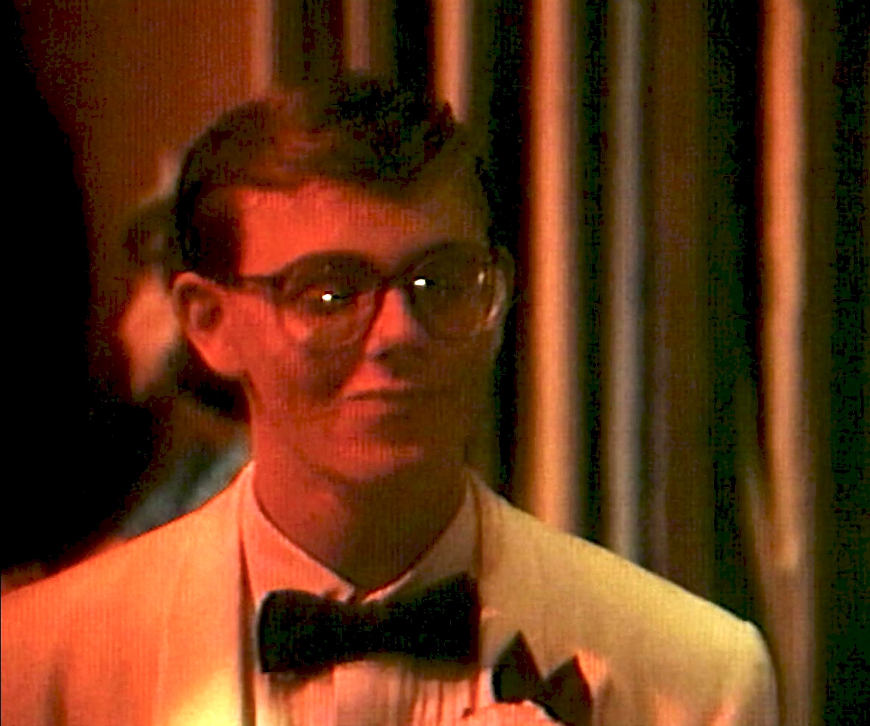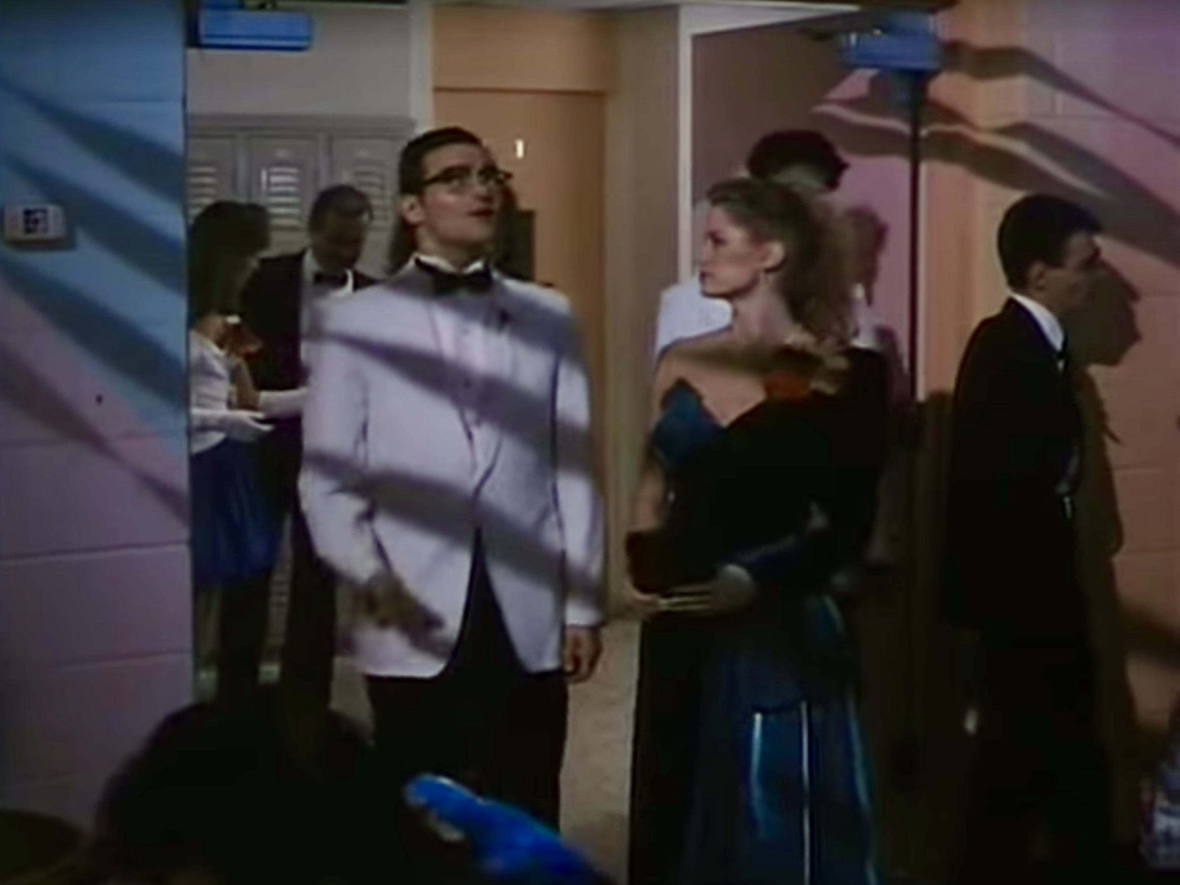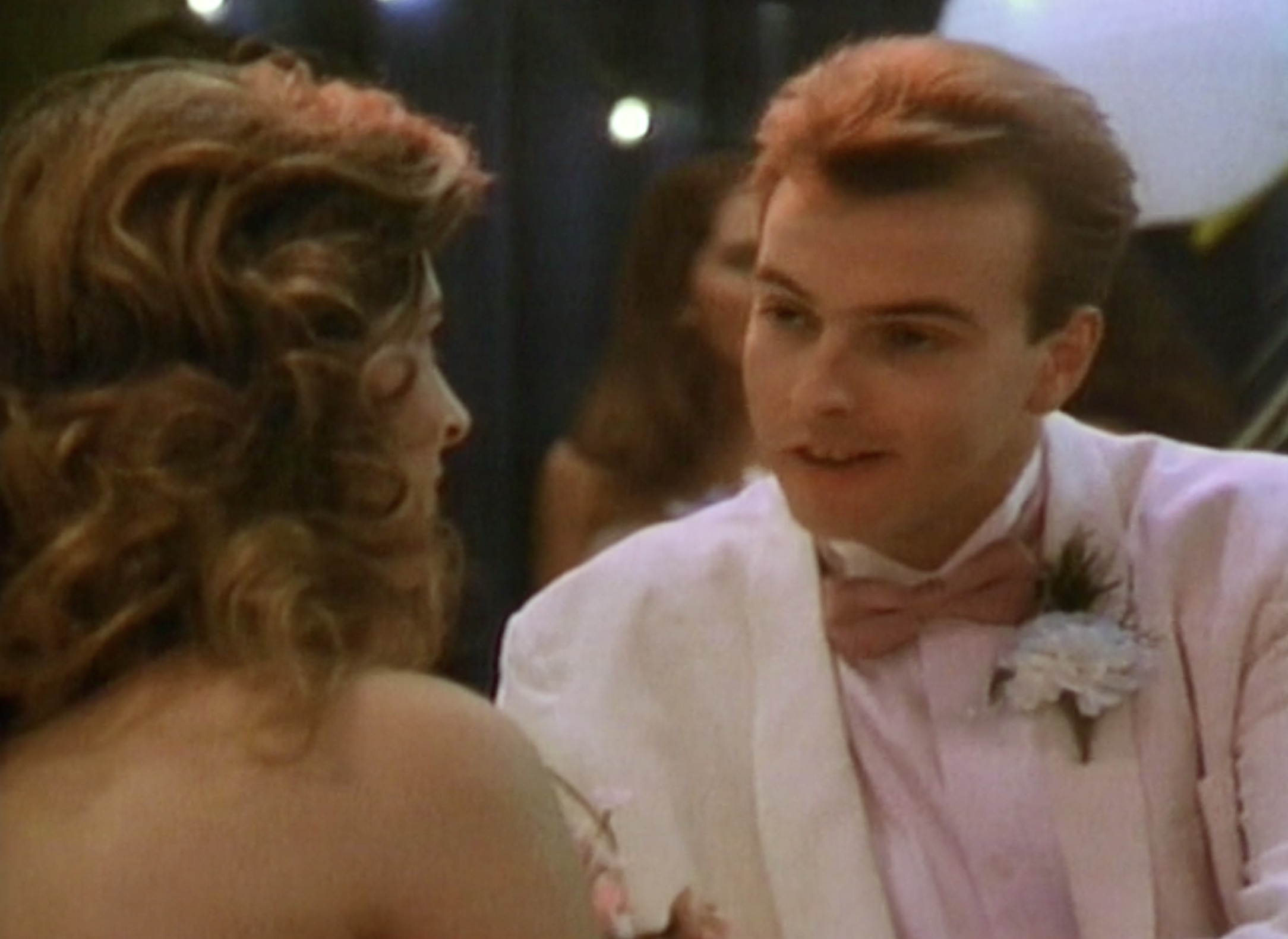 PROM NIGHT III girls wear statement styles while the boys wear standard formal attire. The scene is rife with white tuxedo jackets and bow ties. Sarah’s dweebish date, Leonard (Jeremy Ratchford), cuts up on the dance floor dressed in a white tux jacket & black bow tie. He is having a blast at prom until he has a run-in with Mary Lou, who binds him up and suffocates him with magnetic tape in the “Business Studies” room.