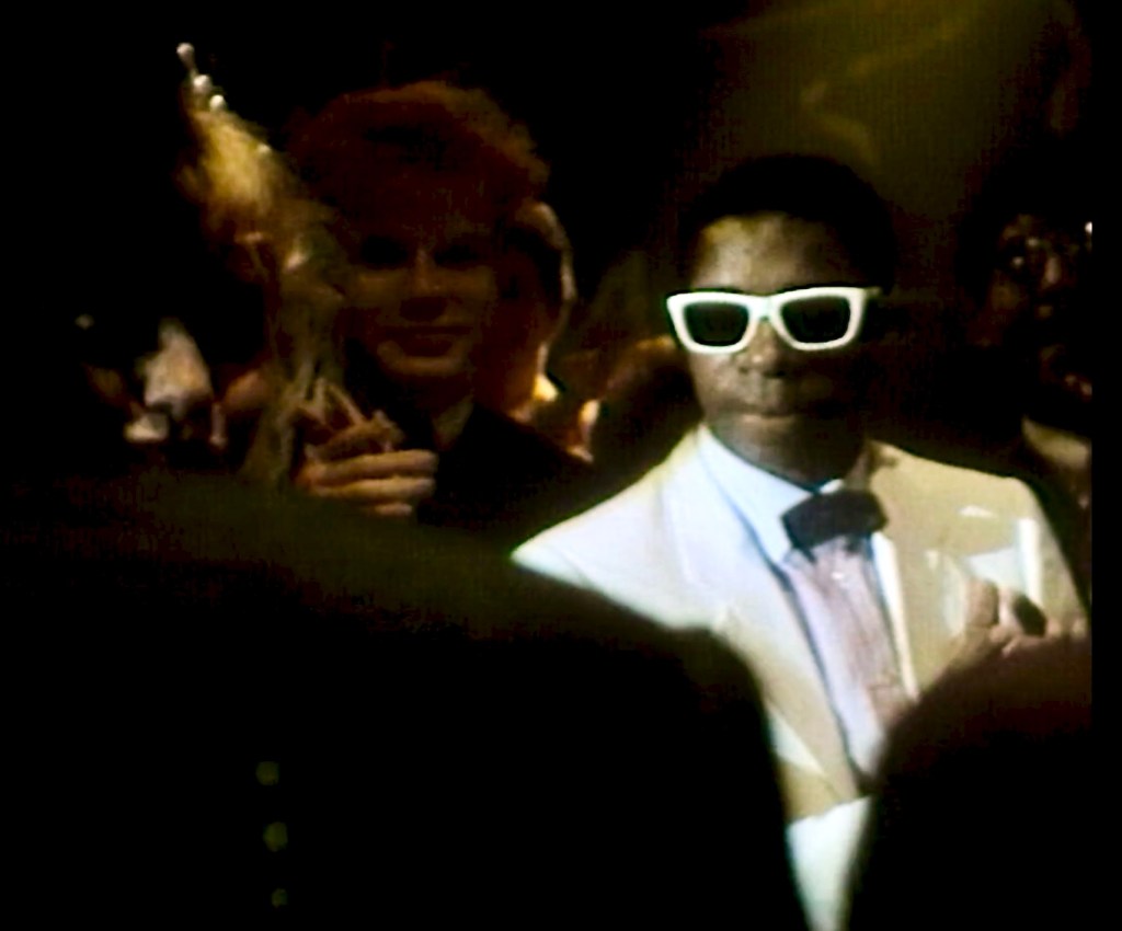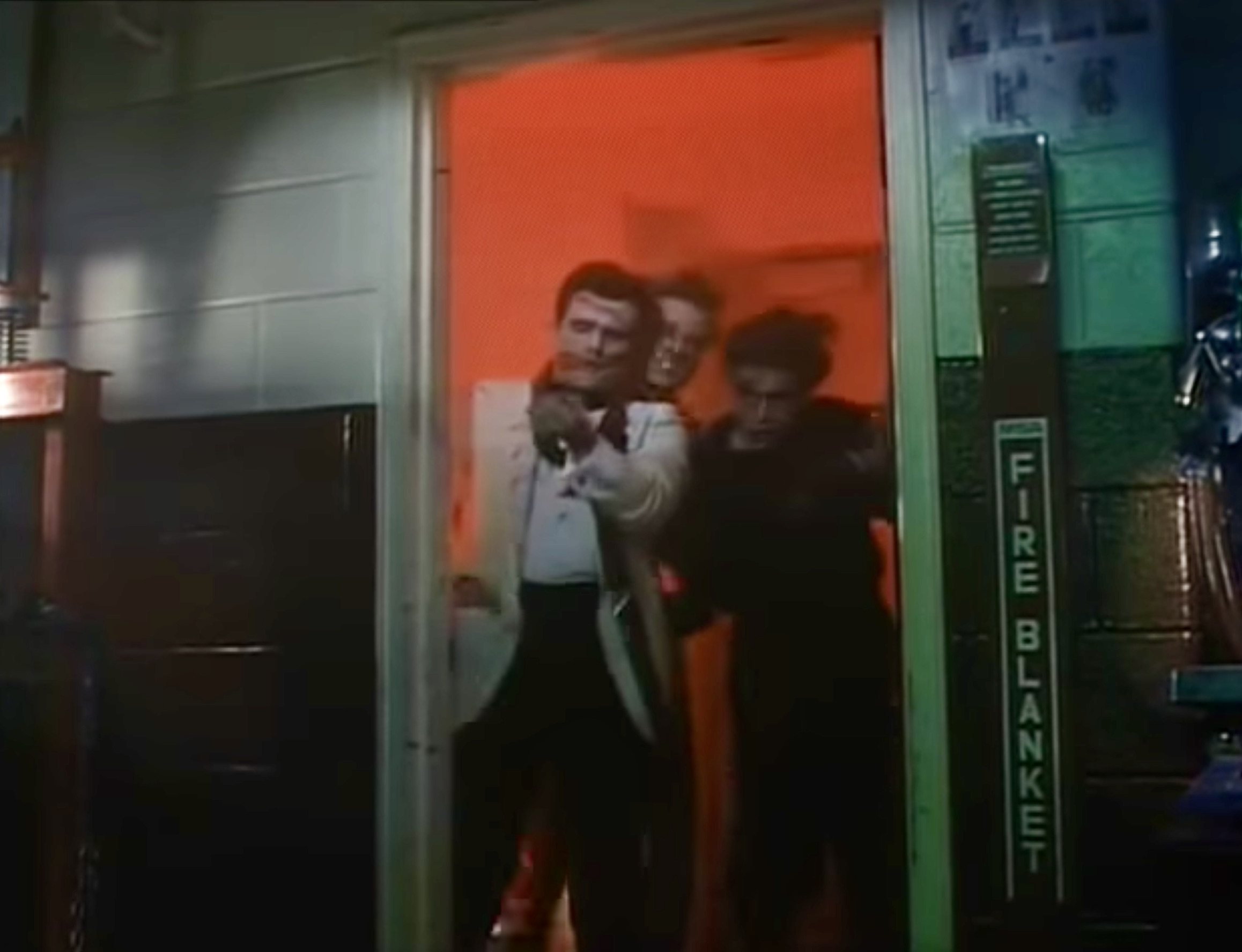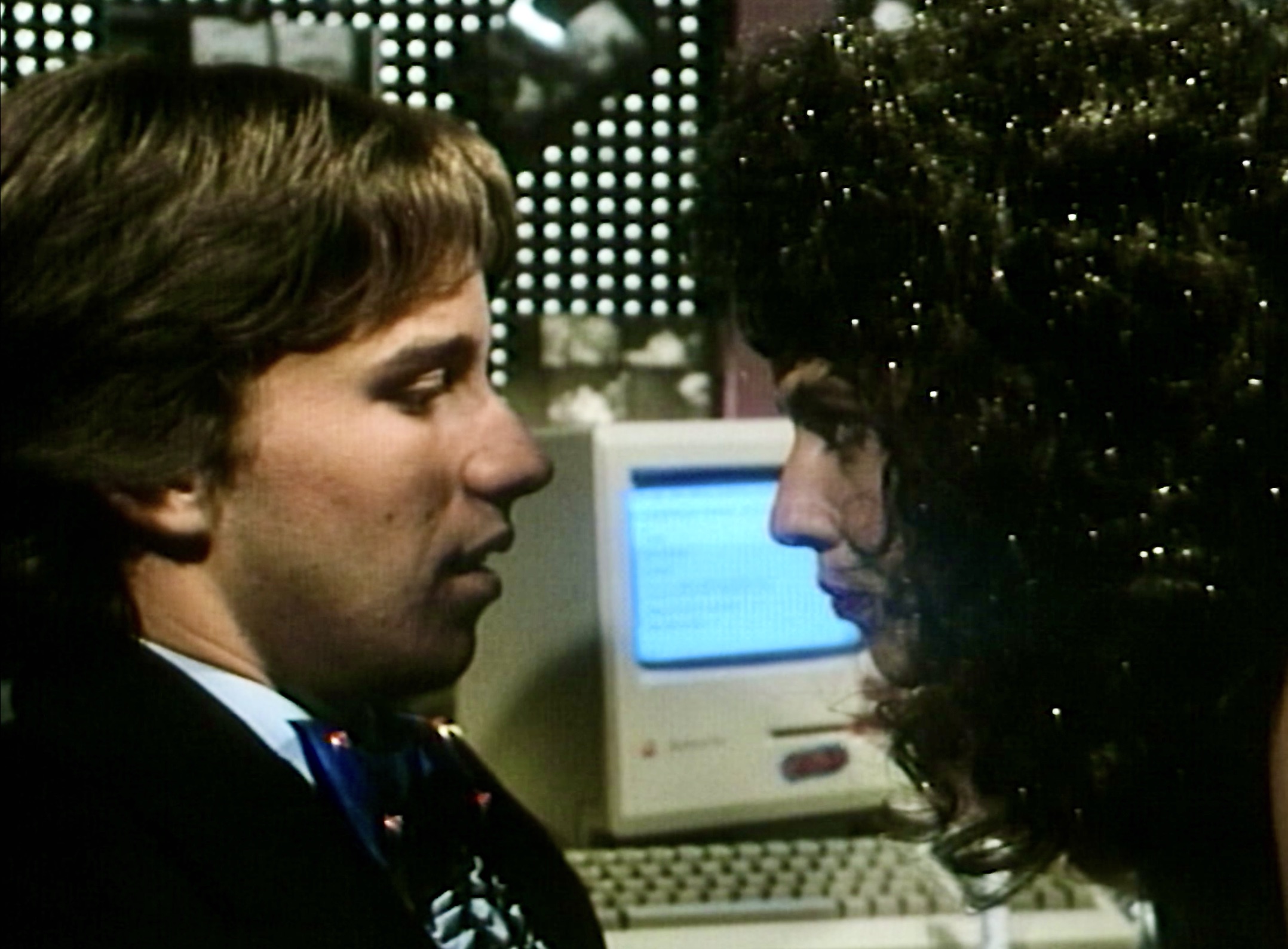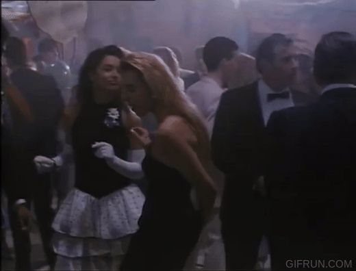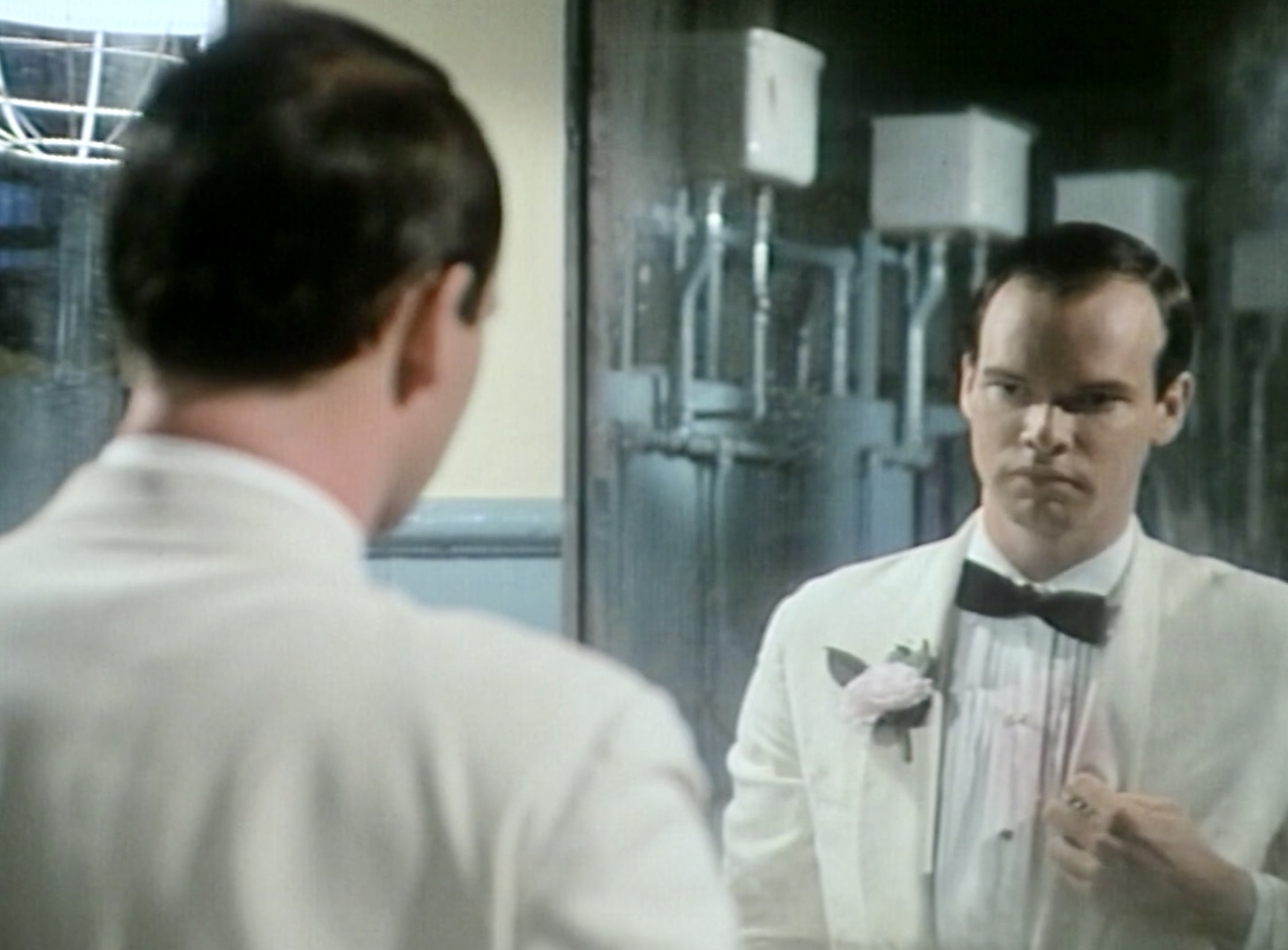 PROM NIGHT III girls wear statement styles while the boys wear standard formal attire. The scene is rife with white tuxedo jackets and bow ties. Sarah’s dweebish date, Leonard (Jeremy Ratchford), cuts up on the dance floor dressed in a white tux jacket & black bow tie. He is having a blast at prom until he has a run-in with Mary Lou, who binds him up and suffocates him with magnetic tape in the “Business Studies” room.