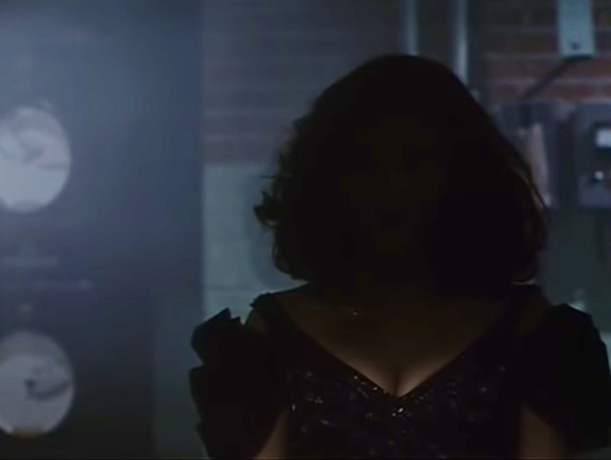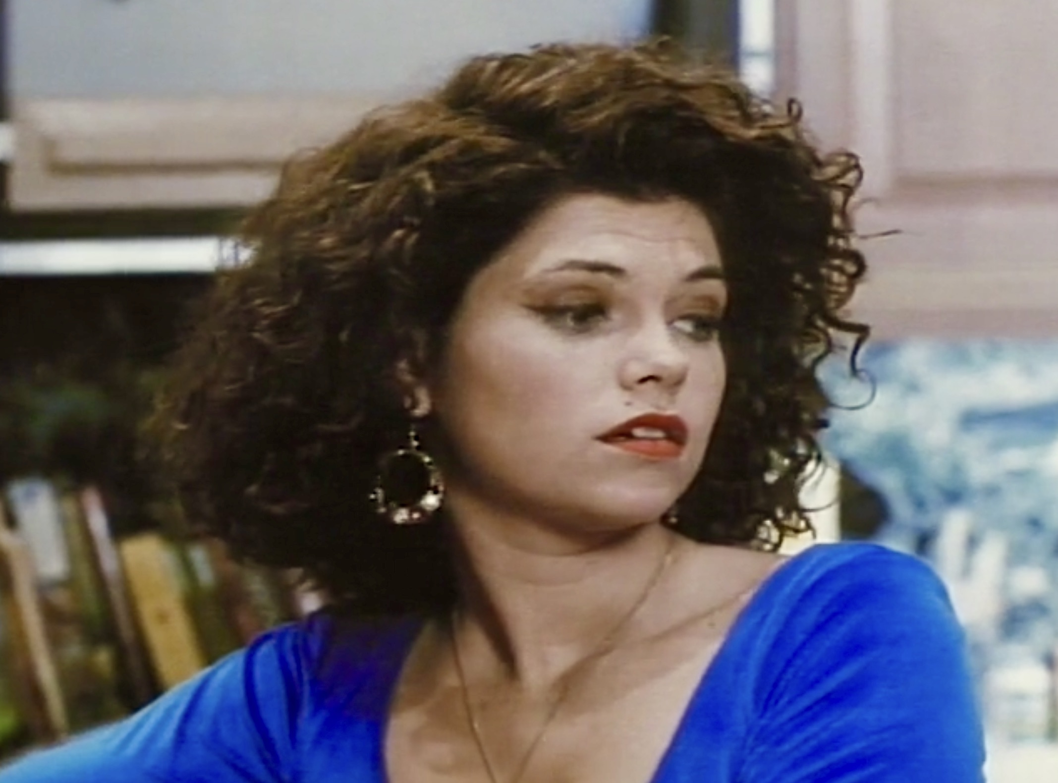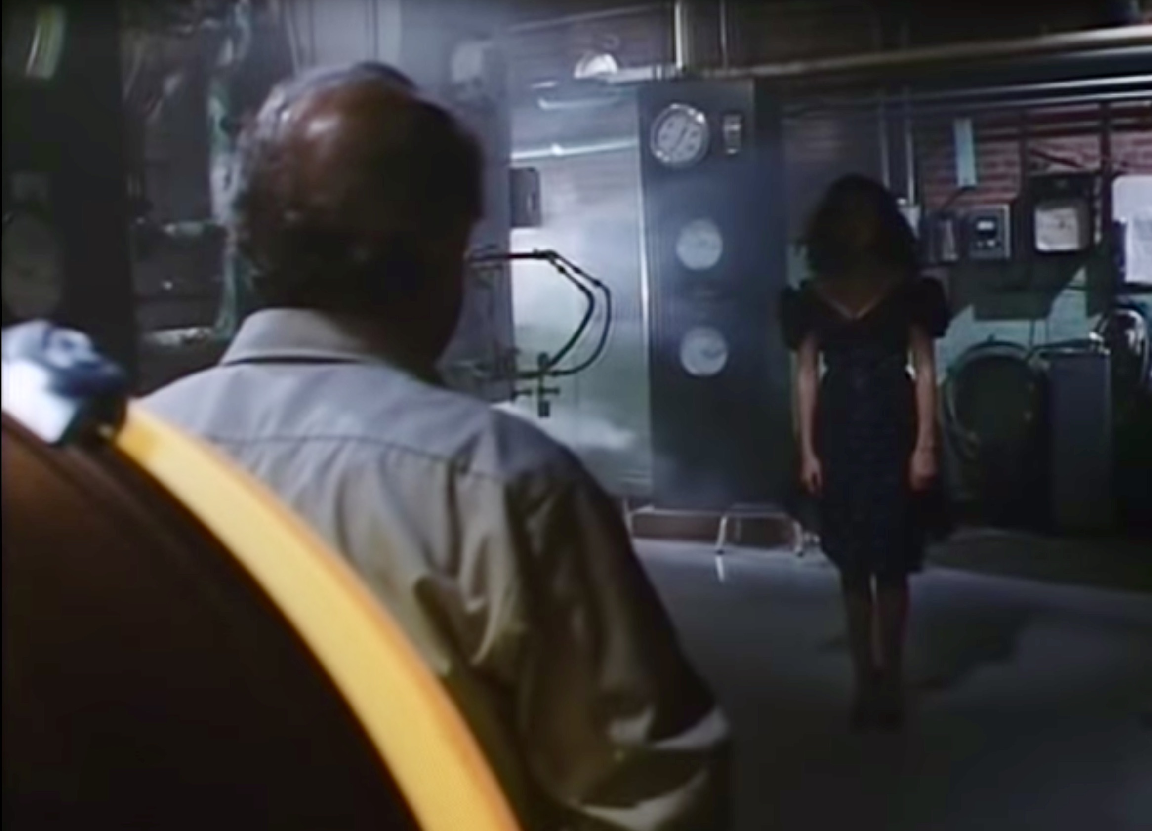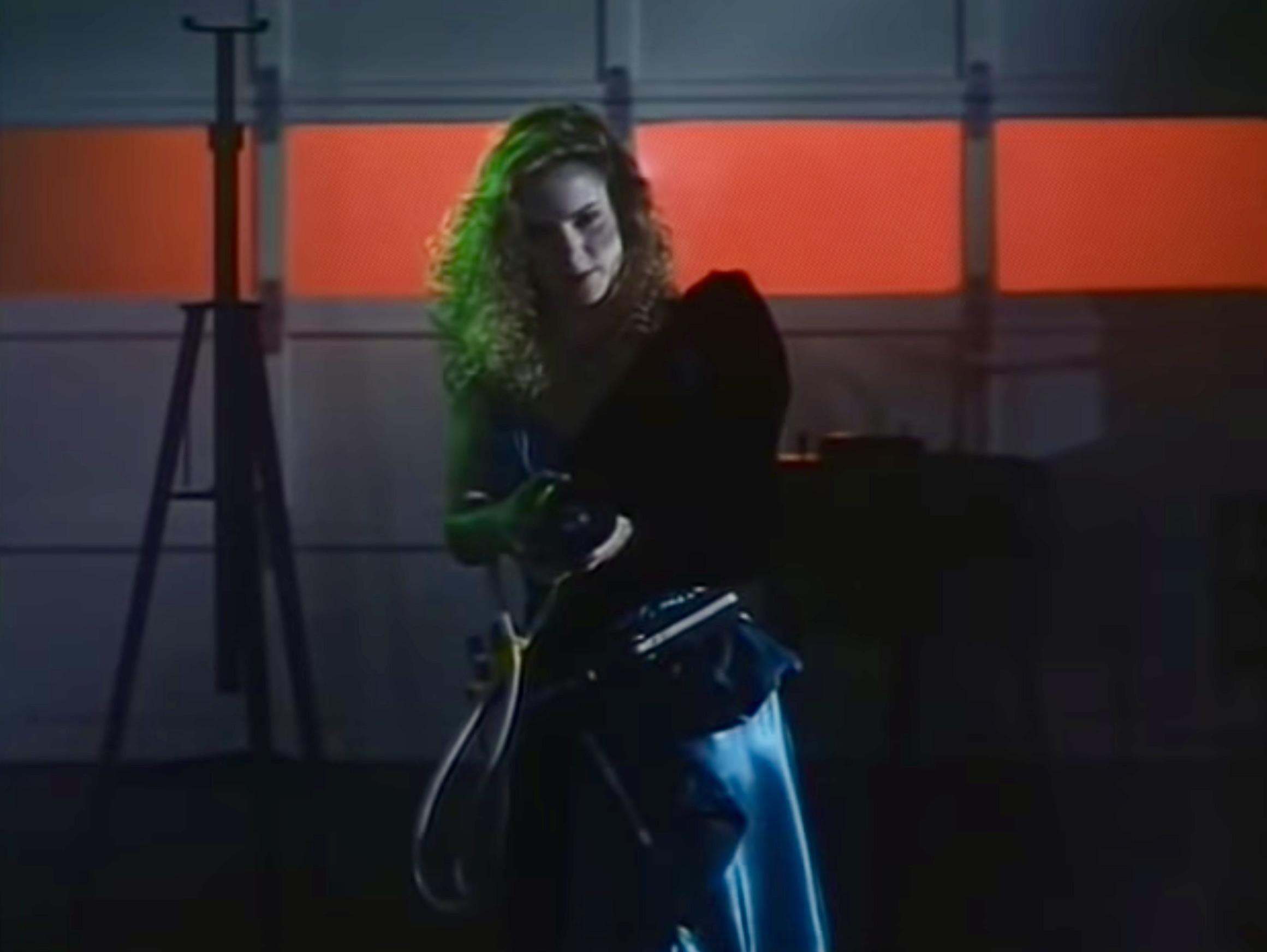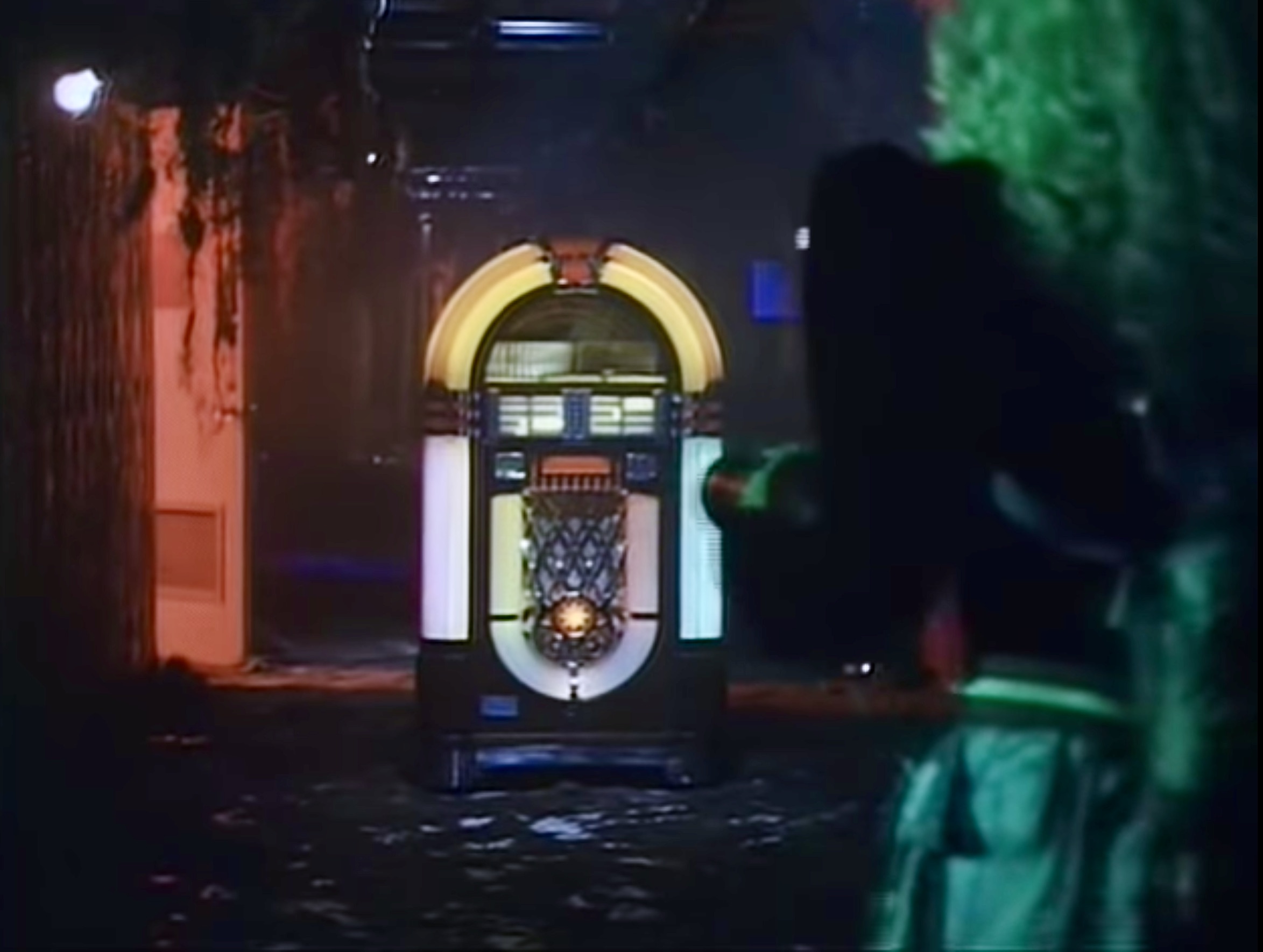 Sarah’s prom gown. Final Girl Sarah (Cynthia Preston) arrives at prom dressed in an interestingly constructed black and blue one-shoulder gown. It’s an oddly intriguing, overdesigned treasure of its time, featuring mixed textures in black velvet & teal satin. Half of the dress is satin with a strapless sweetheart bodice embellished with folds. A satin skirt continues below the waistline on the opposite side and has satin folds over the maxi skirt that flows to the back into a sweep train. The other half of the dress consists of avelvet body, including a long puff sleeve. This velvet body drapes across the bodice and falls into a long skirt on the opposite side. It’s a busy dress for sure, but she looks like a badass when she adds a flame thrower to the mix. It just works. Running around in Hell, she torches various foes, including her former date Leonard, now a zombie (and still wrapped in tape), plus a malevolent jukebox that shoots lethal metal projectiles, all while wearing her glamorous Jekyll and Hyde-inspired gown.