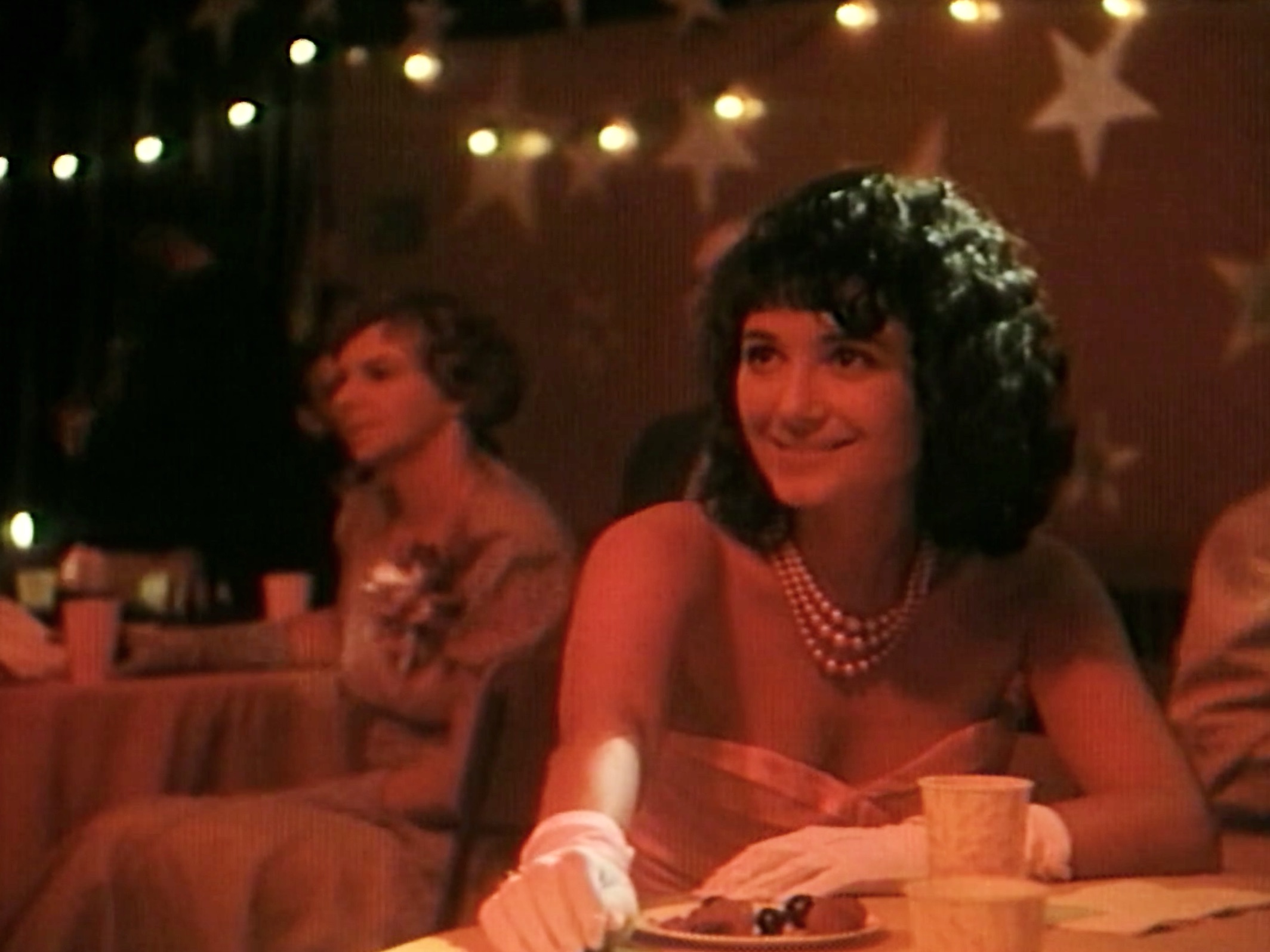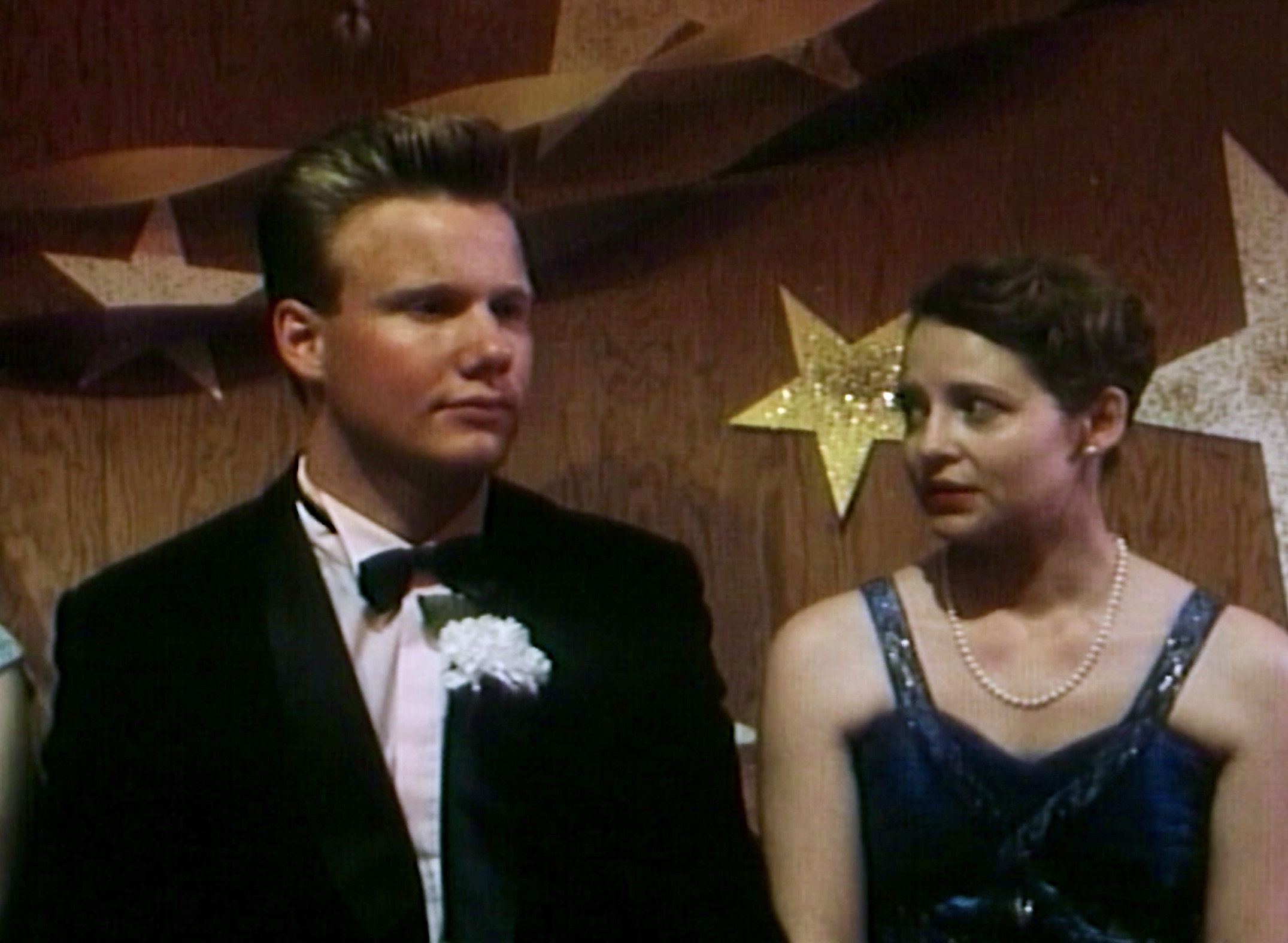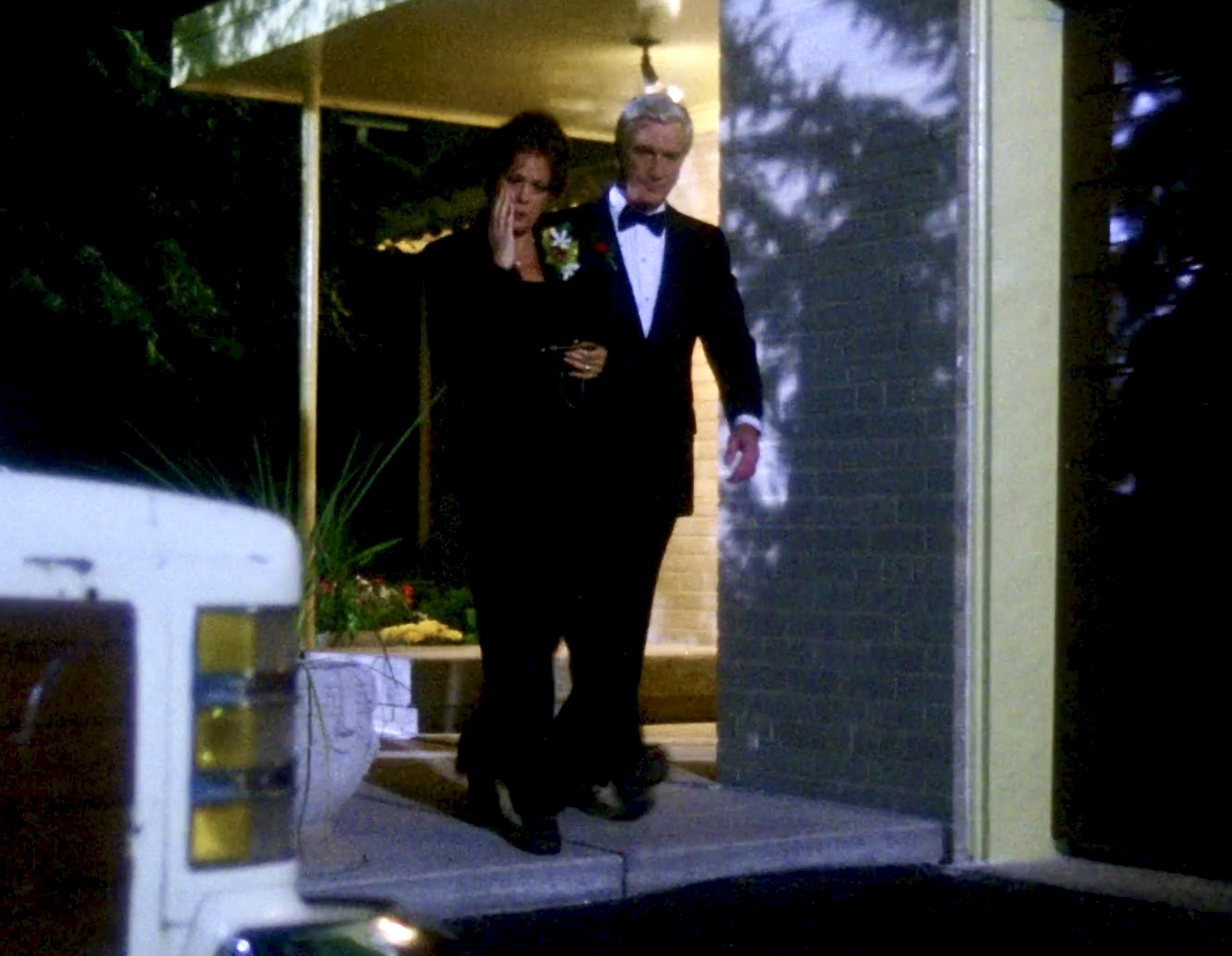 Lisa (Krista Bulmer) and Brad (Phil Morrison) are the two promgoers killed in their formal attire while making out in a car. Her lilac strapless gown and his white tux jacket & pink shirt, bow tie, and blue carnation flower pin are all splattered with blood.