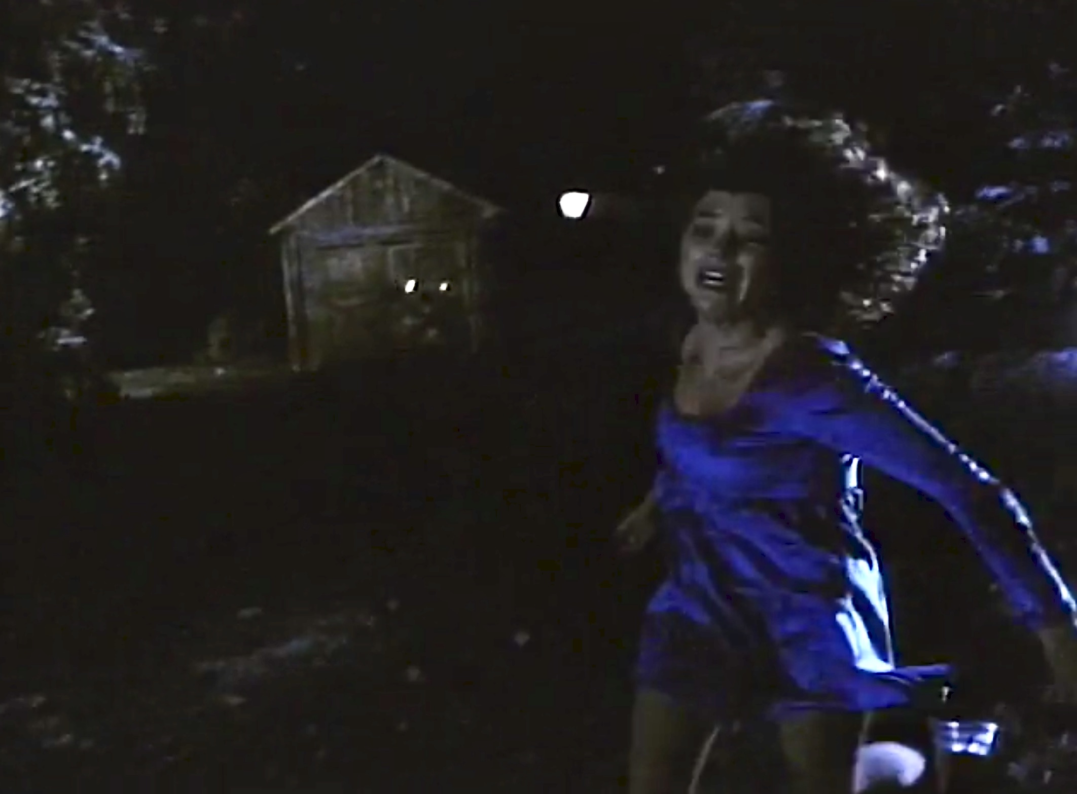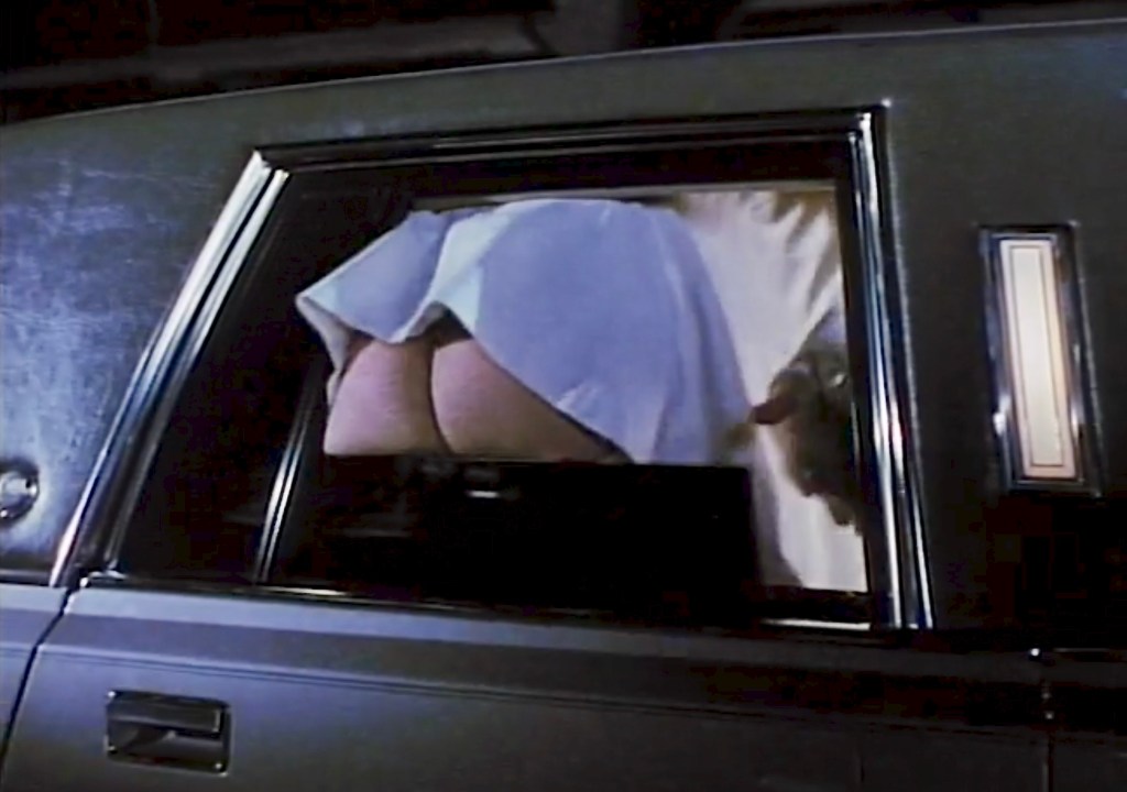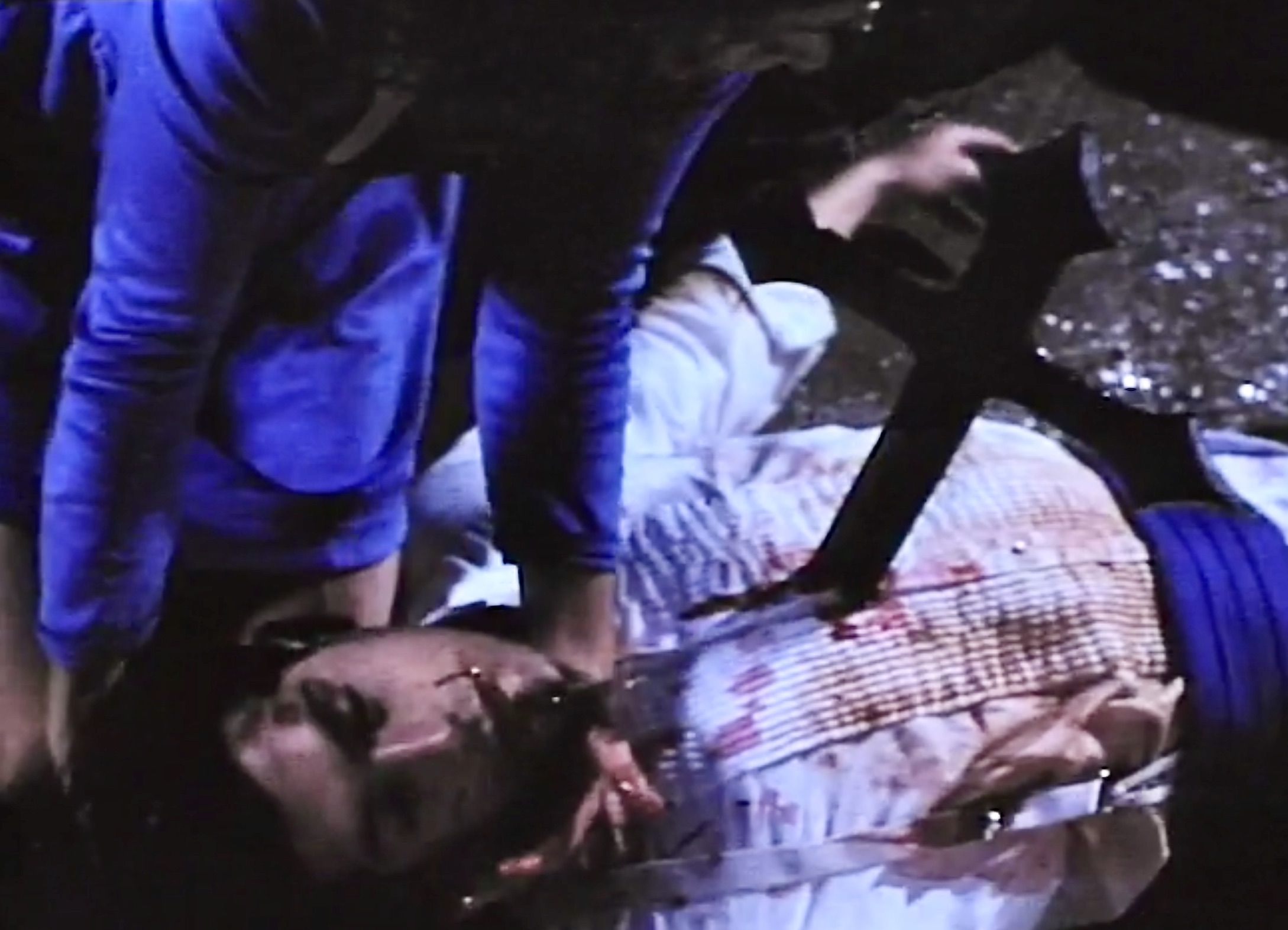 Lisa (Krista Bulmer) and Brad (Phil Morrison) are the two promgoers killed in their formal attire while making out in a car. Her lilac strapless gown and his white tux jacket & pink shirt, bow tie, and blue carnation flower pin are all splattered with blood.