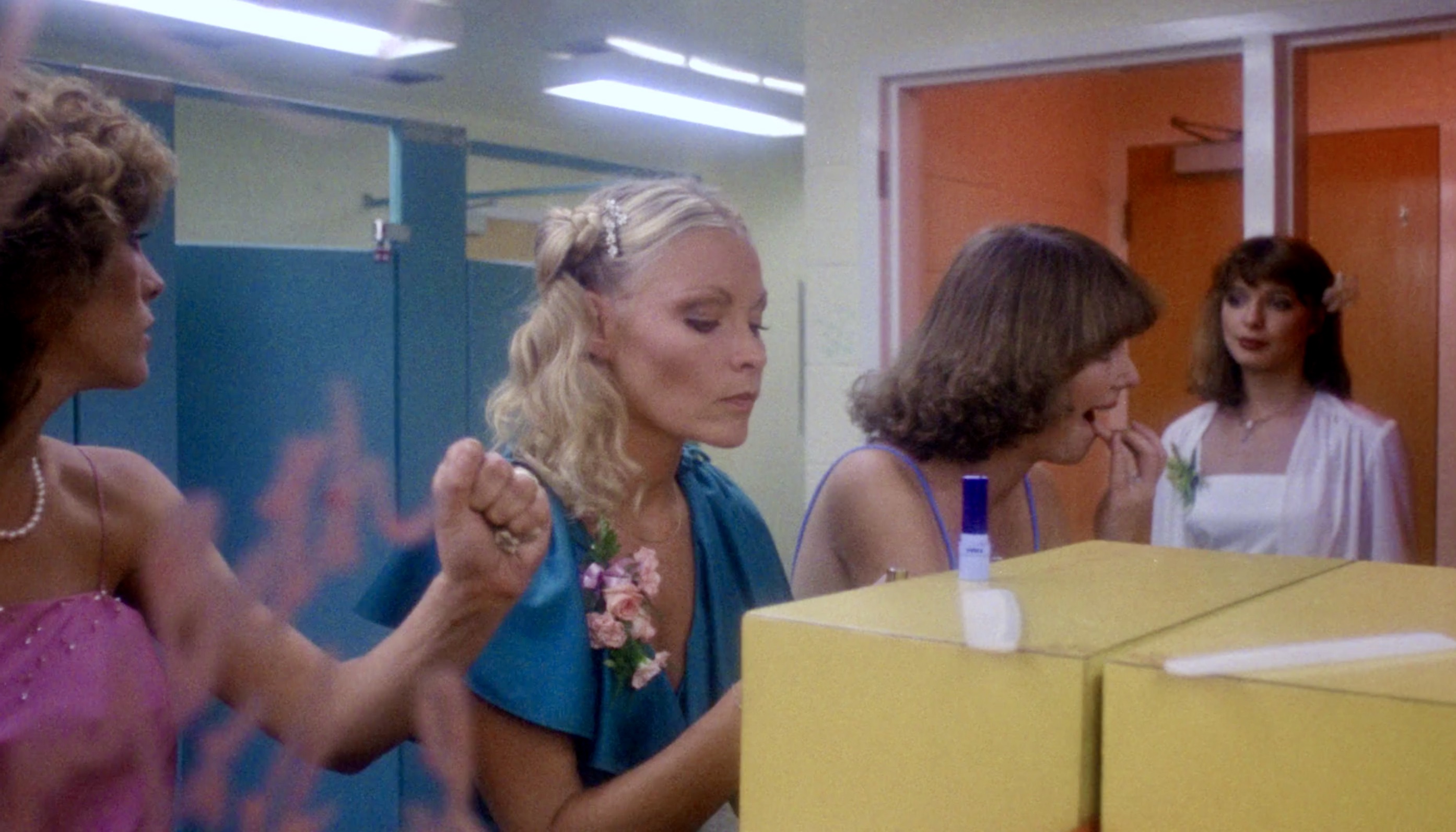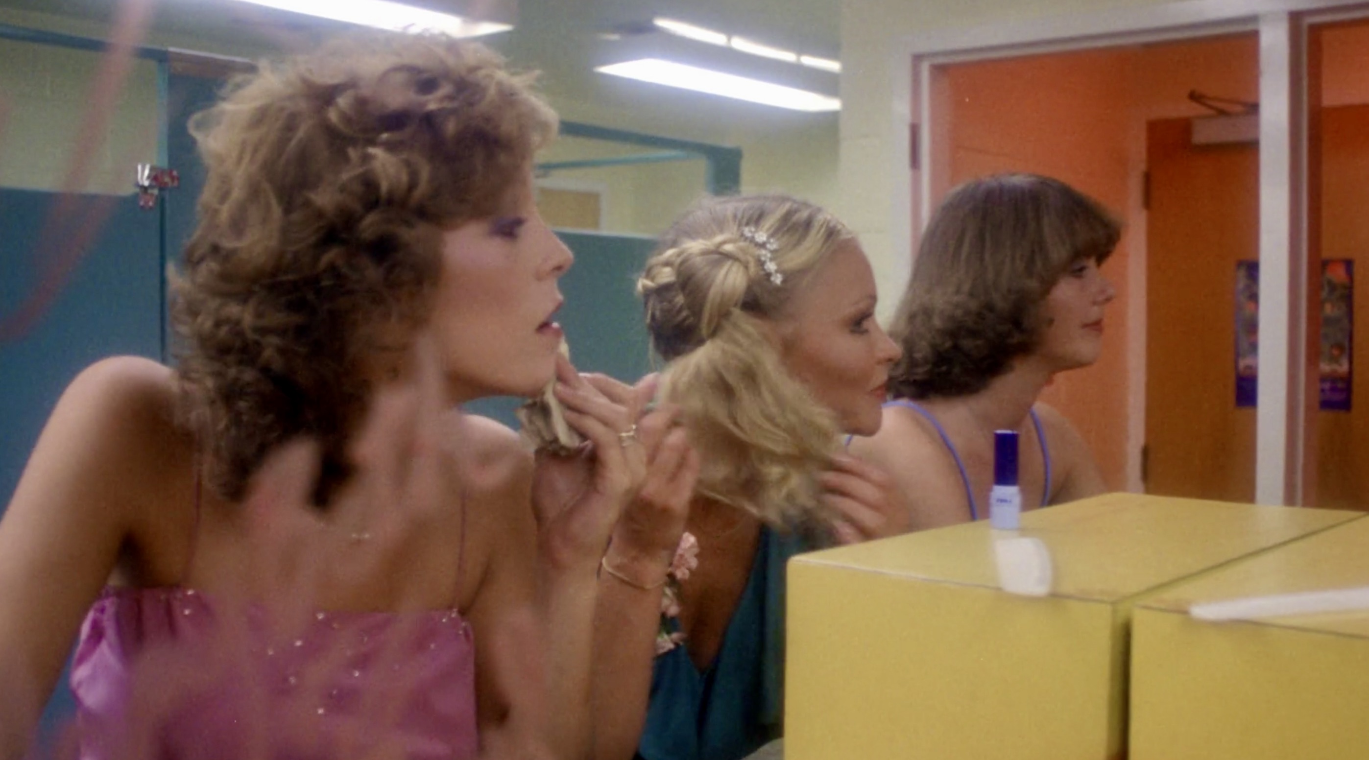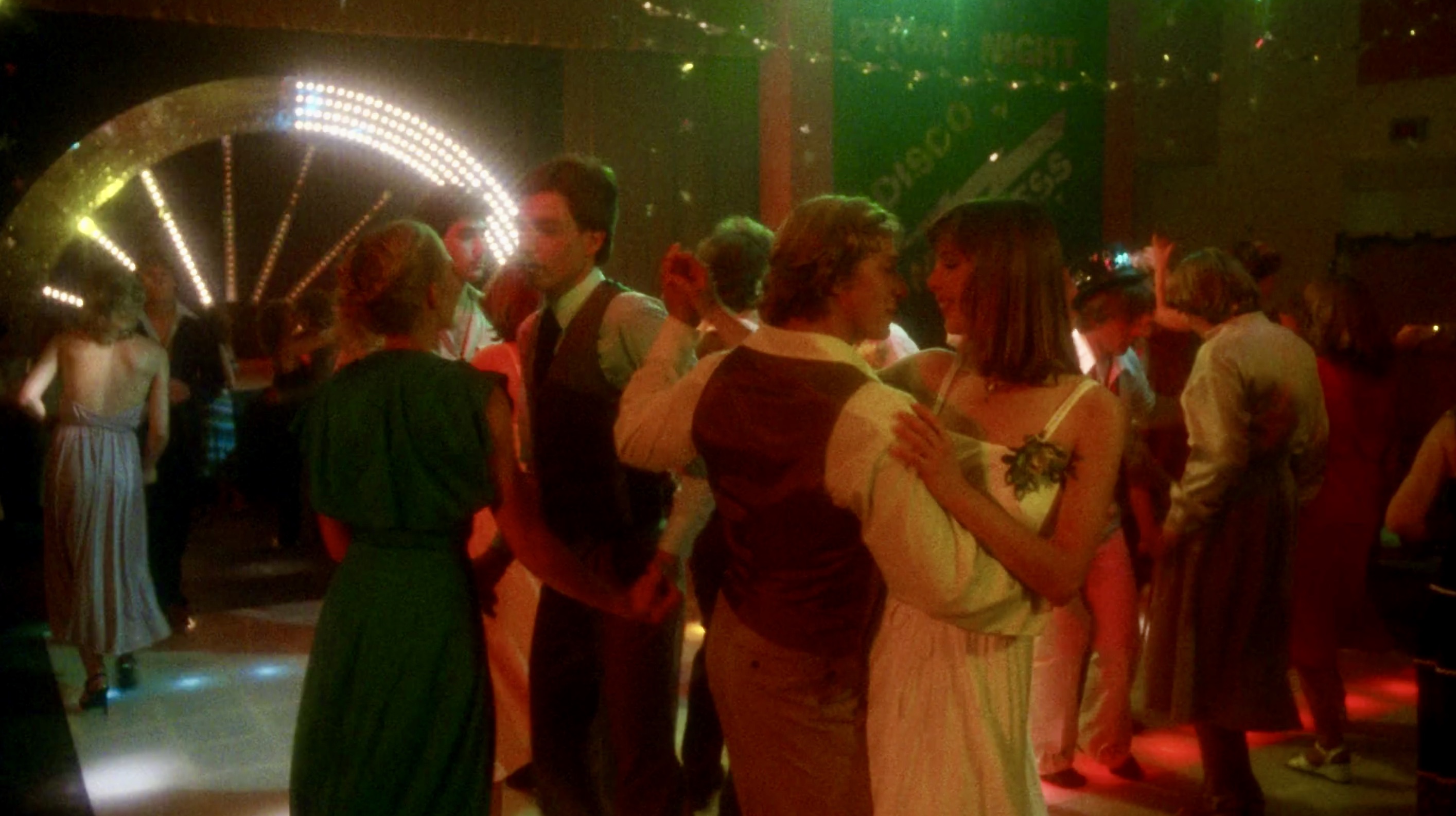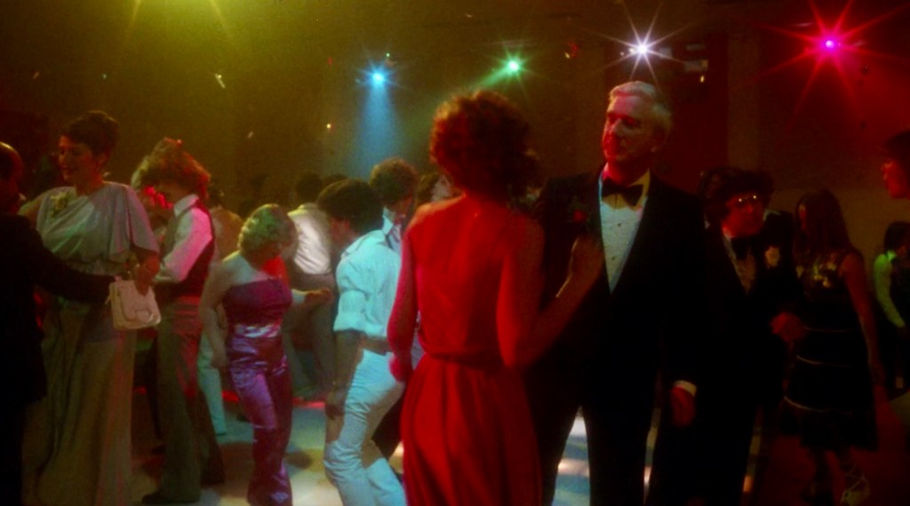 Some might call the original PROM NIGHT boring, but I think there’s much to love about it, the “Disco Madness” prom theme, in particular. The dance takes place at the beginning of the 1980s, just as the disco era ends. Satin and polyester dominate in the form of clingy gowns and three-piece suits. Everyone wears a corsage or boutonniere, even the police assigned to security. This attention to detail makes me appreciate this film so much. Everyone looks like they’re having a good time (until they’re not). There’s even a dance sequence featuring Kim (Jamie Lee Curtis) and her boyfriend, Nick (Casey Stevens).