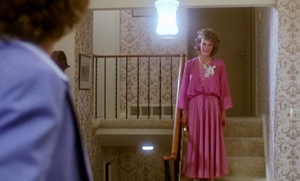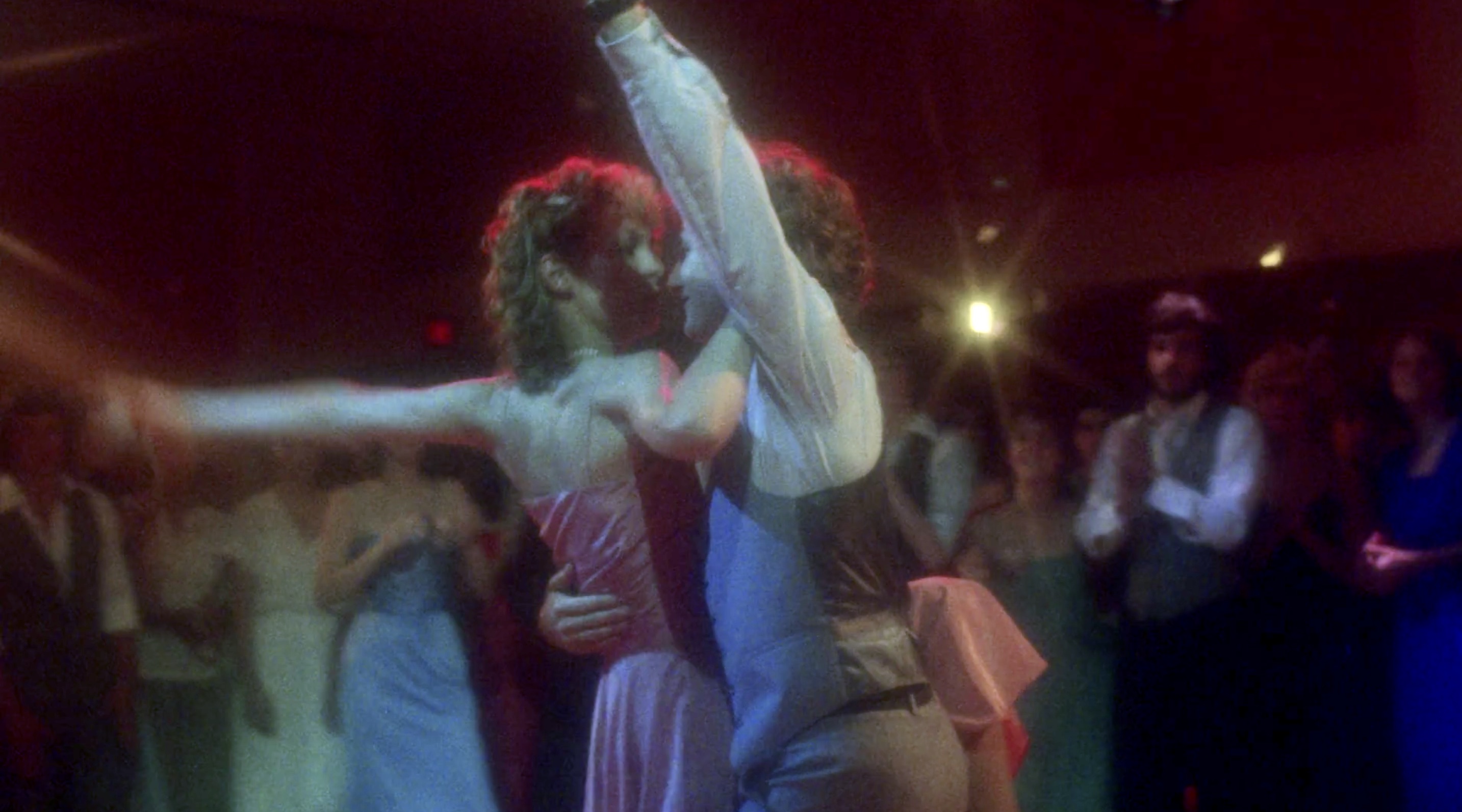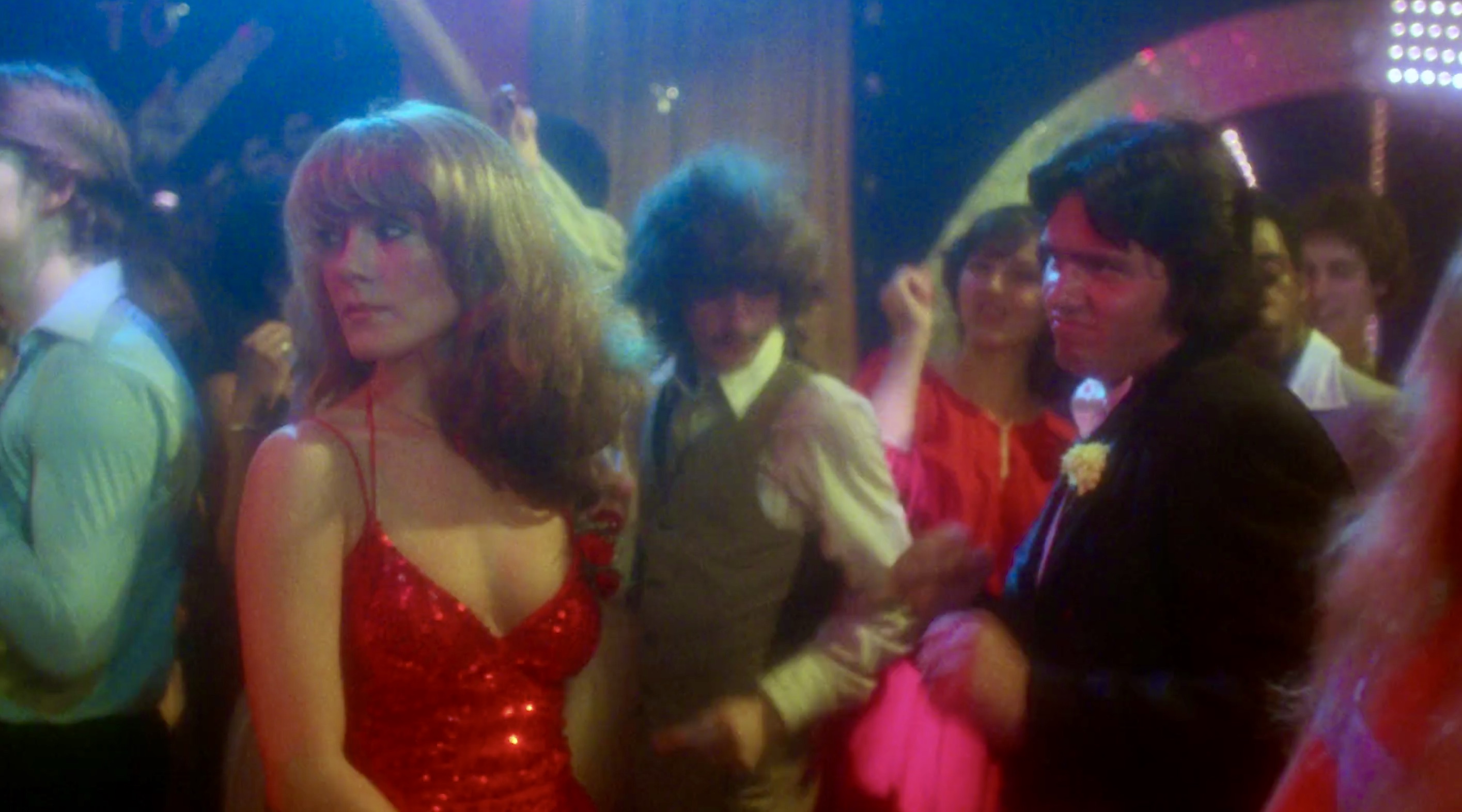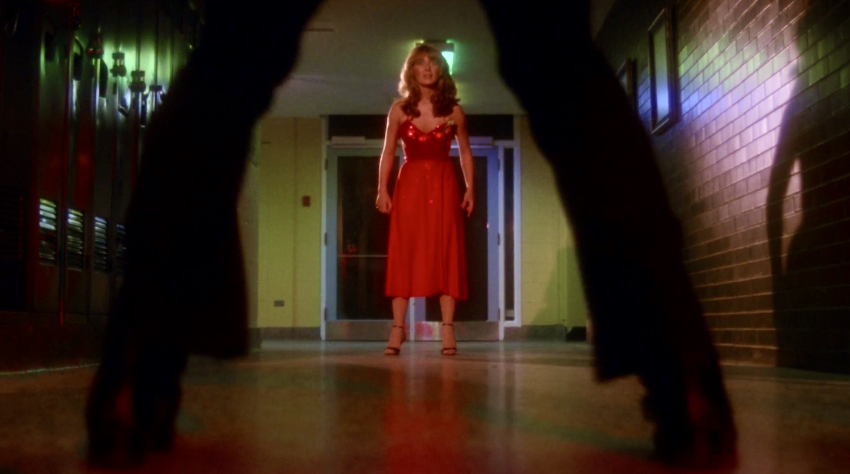 Some might call the original PROM NIGHT boring, but I think there’s much to love about it, the “Disco Madness” prom theme, in particular. The dance takes place at the beginning of the 1980s, just as the disco era ends. Satin and polyester dominate in the form of clingy gowns and three-piece suits. Everyone wears a corsage or boutonniere, even the police assigned to security. This attention to detail makes me appreciate this film so much. Everyone looks like they’re having a good time (until they’re not). There’s even a dance sequence featuring Kim (Jamie Lee Curtis) and her boyfriend, Nick (Casey Stevens).