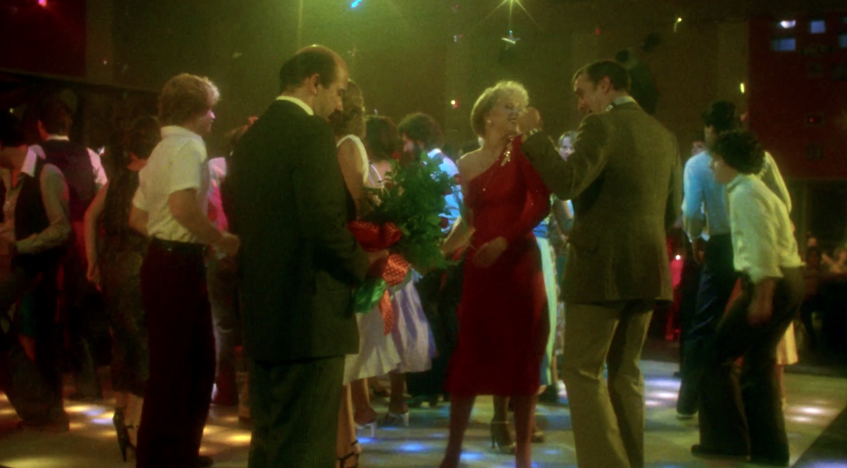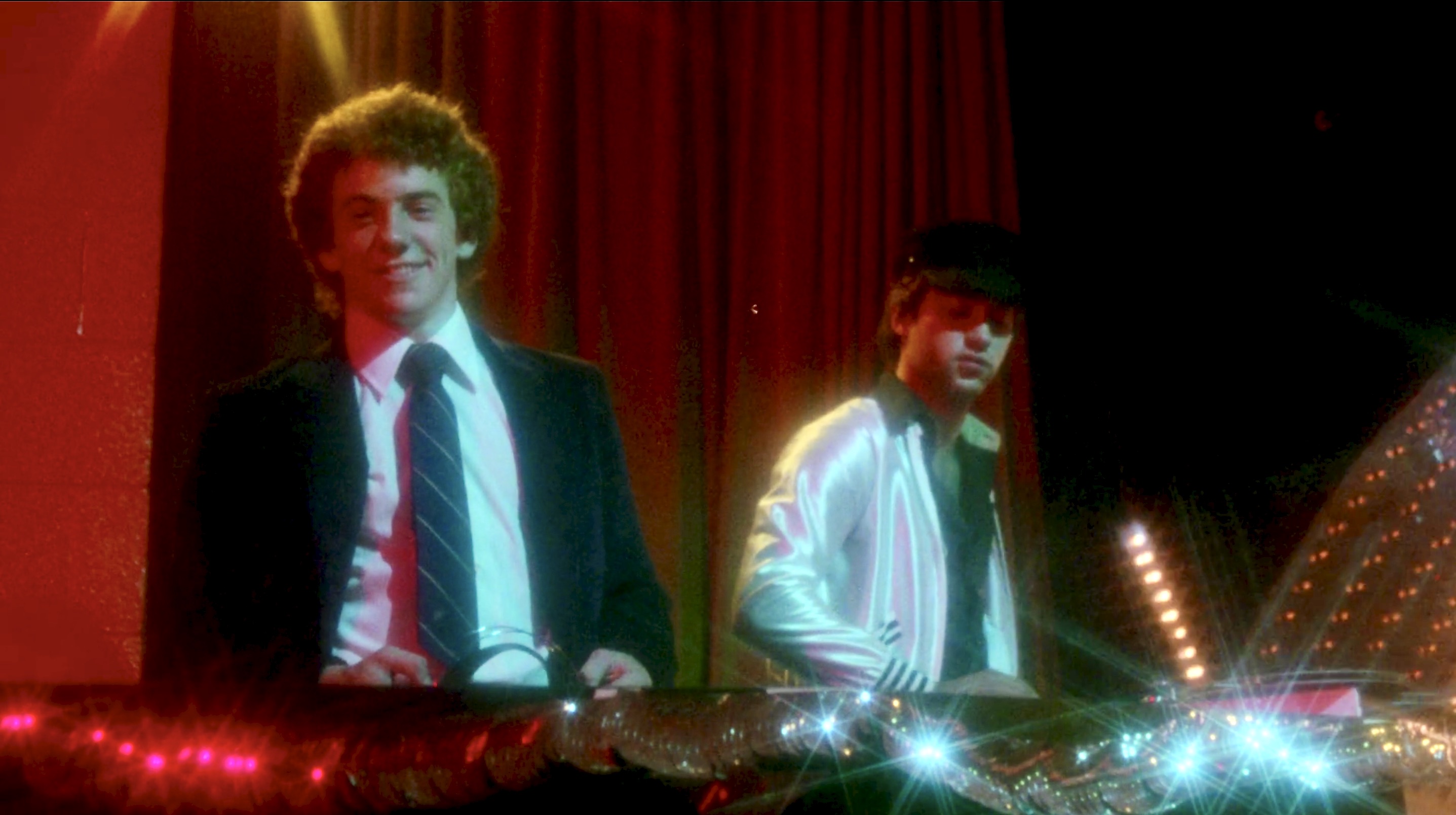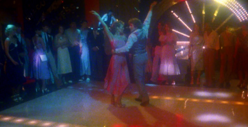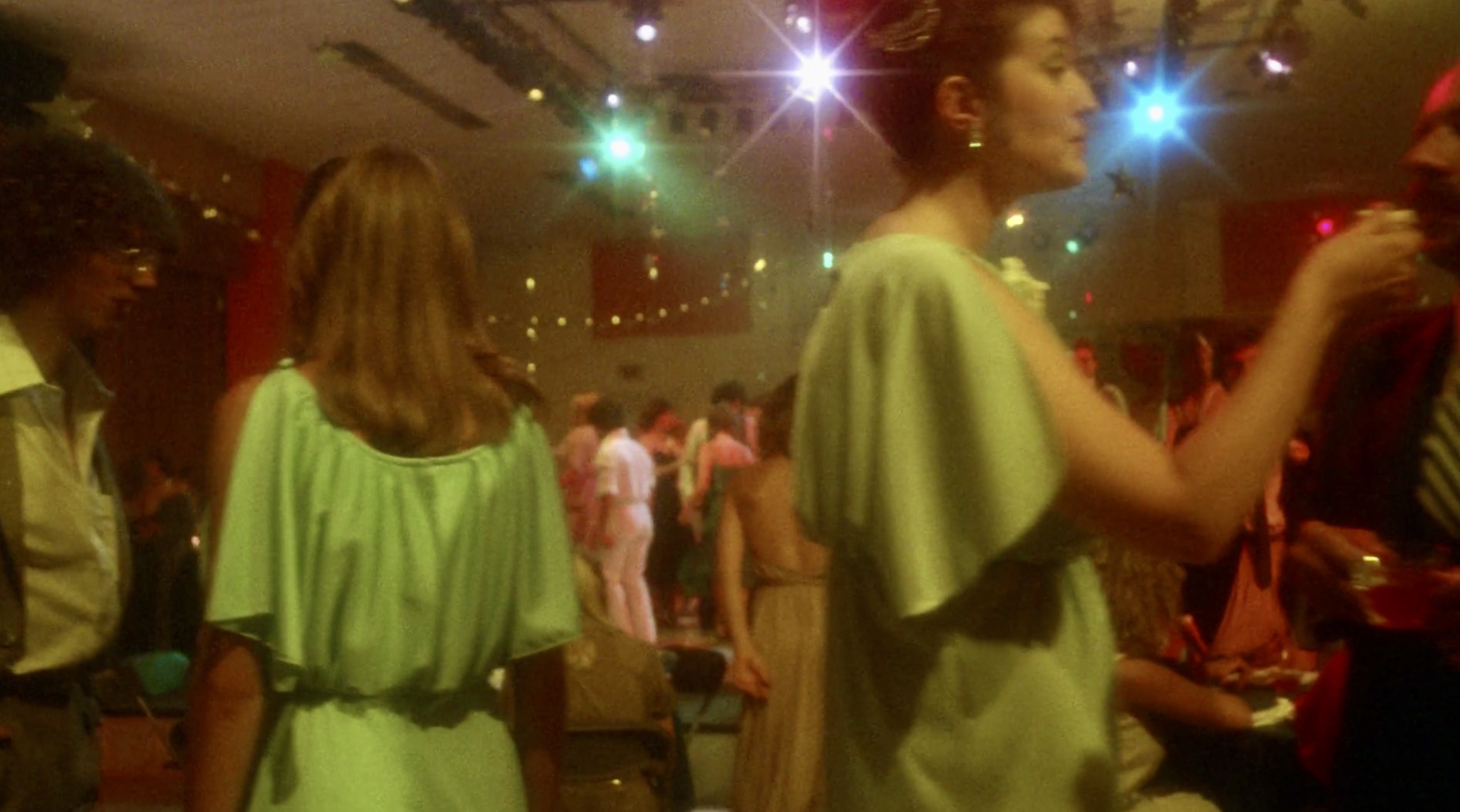 Some might call the original PROM NIGHT boring, but I think there’s much to love about it, the “Disco Madness” prom theme, in particular. The dance takes place at the beginning of the 1980s, just as the disco era ends. Satin and polyester dominate in the form of clingy gowns and three-piece suits. Everyone wears a corsage or boutonniere, even the police assigned to security. This attention to detail makes me appreciate this film so much. Everyone looks like they’re having a good time (until they’re not). There’s even a dance sequence featuring Kim (Jamie Lee Curtis) and her boyfriend, Nick (Casey Stevens).