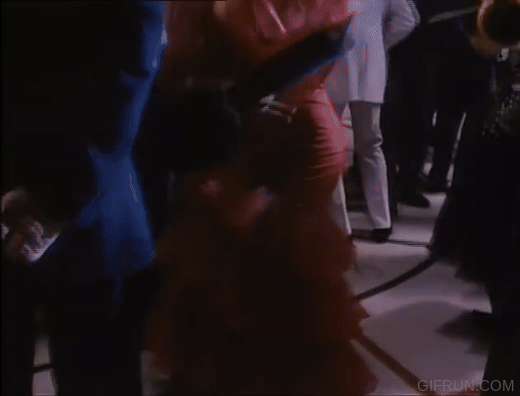Kim and her friends’ disco style: OK, I confess, I don’t find Kim’s gown exciting. Though it is a pleasing shade of pink and she looks fantastic dancing it up in her big scene. A smattering of sparkling rhinestones embellish the jacket neckline and the dress underneath. The dress design features spaghetti straps, a gathered waist, and an A-line skirt. She accessorizes with pearls & a white corsage. It’s a pretty look, but nothing special.