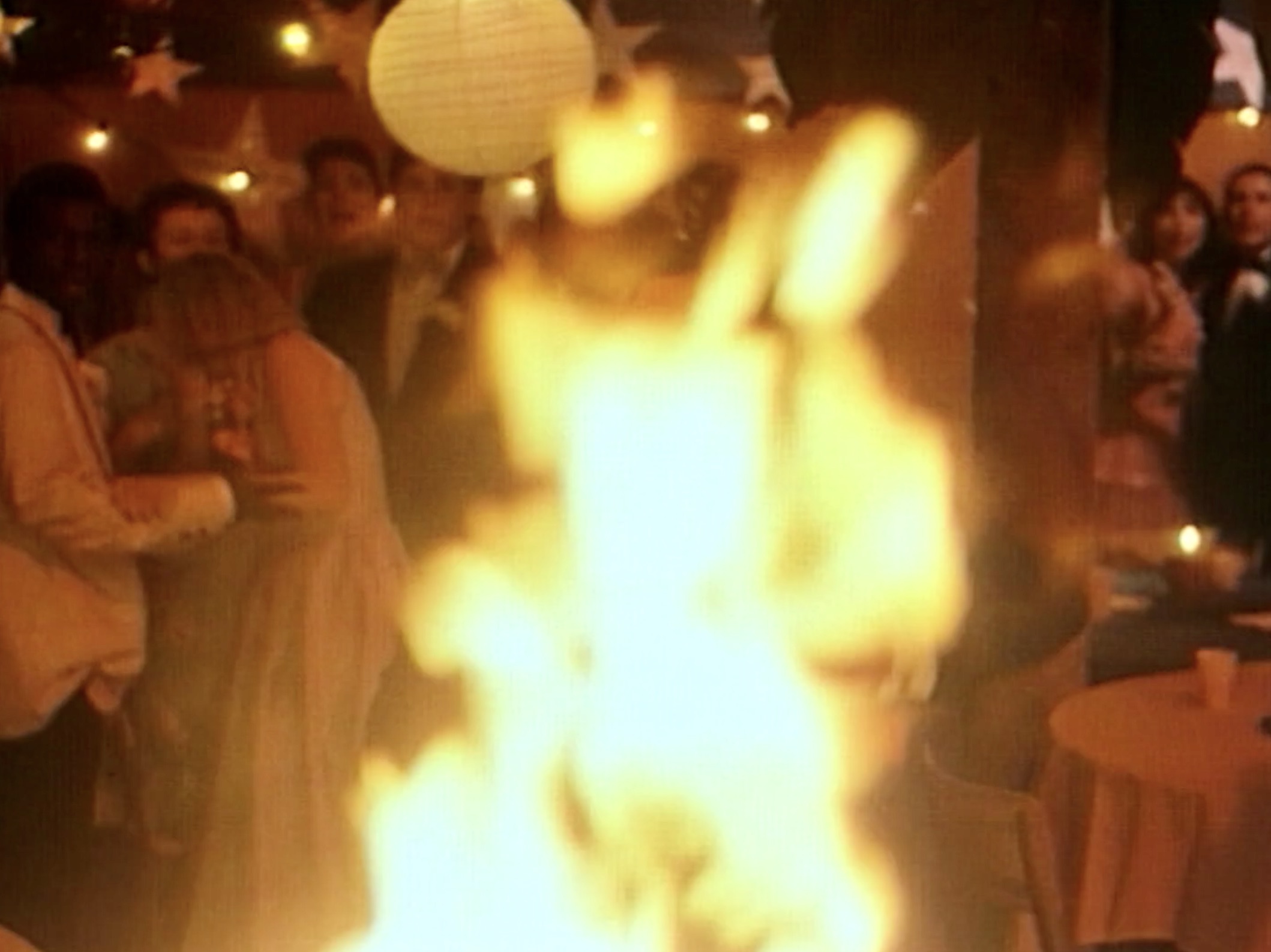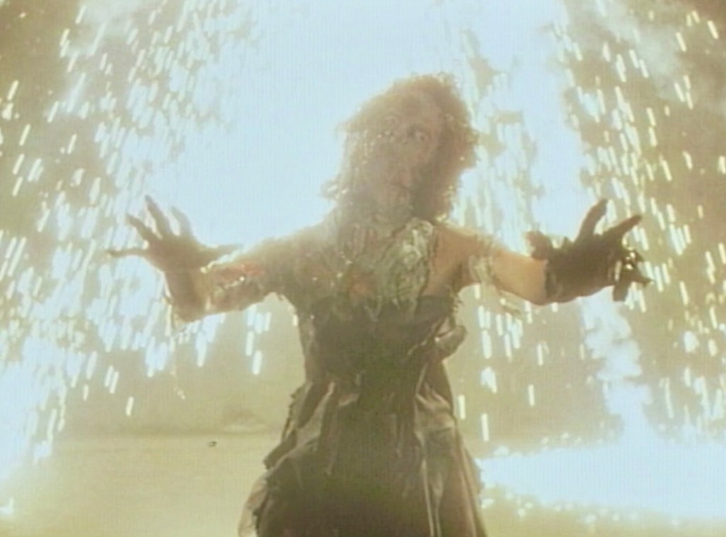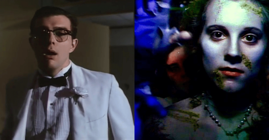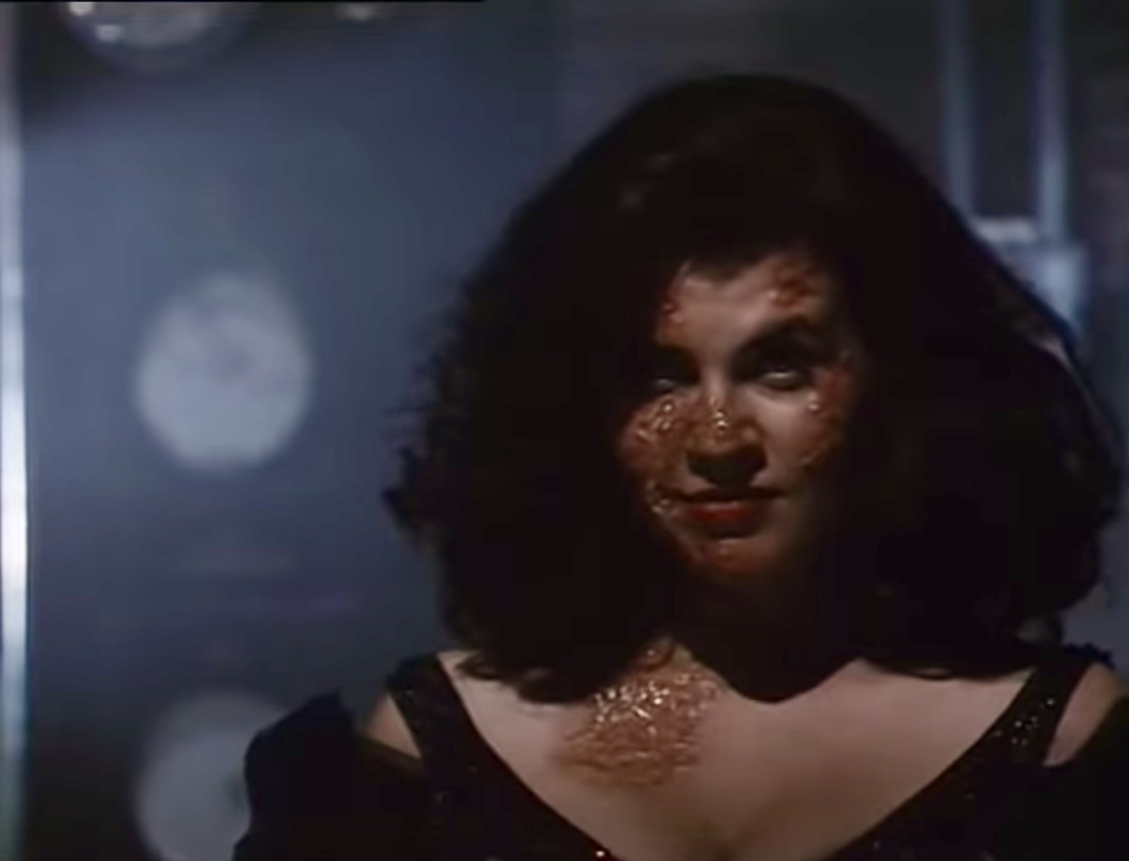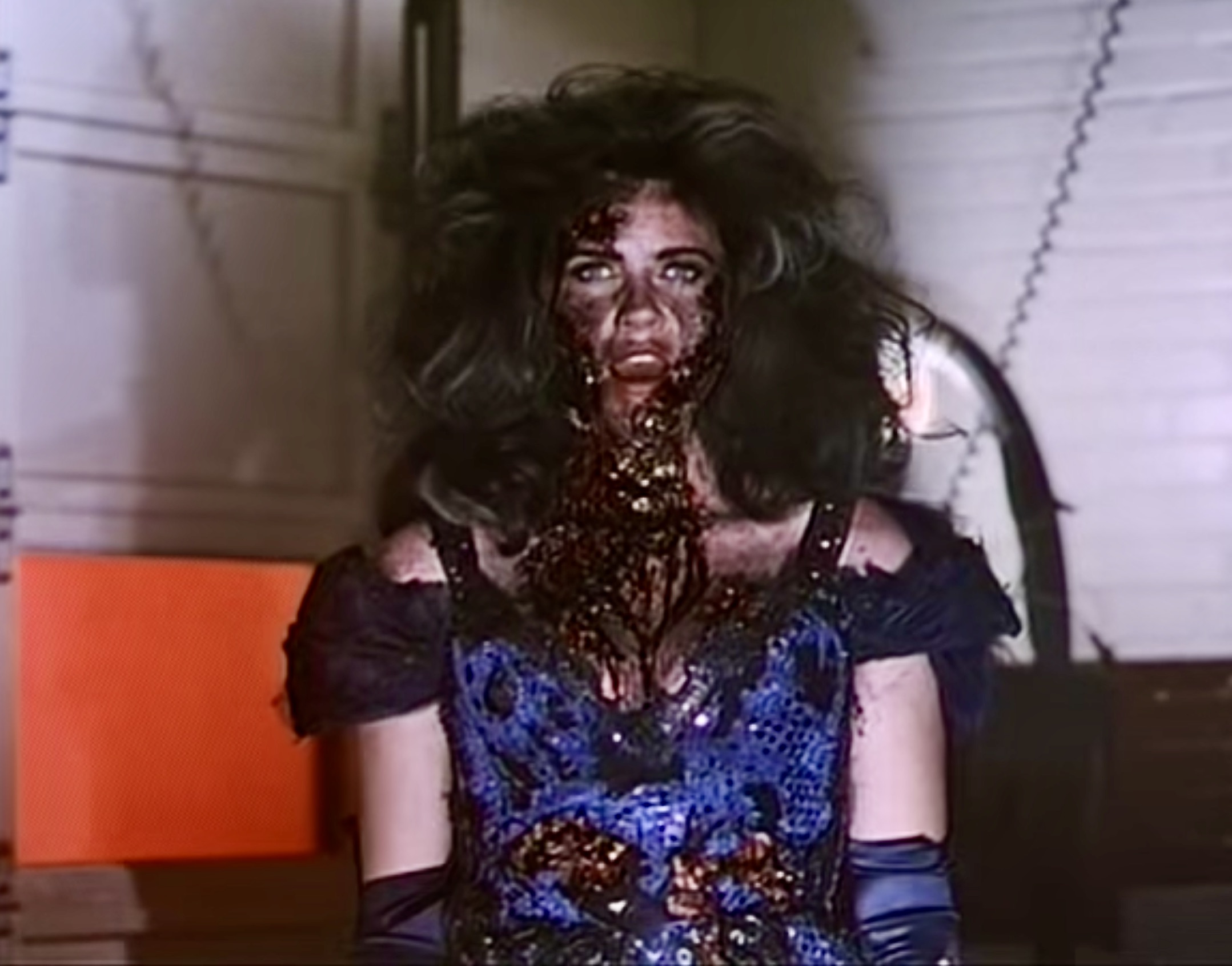 In another show-stopping moment, Mary Lou rises from the dead in a chaotic scene from the 1987 prom. Ejecting herself from Vicki’s body Alien-chest-burster-style, she is transformed into a charred, mutant corpse (played by Loretta Bailey) and causes supernatural chaos à la Carrie, dressed in her burned original prom dress.