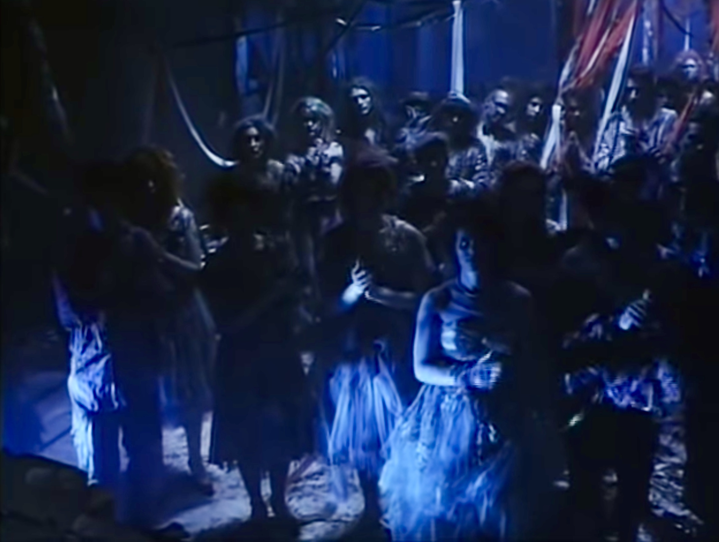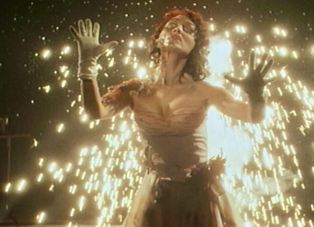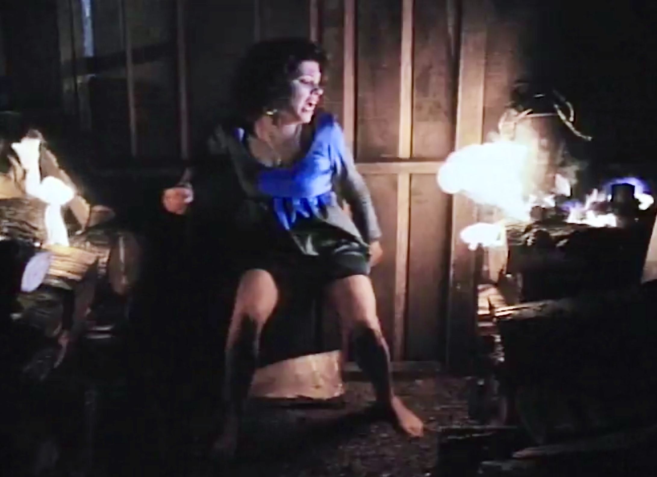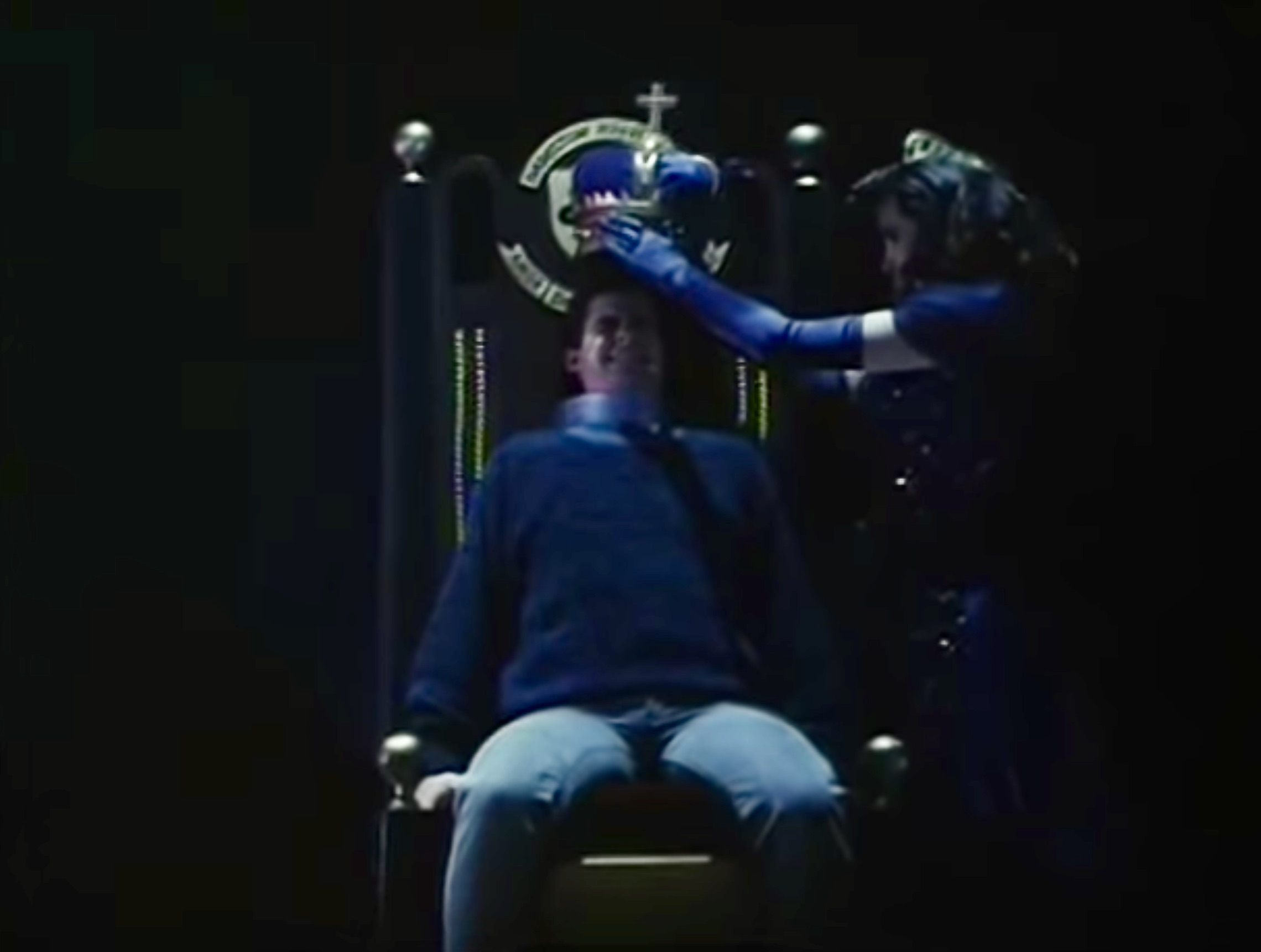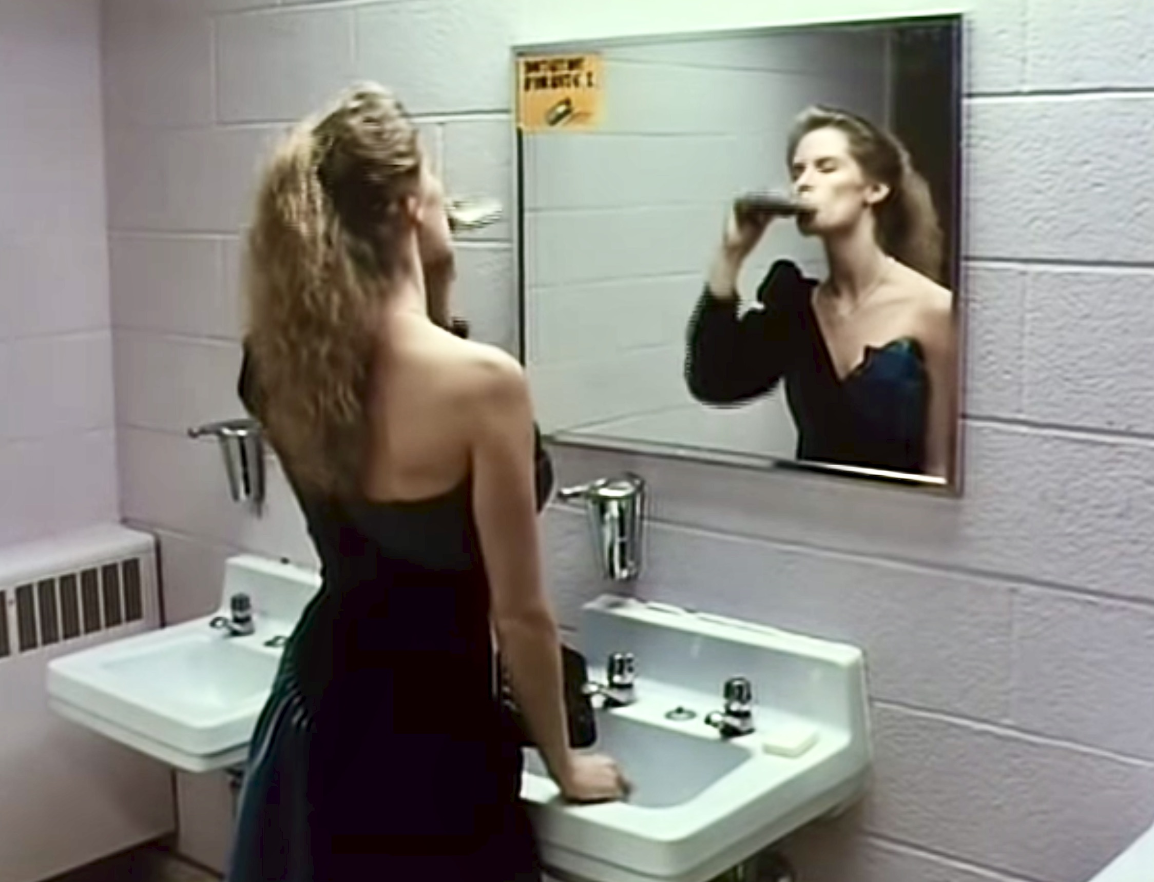 In another show-stopping moment, Mary Lou rises from the dead in a chaotic scene from the 1987 prom. Ejecting herself from Vicki’s body Alien-chest-burster-style, she is transformed into a charred, mutant corpse (played by Loretta Bailey) and causes supernatural chaos à la Carrie, dressed in her burned original prom dress.