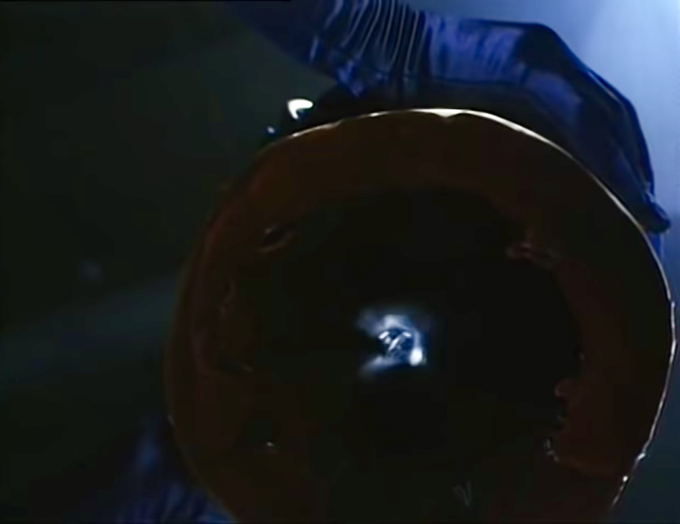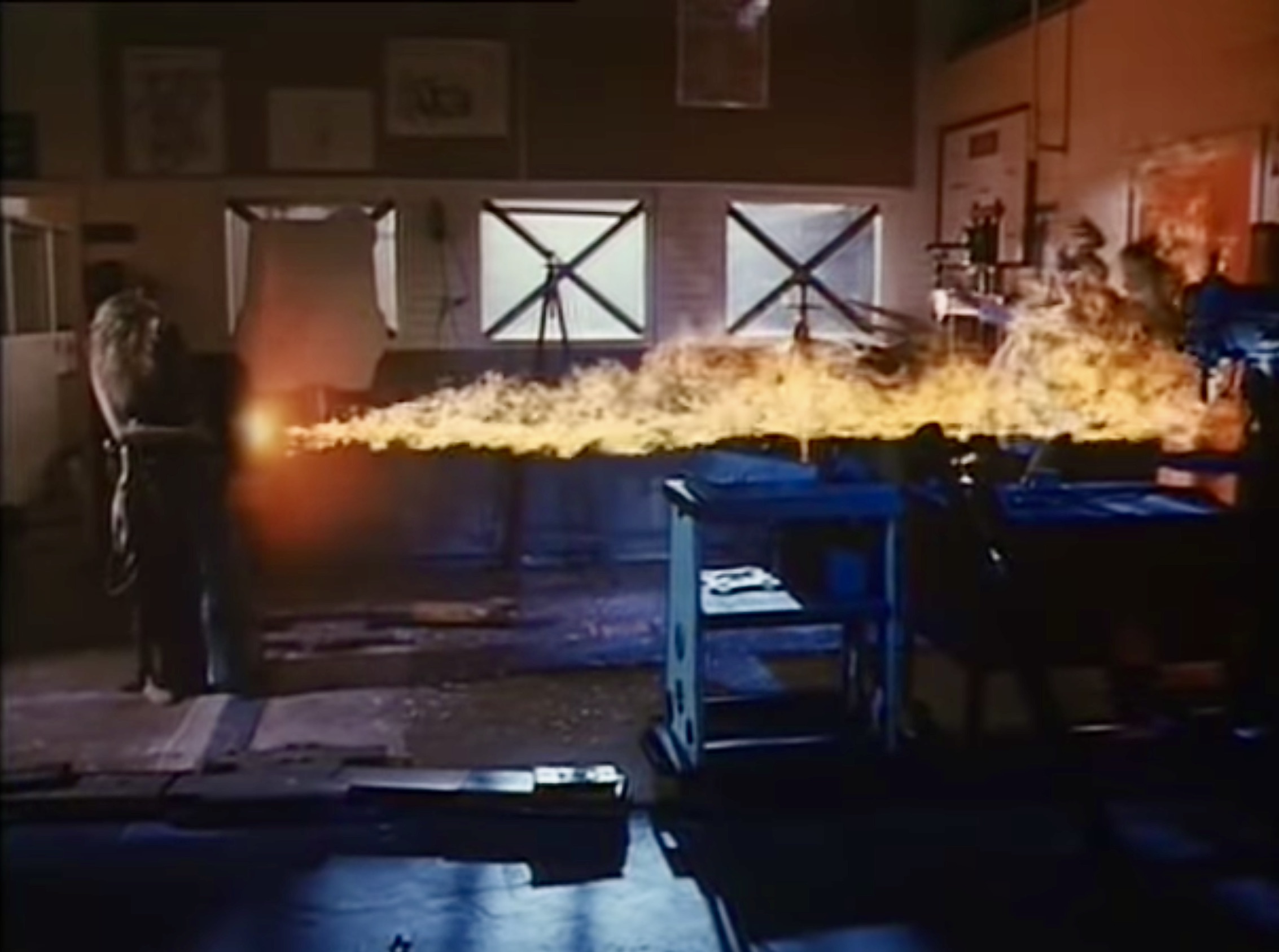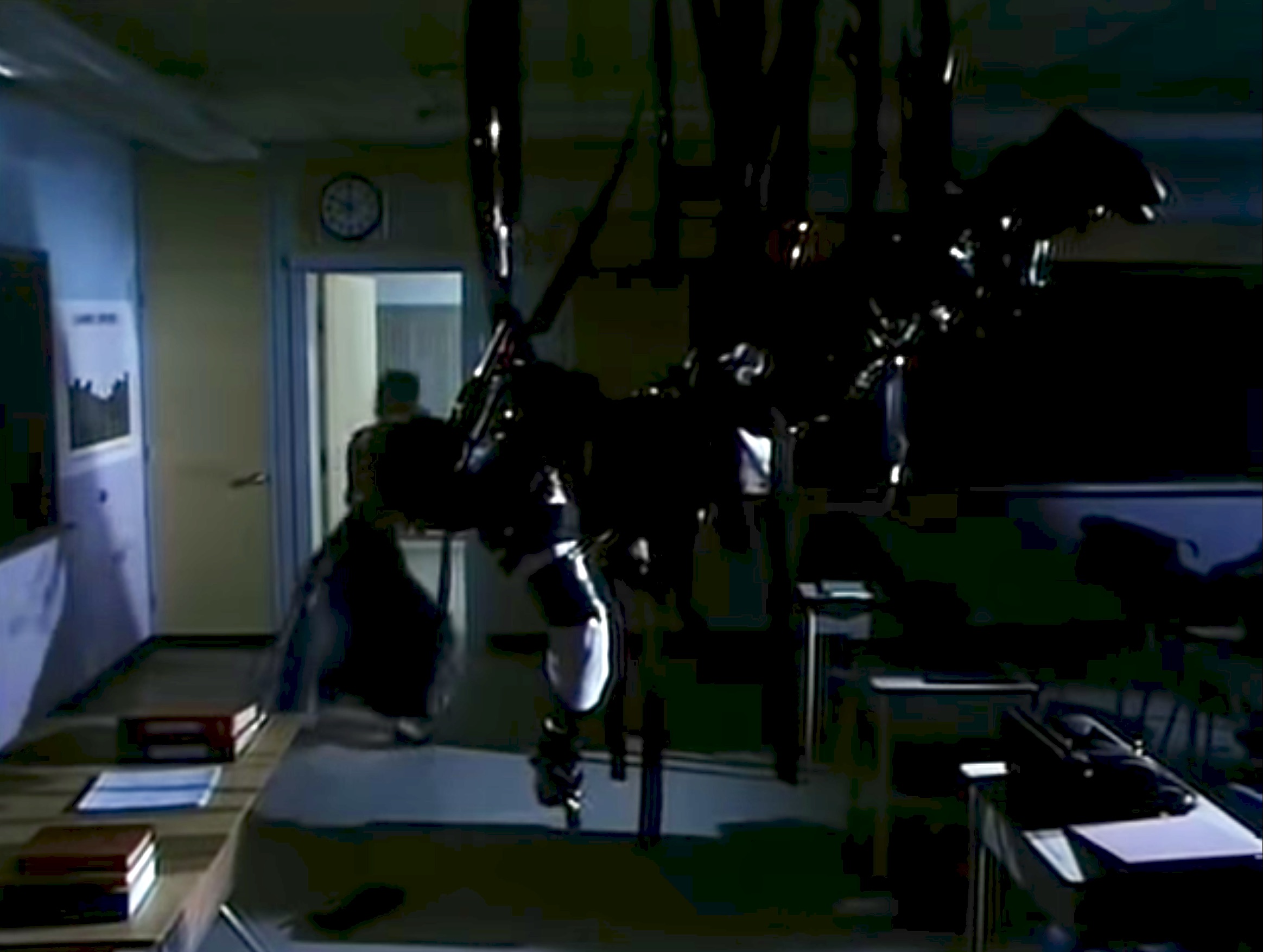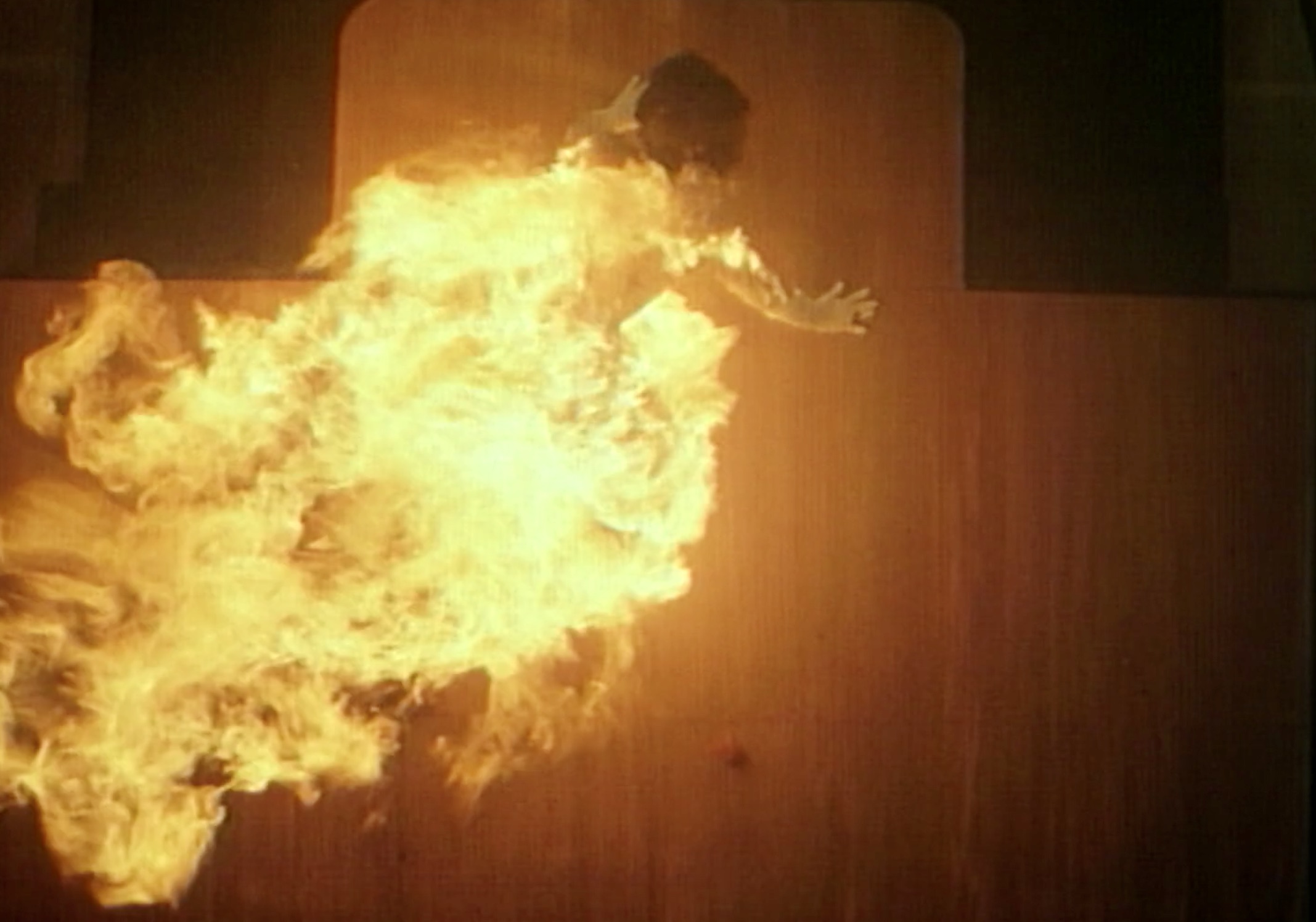 In another show-stopping moment, Mary Lou rises from the dead in a chaotic scene from the 1987 prom. Ejecting herself from Vicki’s body Alien-chest-burster-style, she is transformed into a charred, mutant corpse (played by Loretta Bailey) and causes supernatural chaos à la Carrie, dressed in her burned original prom dress.