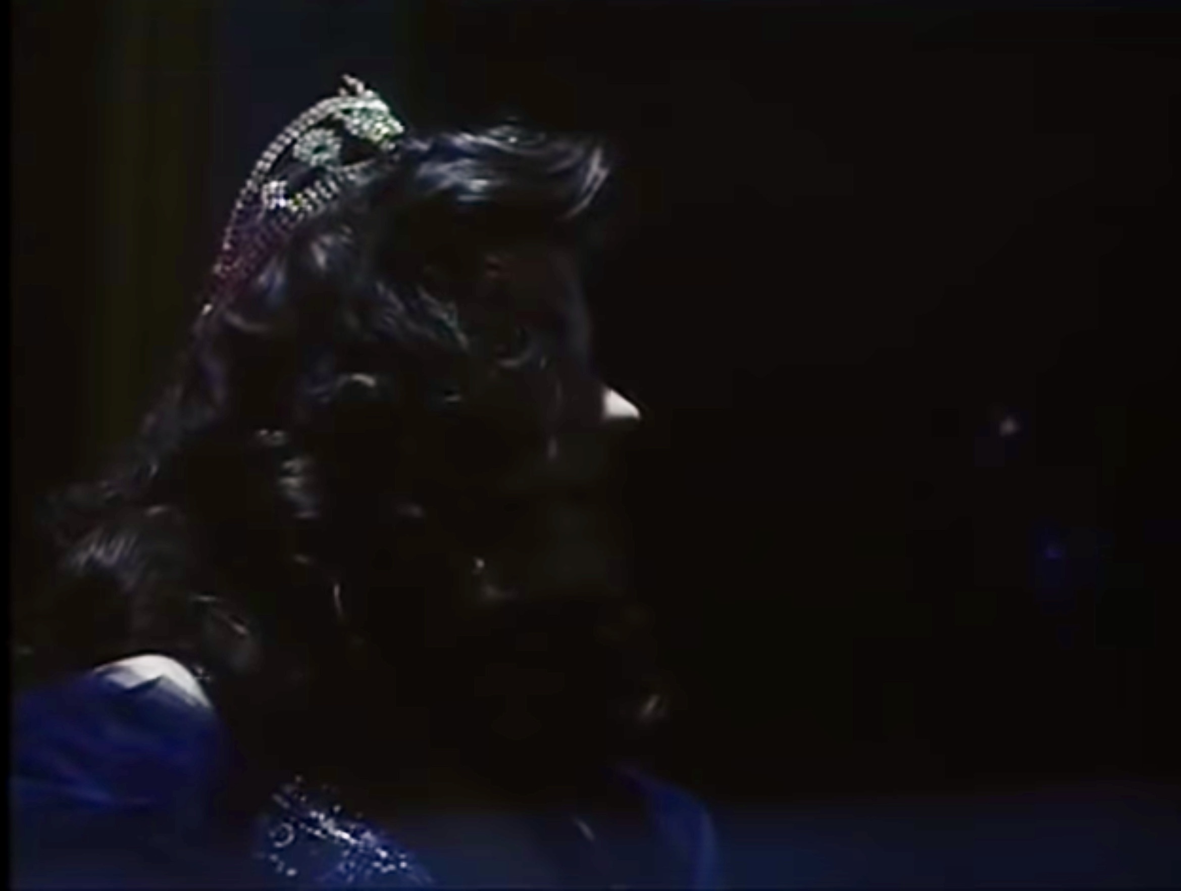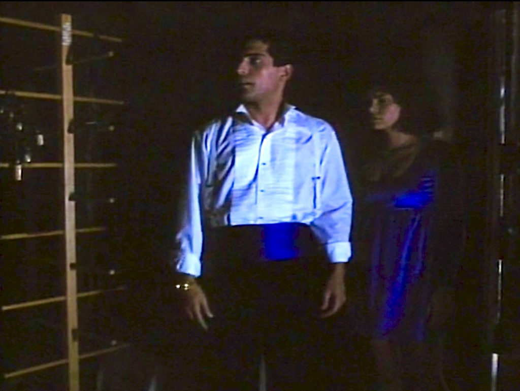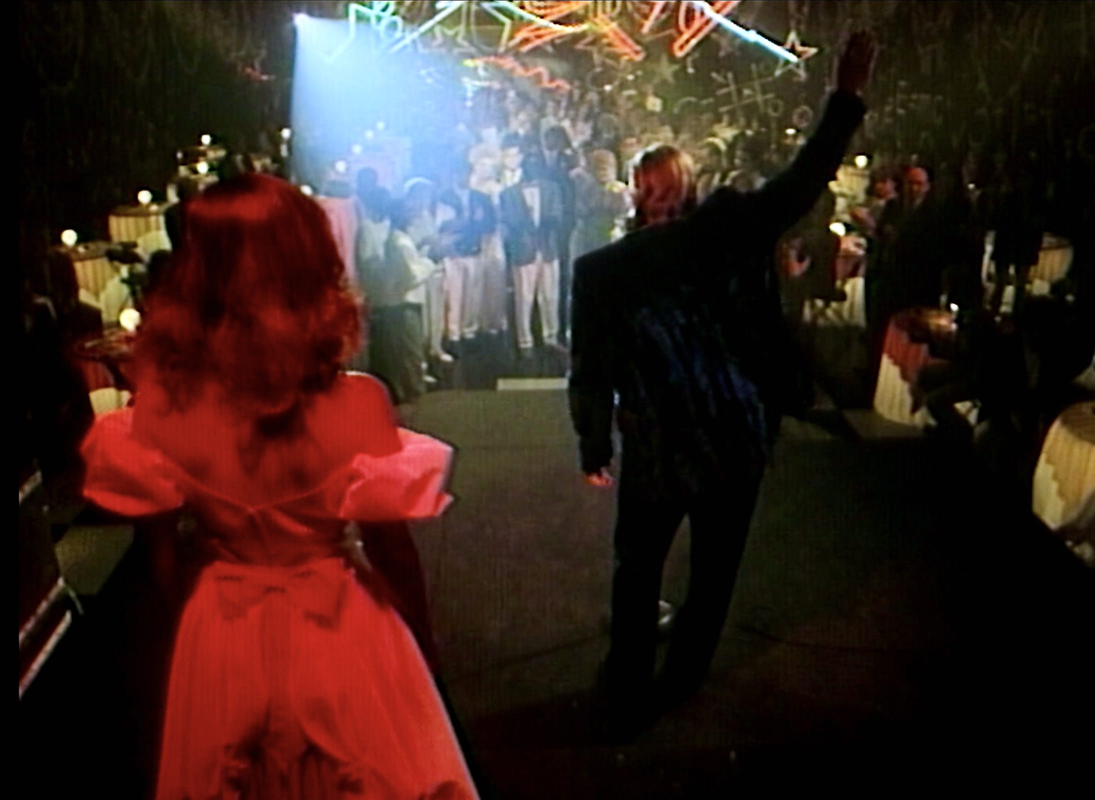An excellent example of 80s wear is mean girl Kelly’s (Terry Hawkes) trendy prom look. She wears a “Spanish” red and black polka-dotted one-shoulder prom dress in tulle with a ruched mermaid skirt accessorized with fingerless gloves. Her $64-dollar side pony hairstyle is sprinkled with glitter. Other examples include Kelly’s date, who also has red accents in his wardrobe; red and black ruffles decorate the front of his flashy tuxedo shirt which is tucked into a red cummerbund. Josh (played by Brock Simpson, who portrayed Young Nick in the original PROM NIGHT), the boy she fellates in exchange for rigging the prom queen results in her favor, is dressed in a black & blue ruffled shirt, and a light-up flashing sequin bow tie.