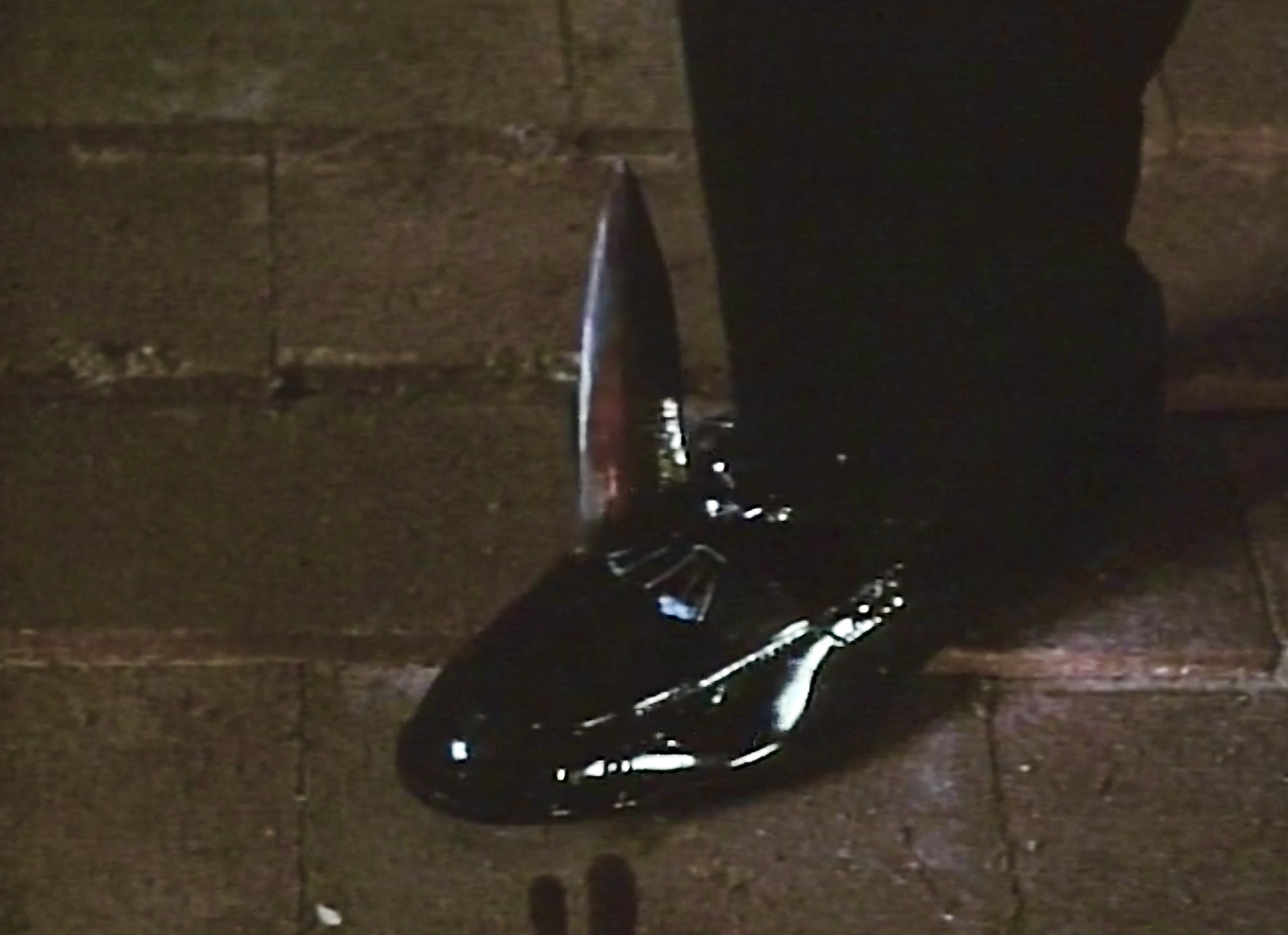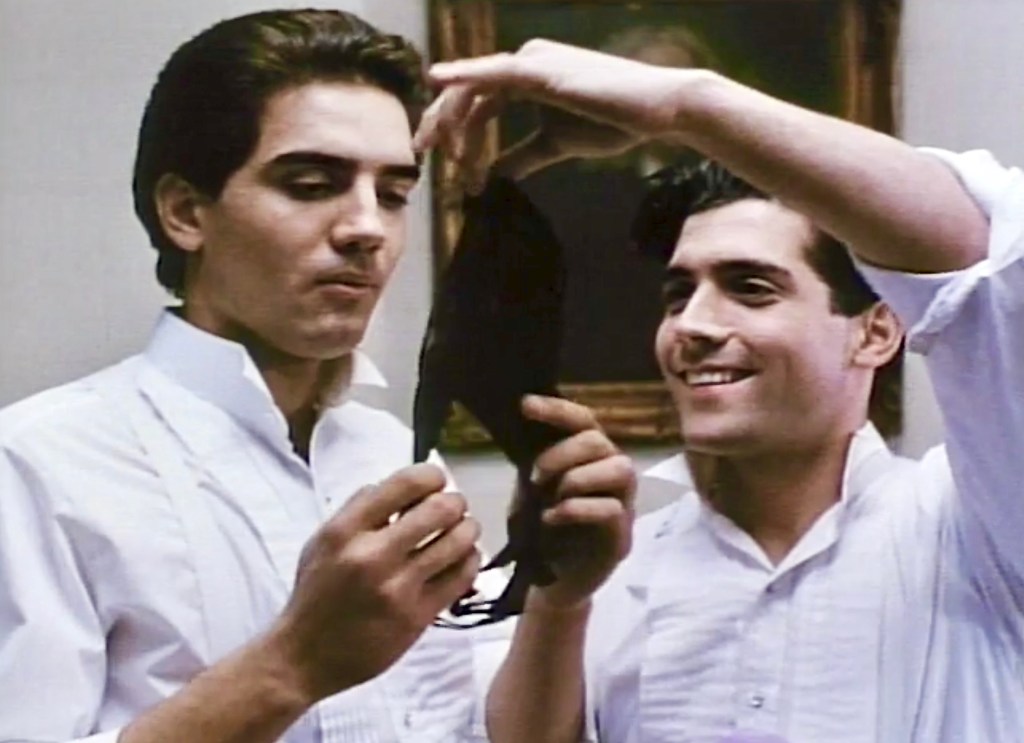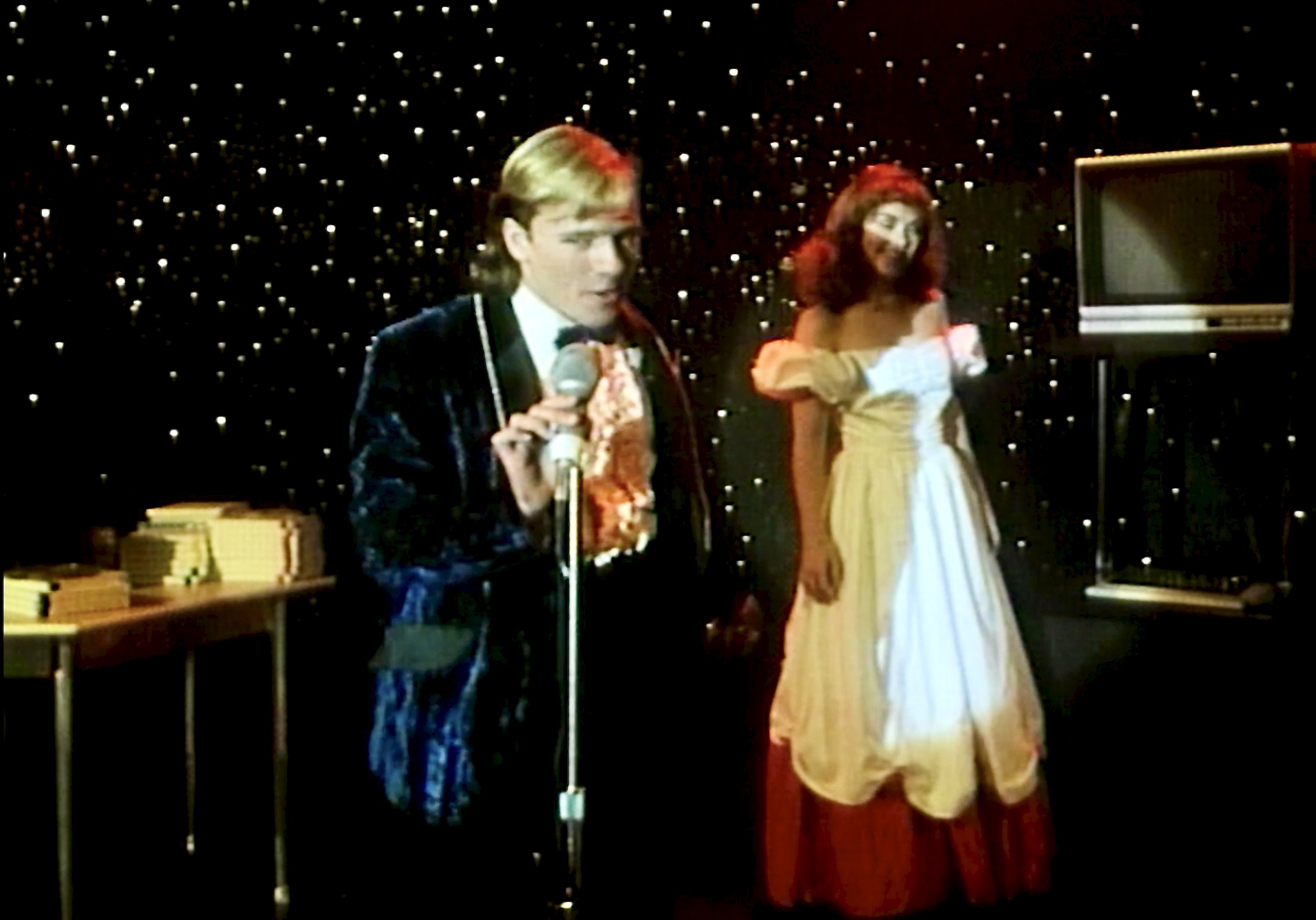 An excellent example of 80s wear is mean girl Kelly’s (Terry Hawkes) trendy prom look. She wears a “Spanish” red and black polka-dotted one-shoulder prom dress in tulle with a ruched mermaid skirt accessorized with fingerless gloves. Her $64-dollar side pony hairstyle is sprinkled with glitter. Other examples include Kelly’s date, who also has red accents in his wardrobe; red and black ruffles decorate the front of his flashy tuxedo shirt which is tucked into a red cummerbund. Josh (played by Brock Simpson, who portrayed Young Nick in the original PROM NIGHT), the boy she fellates in exchange for rigging the prom queen results in her favor, is dressed in a black & blue ruffled shirt, and a light-up flashing sequin bow tie.