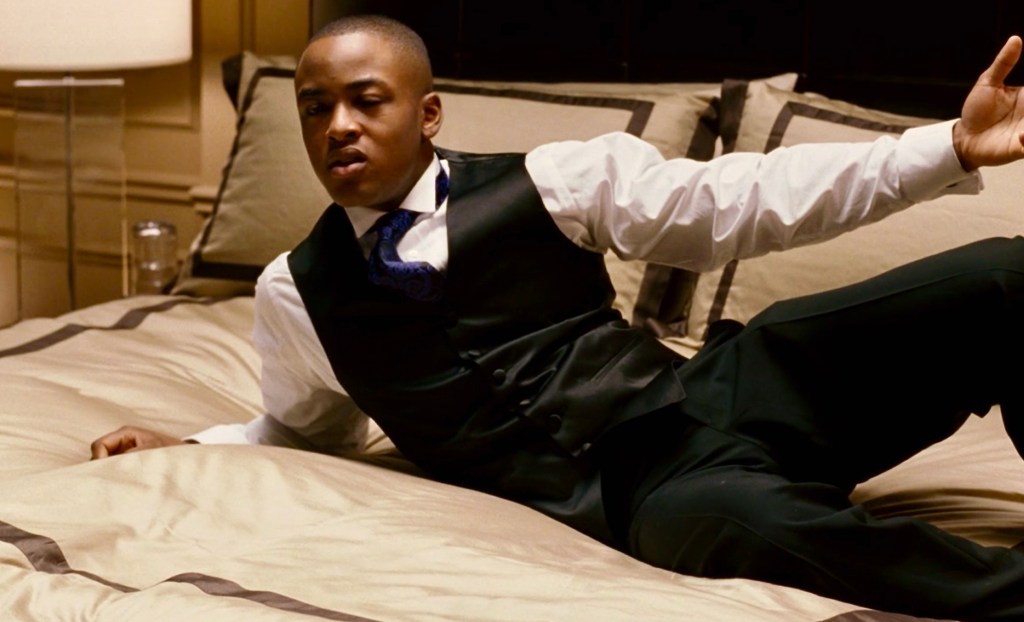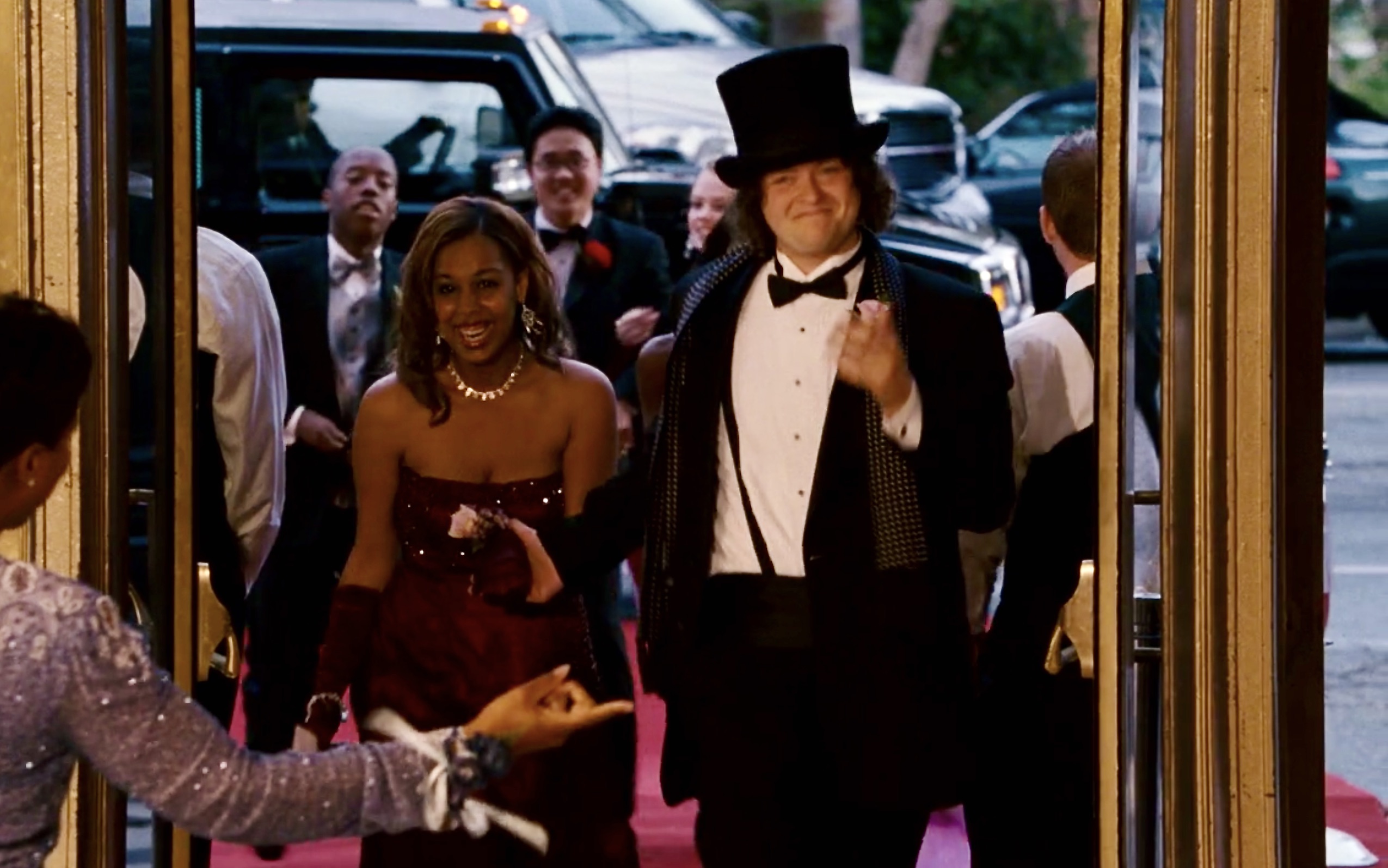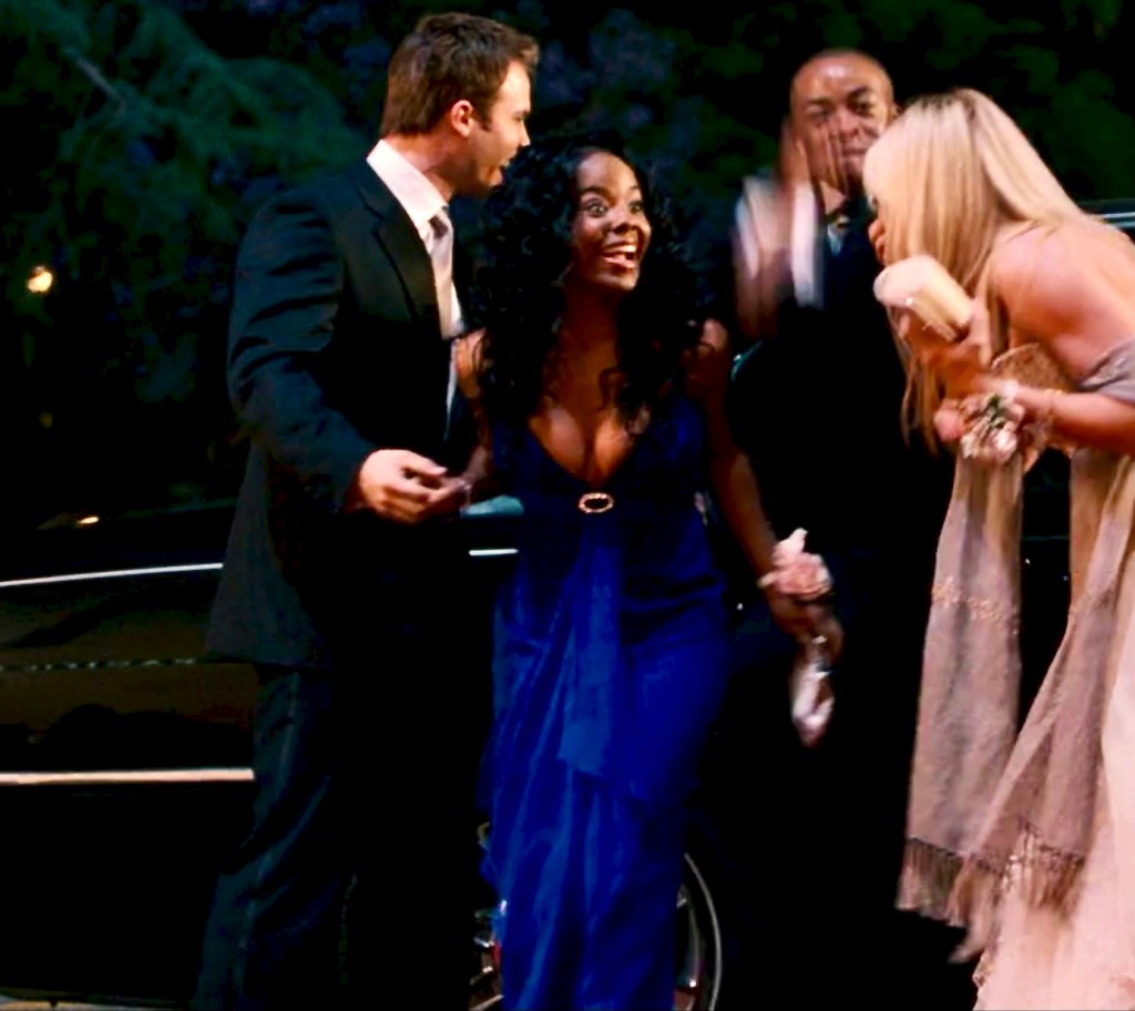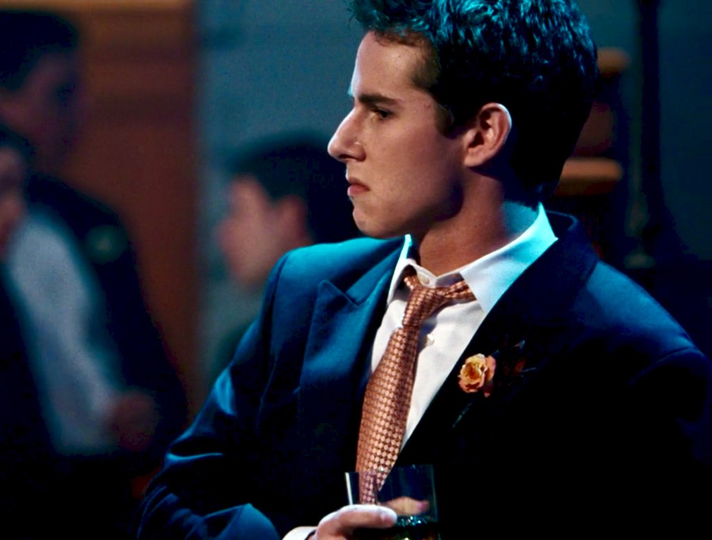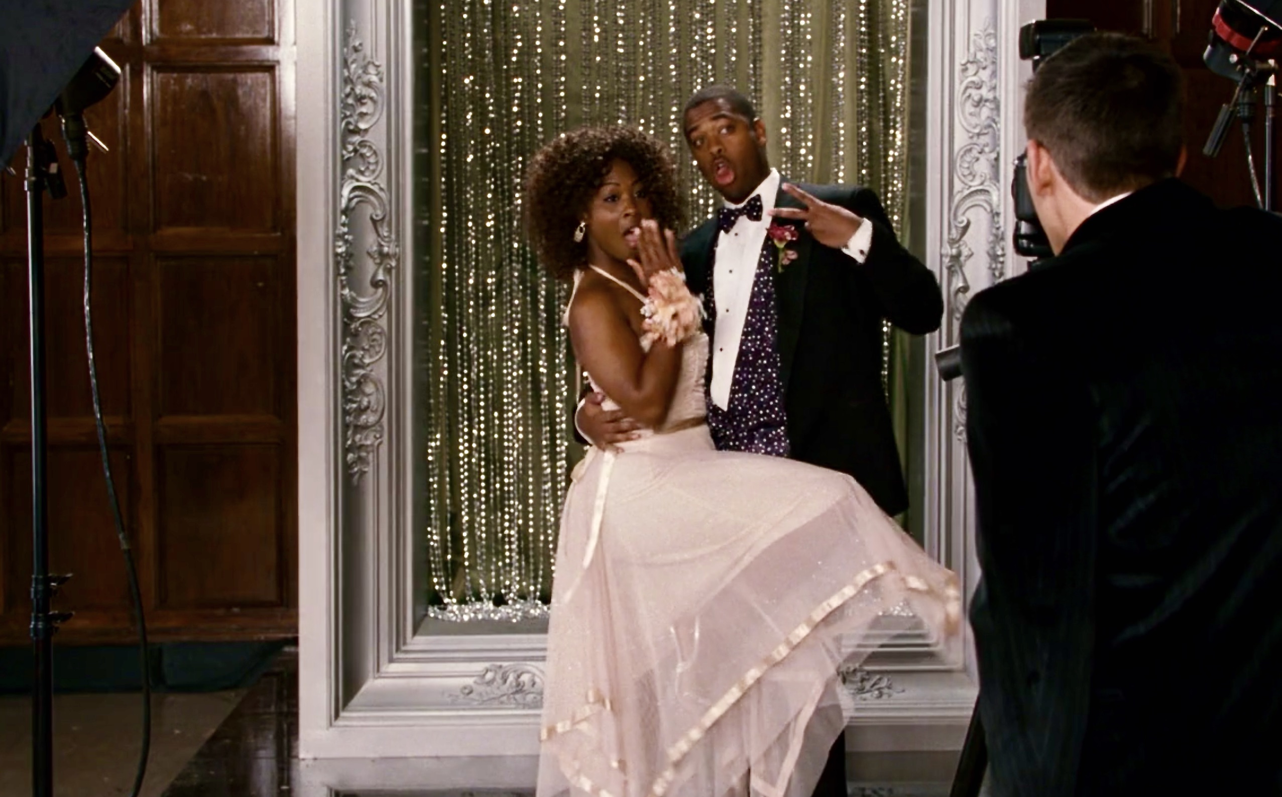 Her boyfriend Ronnie, while looking sophisticated in a black three-piece tuxedo, complete with a satin waistcoat, appears a bit off pairing a wing-tip collar dress shirt with a black and blue patterned tie; a major fashion faux-pas. Fashion etiquette dictates that a wing-tip collar shirt should only be paired with a bow tie. A white dress shirt with a turndown collar would have been a better choice for Ronnie’s look. Nonetheless, he still looks elegant and dashing.