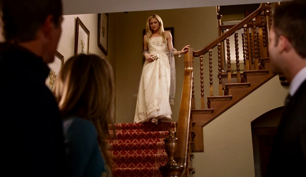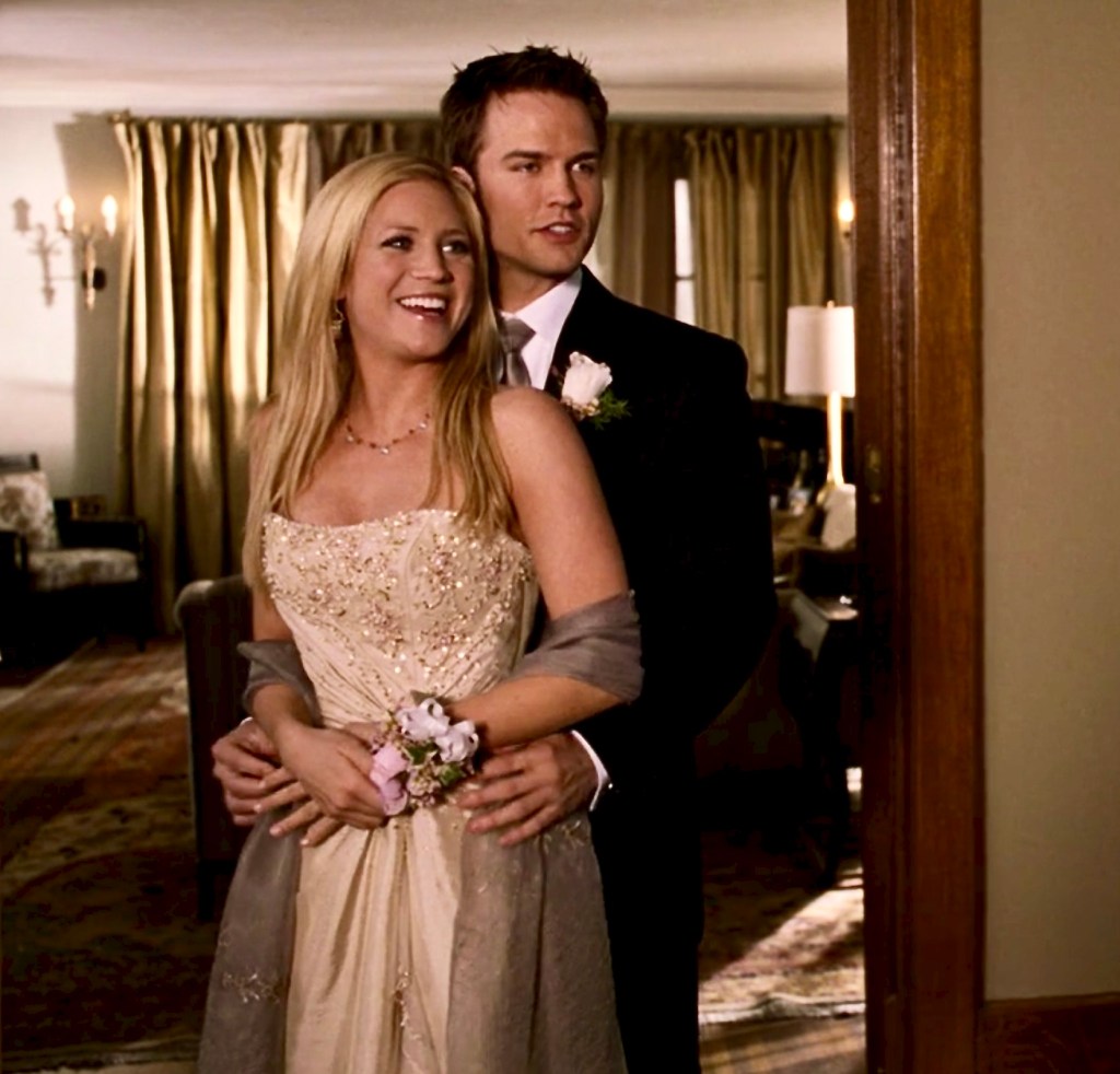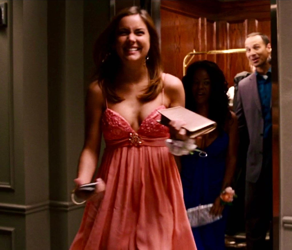 Donna’s champagne gown. What I love most about Donna’s dress is the design. She is the belle of the ball in an A-line gown with matching pink and gold beads decorating the corset top. The dress is further accentuated by a lace-up back, twisted front detail at the waist, and a long, cascading skirt. A sheer taupe chiffon shawl with gold embroidery that once belonged to her recently deceased mother is the right complement to her dress and completes her look. The shawl is worn as an homage to her mom and serves as a reminder of her mom’s love and support. Donna’s prom date Bobby (played by Scott Porter) wears a dark suit and a taupe-colored tie.