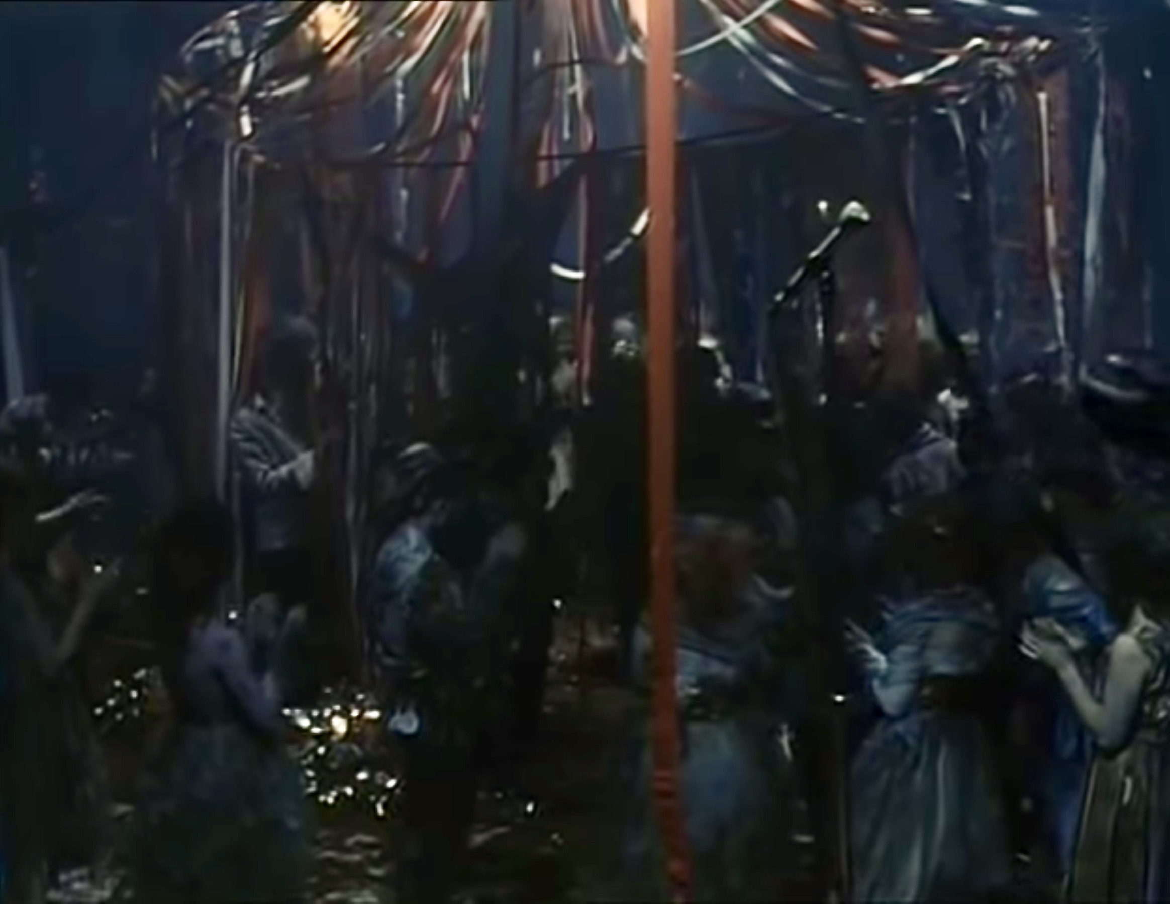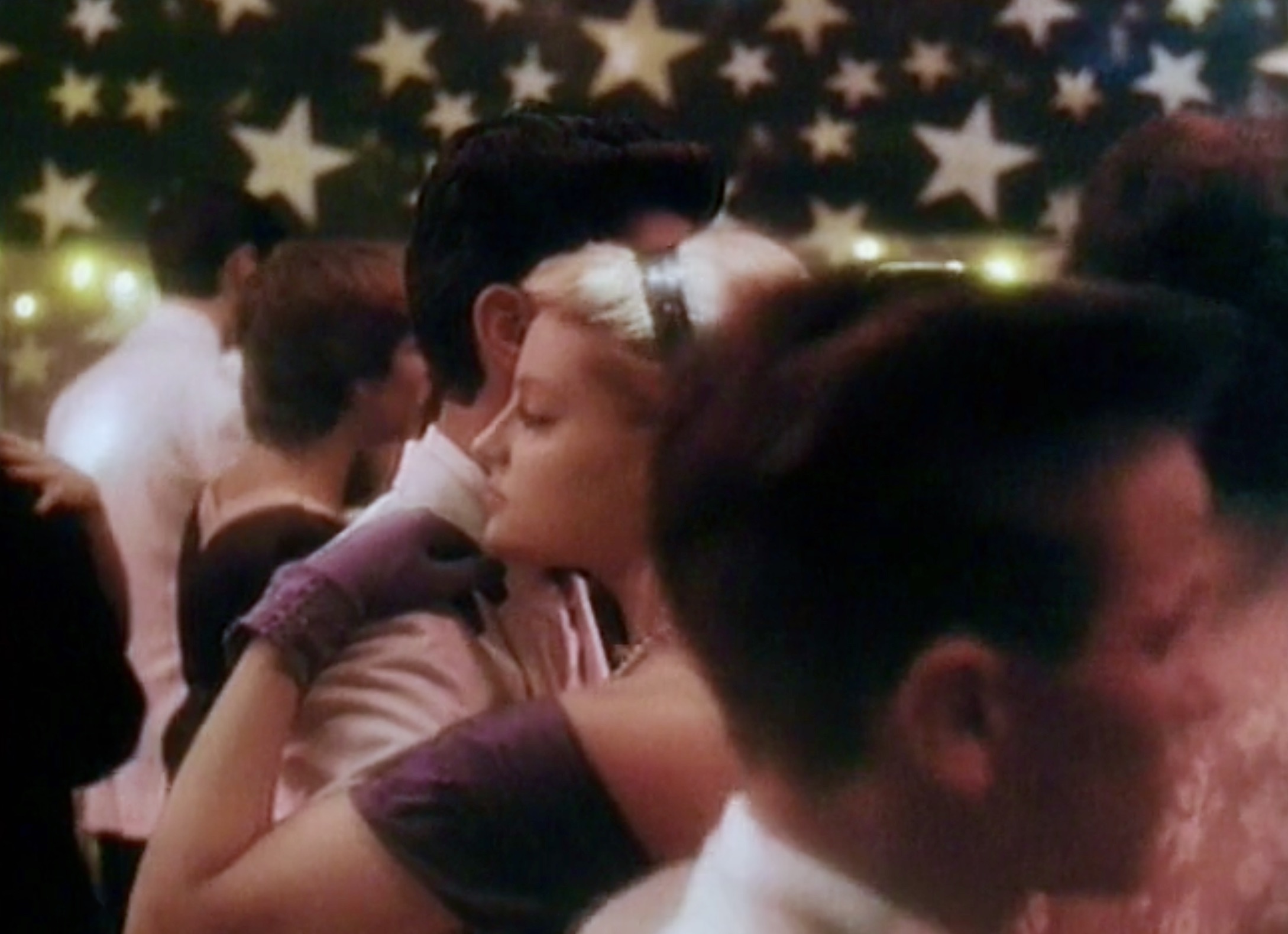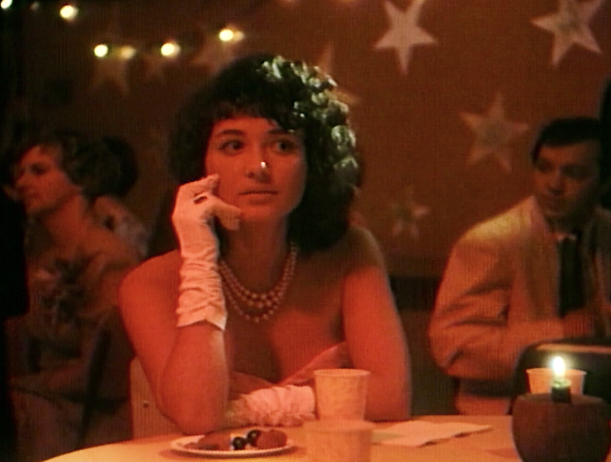 1957 Prom. The theme is tropical and the venue is decorated with palm trees and wicker. Long, full skirts, pearls, and gloves for the girls. Aside from a prankster with a smoke bomb wearing a formal dinner jacket featuring a gold and black floral jacquard pattern, black and white tux jackets with bow ties are common for the guys. Mary Lou’s date Billy gets his jacket and bib shirt stained with pink punch after Mary Lou tosses her drink at him.