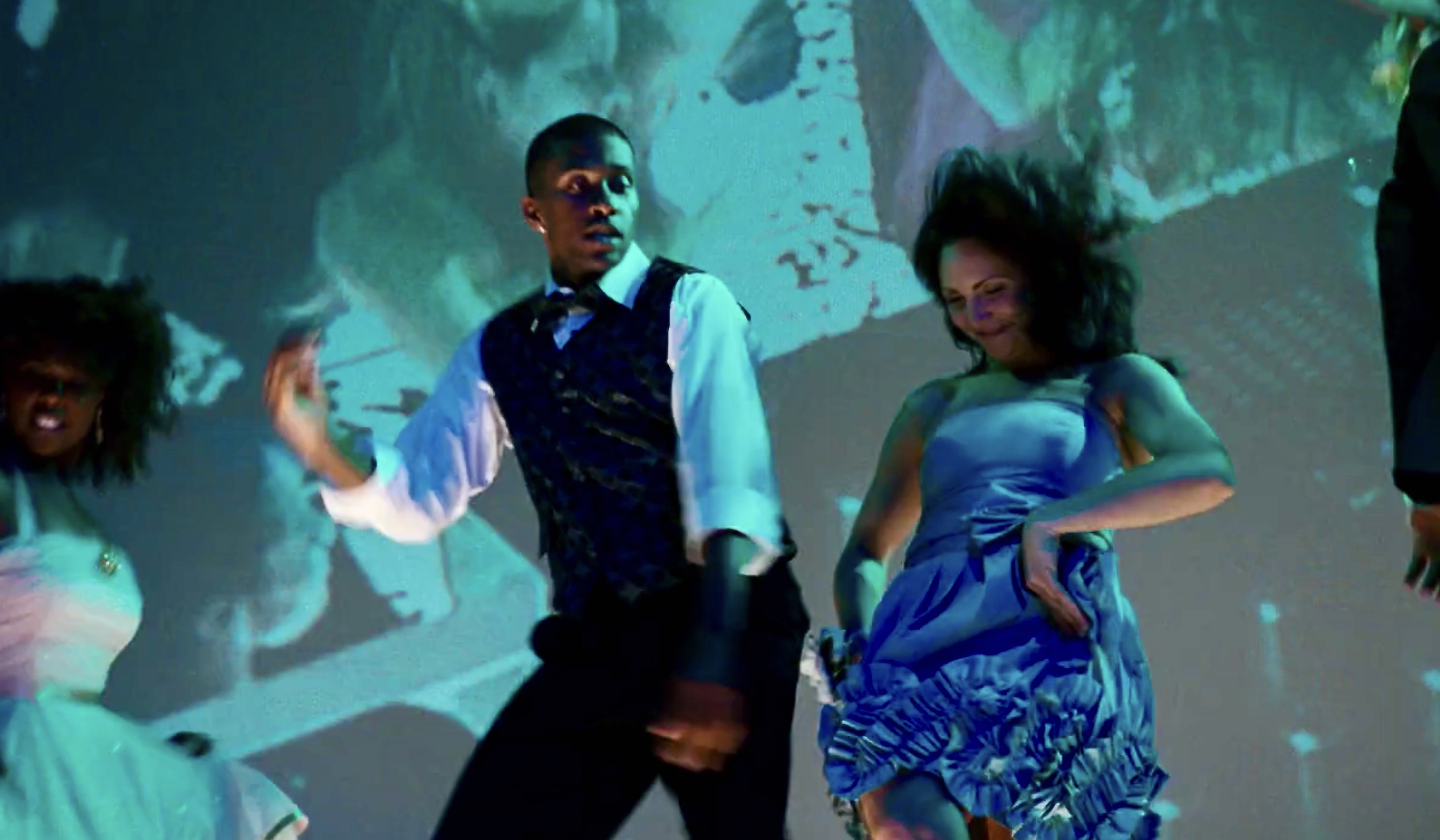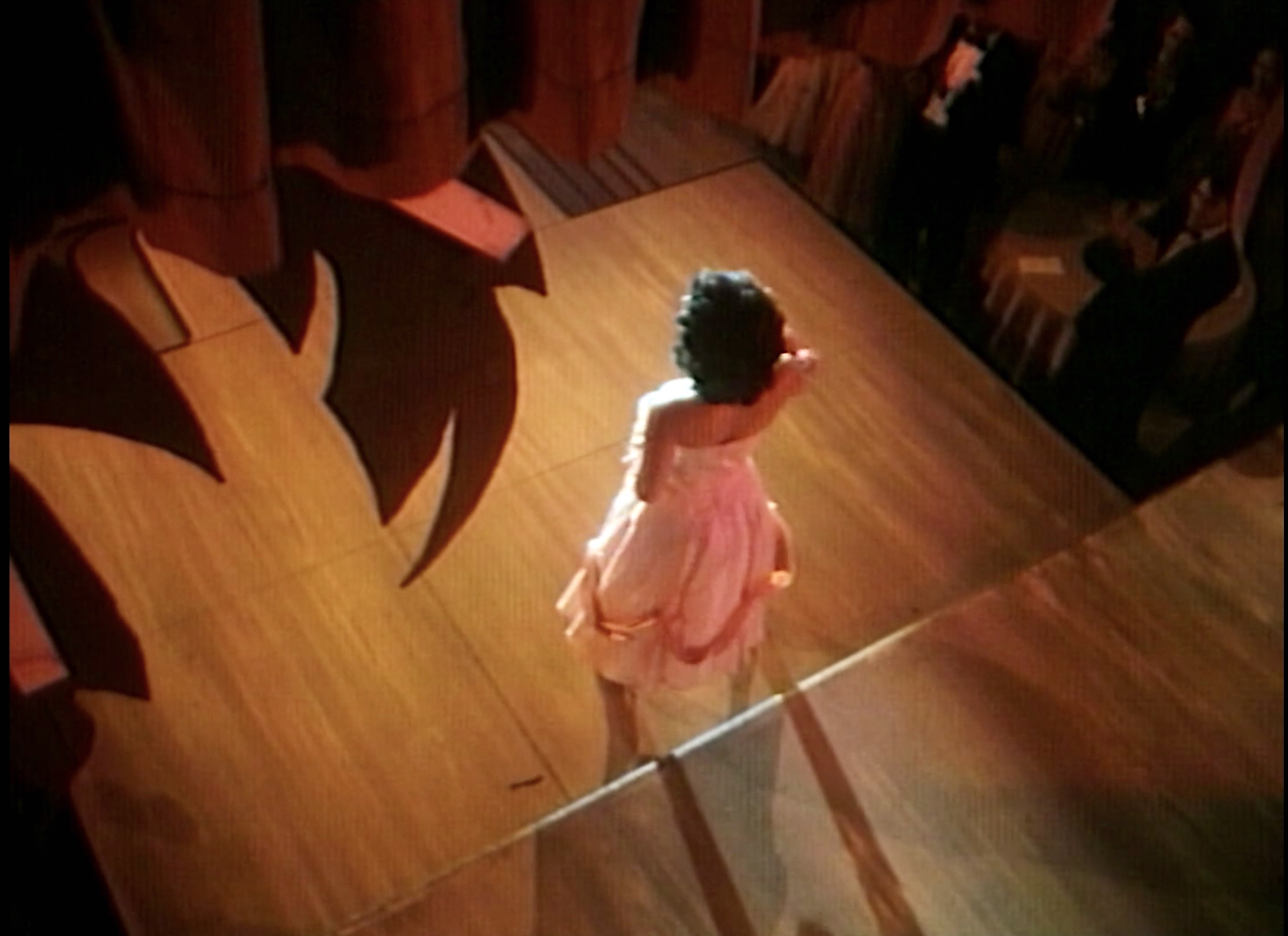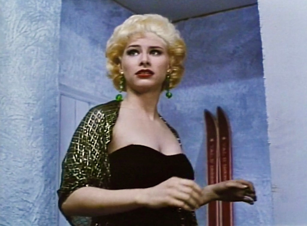 1957 Prom. The theme is tropical and the venue is decorated with palm trees and wicker. Long, full skirts, pearls, and gloves for the girls. Aside from a prankster with a smoke bomb wearing a formal dinner jacket featuring a gold and black floral jacquard pattern, black and white tux jackets with bow ties are common for the guys. Mary Lou’s date Billy gets his jacket and bib shirt stained with pink punch after Mary Lou tosses her drink at him.