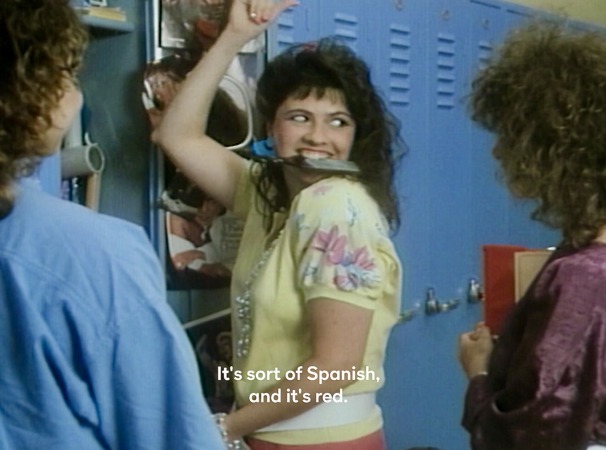 Wendy’s red-hot prom dress. Her glittery spaghetti-strap number is the finest dress in the series. The top half of the halter-style, slim-fit dress is adorned with dazzling red paillettes that flow over the waist and down the flowy chiffon skirt, and gradually degrade, giving an ombre effect. Her matching long chiffon evening wrap looks particularly ethereal and floaty draped over her body as she waits for Lou to open the car door for her. This stunning look is completed with a black sequin bag and ankle-strapped heels. When she walks in with Lou (David Mucci) and his tuxedo-shirt-clad buddies everyone notices her entrance. Her confident demeanor and saucy move of tossing off the wrap to expose a shoulder prompts someone to hoot in approval. The dress is the topic of a convo in the girl’s bathroom with Kim and her friends agreeing that Wendy looks gorgeous. It even looks stunning as she hauls ass through the school while being chased by the killer.