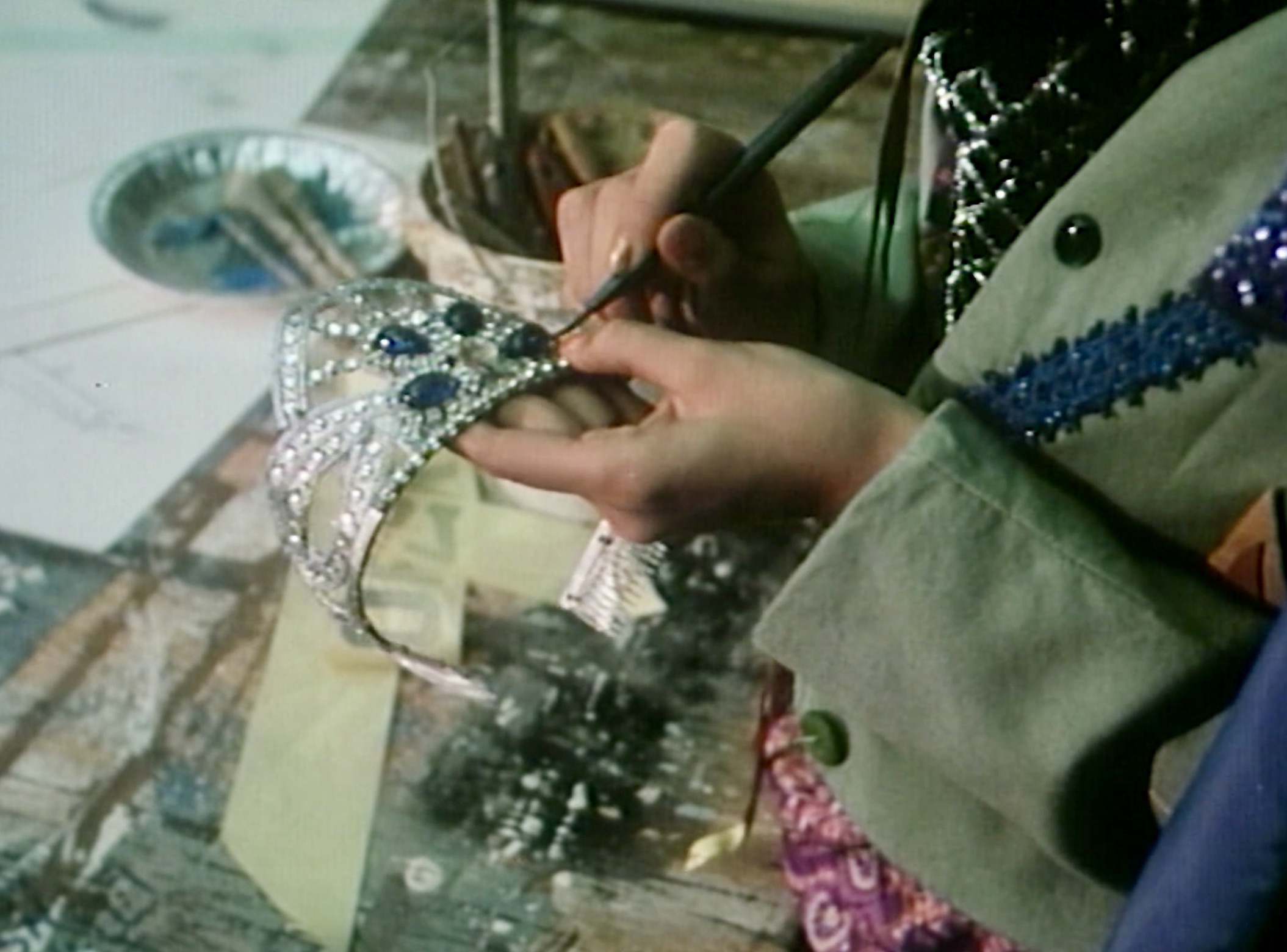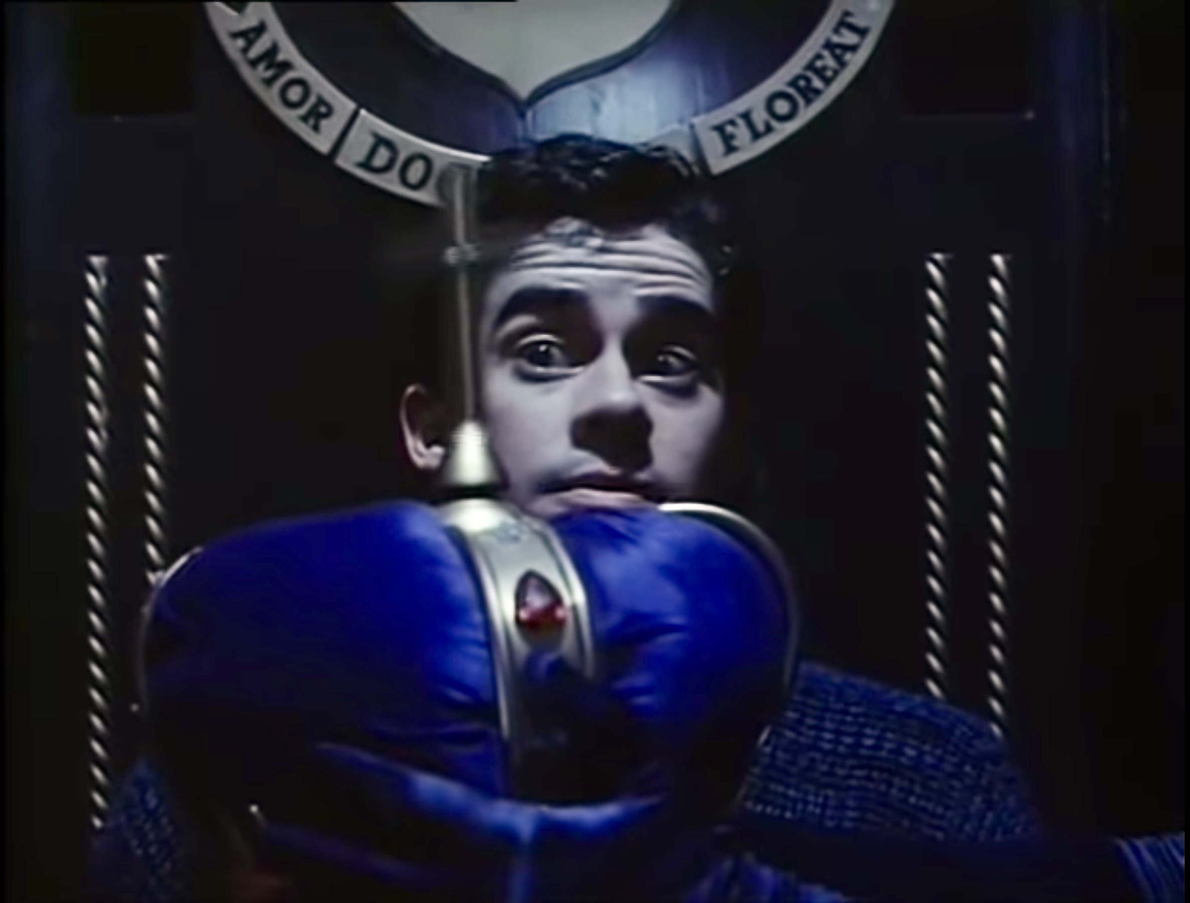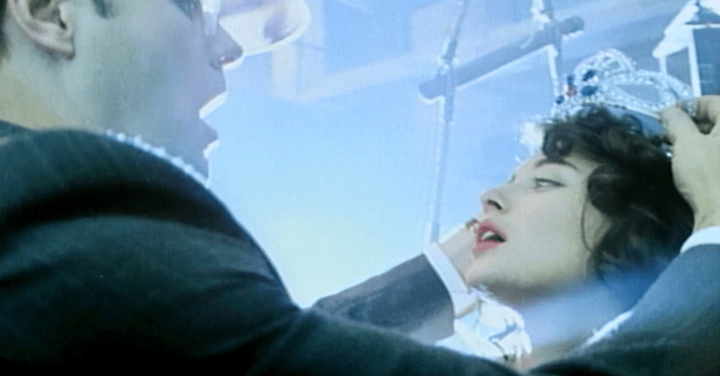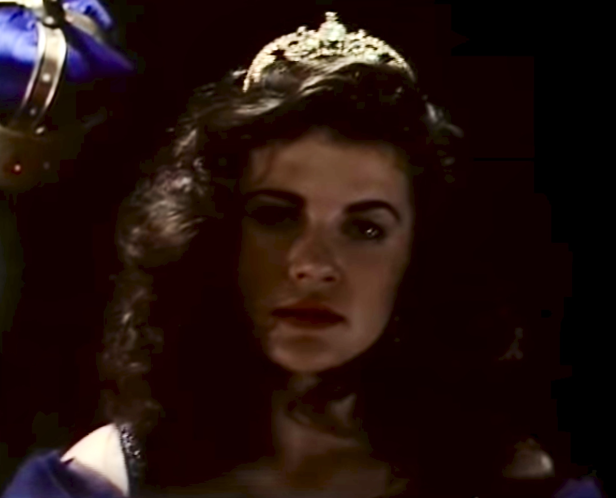 Alex’s prom king crown. The Dark Prom sequence begins with Mary Lou kidnapping Alex (Tim Conlon) and taking him to hell, where they are Prom King and Queen. Mary Lou attempts to place a deadly crown on his head that will make him prom King forever. It is an impressive costume piece; a royal blue, jewel-encrusted, gold crown installed with a drilling device meant to fasten to his skull, killing him.