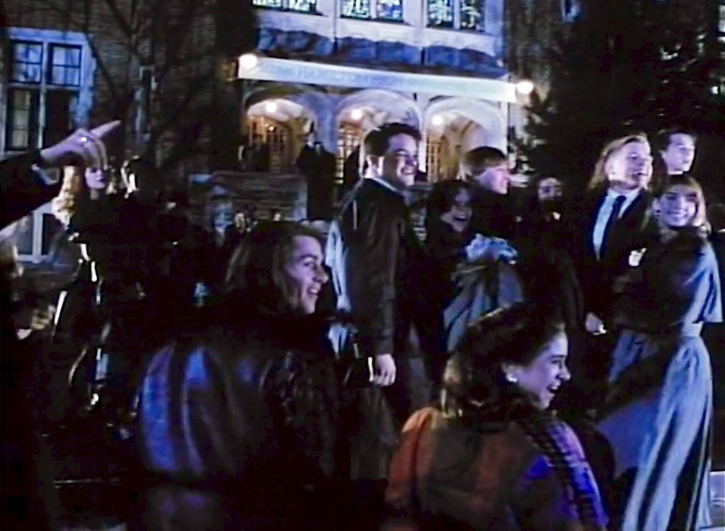 DELIVER US FROM EVIL is the installment least focused on proms, so we never see the inside of a prom after this. Instead, we see the ‘90s Hamilton High prom shown as an exterior nighttime scene showing promgoers entering the building while the four main teens – Mark, Megan, Laura, and Jeff – ditch the prom to do a drive-by and moon their classmates before riding off to a weekend in the country. Their destination is Mark’s parents’ summer home, which is actually an estate. This location provides the few fashion moments during the rest of the movie with Megan’s friends, who are fully dressed for prom.