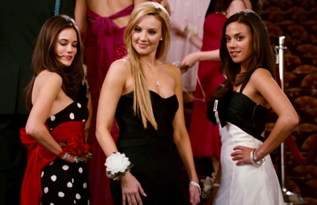 The Bridgeport High School promgoers. While the main girl trio, Donna, Claire, Lisa (Britney Snow, Jessica Stroup, Dana Davis), and their dates shine in their prom attire. Girls wear well-crafted gowns that show intricate details. The guys look polished and sophisticated in their tuxes. The main girl trio, Donna, Claire, Lisa (Britney Snow, Jessica Stroup, Dana Davis), and their dates shine in their prom attire. Other trendy female promgoers wear loose and flowy gowns in fruity tones such as citrus, aqua, and chartreuse. Gowns are made with soft, slinky, light, airy fabrics such as chiffon, satin, and organza. Styles range from minimalist to extravagant: princess gowns, strapless dresses, asymmetrical cuts, mini-dresses, one-shoulder dresses, and tiered gowns. Prom fashion trends also include crystal and beaded embellishments on gown bodices, corset backs, and rhinestone brooches. To complete the look, a statement necklace, earrings, bracelets, a shawl or wrap, and a clutch are essential accessories.