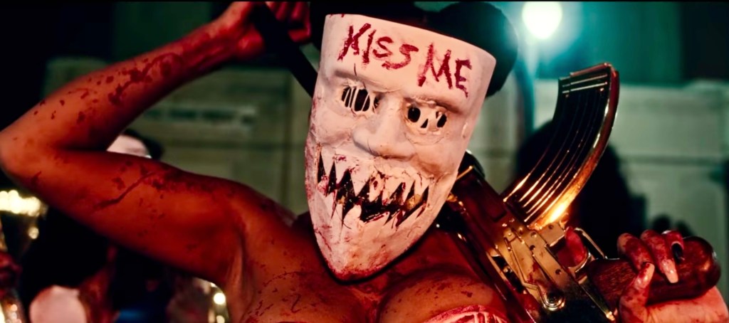 In terms of action horror entertainment, The Purge films are a damn good time. The popular 2010s dystopian film series examines a murder-is-legal-for-one-night plot that contains themes of violence, chaos, and fear of the unknown. These films allow people to live out their darkest fantasies without fear of repercussions, with many of the characters wearing masks to kill anonymously. Purge-happy characters use the annual event to murder those they hate or are envious of and to seek revenge on those who have crossed them. As “Schoolgirl #1” Kimmy and her crew demonstrate in the third episode of the series, THE PURGE: ELECTION YEAR, their masks provide them with a feeling of both autonomy and anonymity, allowing them to freely behave like lunatics.