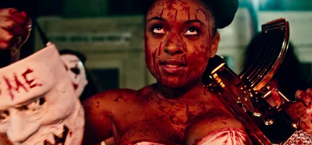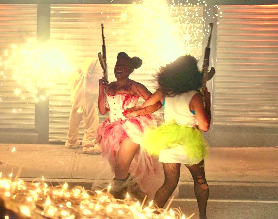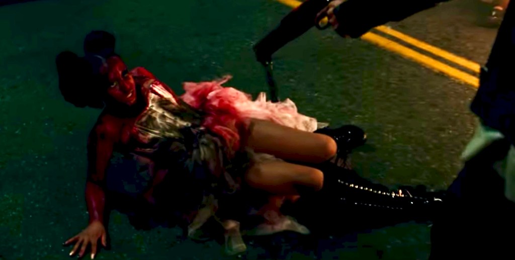 Though it’s only been several years since TPEY’s premiere, Kimmy’s ensemble has already become a widely recognized horror movie look that can be easily put together for Halloween cosplay; a white, blood-stained corset top, a hi-low asymmetrical pink tutu skirt, and tall black patent leather, front-lace, stack heel boots that recall the “Electra-2020” model boots from Pleaser. A rhinestone-studded AK-47 completes the outfit.