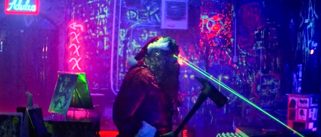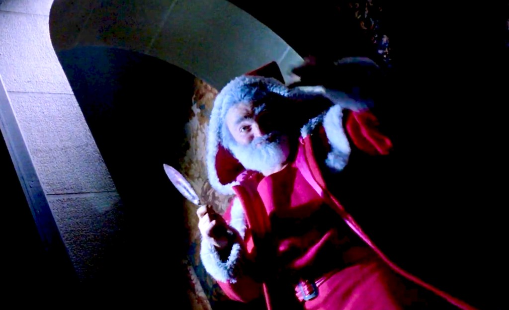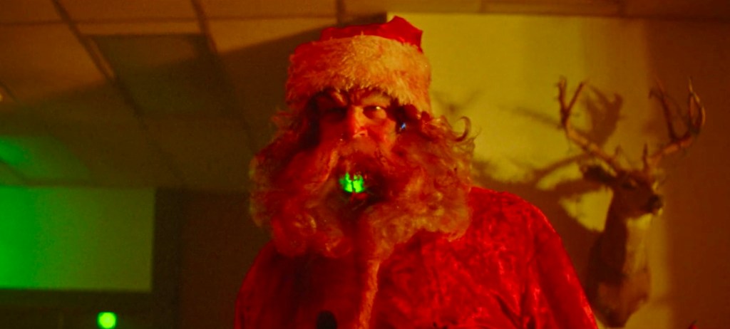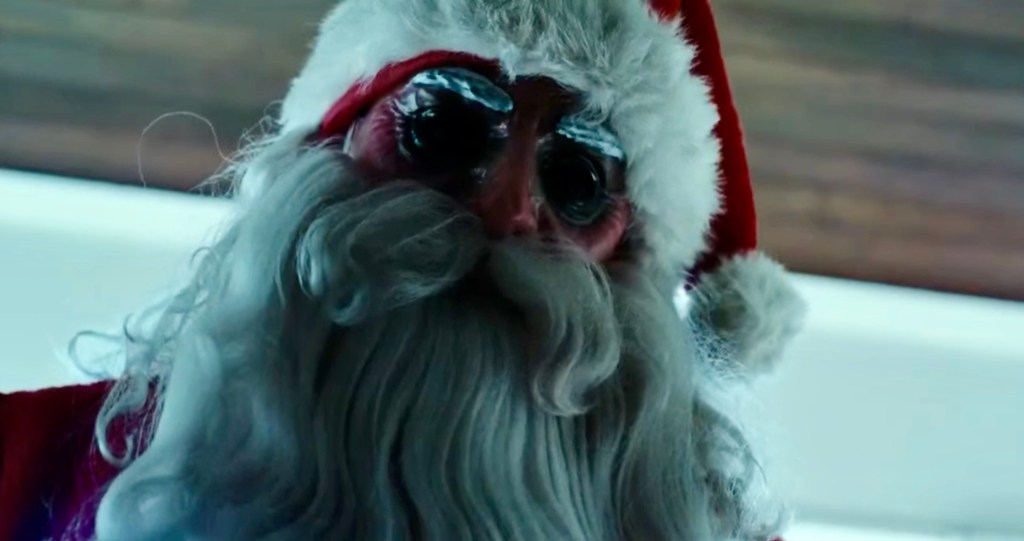 CHRISTMAS, BLOODY CHRISTMAS (2022) – Director Joe Begos just might be the first horror director to bring us a Terminator-style Santa. This Santa looks like a regular Santa in a red hat and suit, but -surprise! – heโs a robot, complete with green laser eyes and a pick head axe.