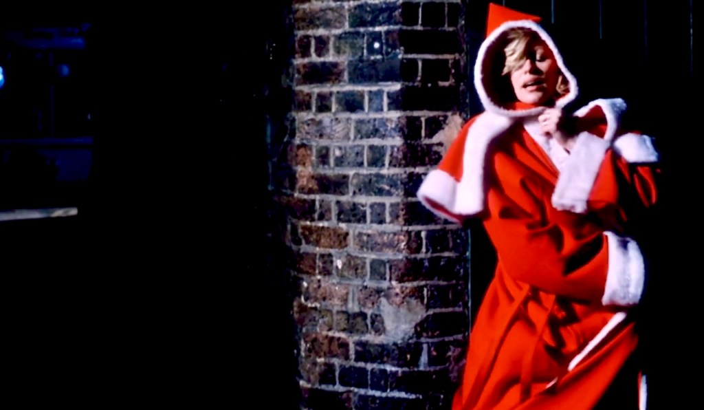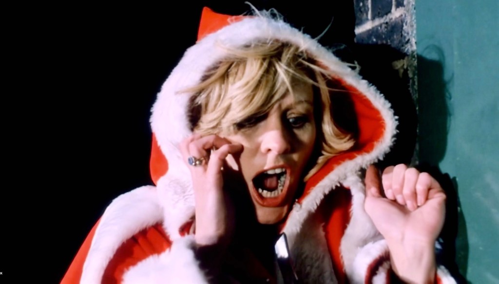 DONโT OPEN TILL CHRISTMAS (1984) – A model (Pat Astley as “Sharon”) leaves a photo shoot dressed in a red hooded white faux fur-trimmed Santa coat and capelet. Her long cloak conceals her gender, and she is mistaken for a male Santa by a holiday-hating man-killer.