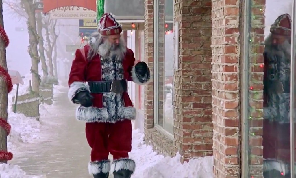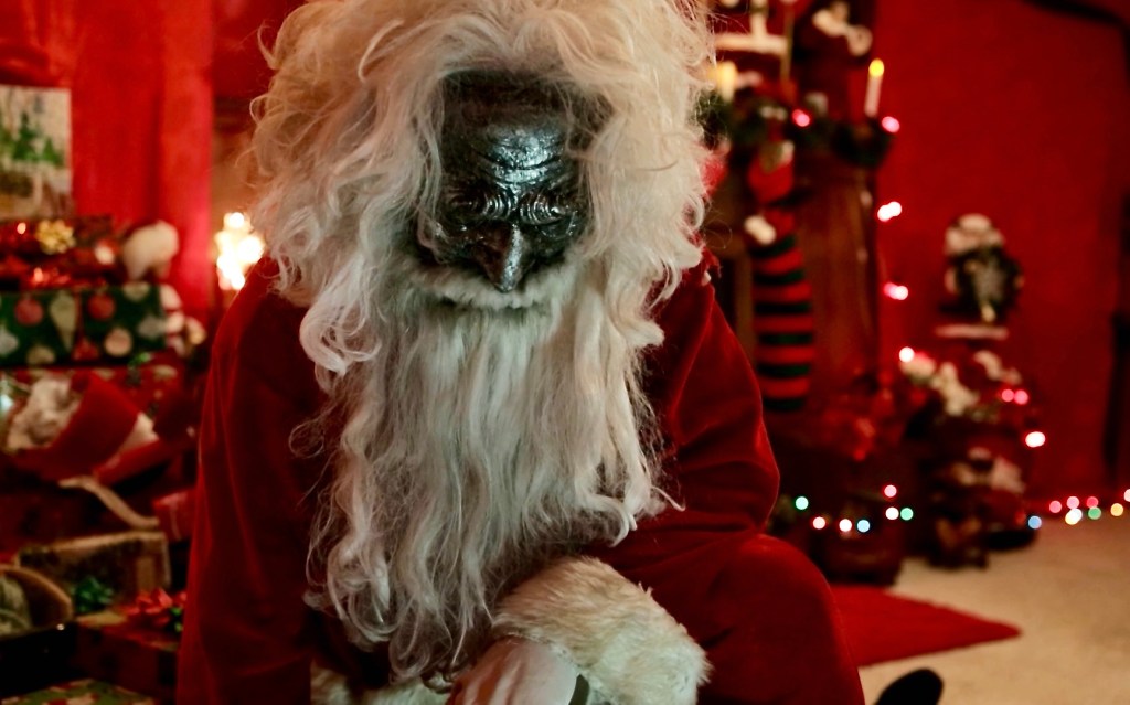 ALL THROUGH THE HOUSE (2015) – Here is one of the weirder Santa looks; a typical Santa suit worn with a soot-colored mask that reveals a pair of crazy eyes, wild white wig hair, and no hat.