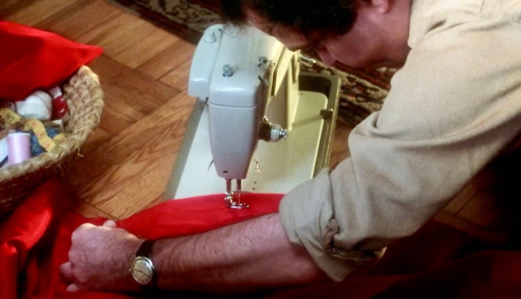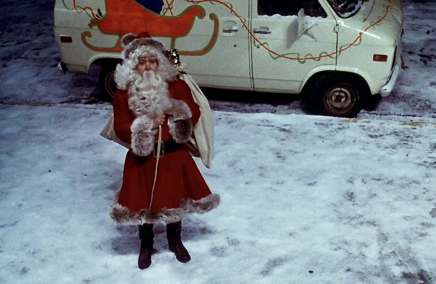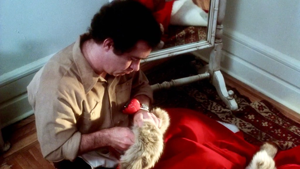 CHRISTMAS EVIL (1980) – In my favorite part of the movie, Harry Stadling (wonderfully portrayed by Fiona Apple’s dad, Brandon Maggart) cuts up a fur coat and uses a sewing machine to make a padded Santa suit He truly commits to cultivating the Santa look by gluing a fake white beard and eyebrows to his face.
