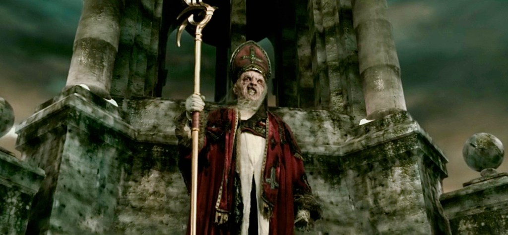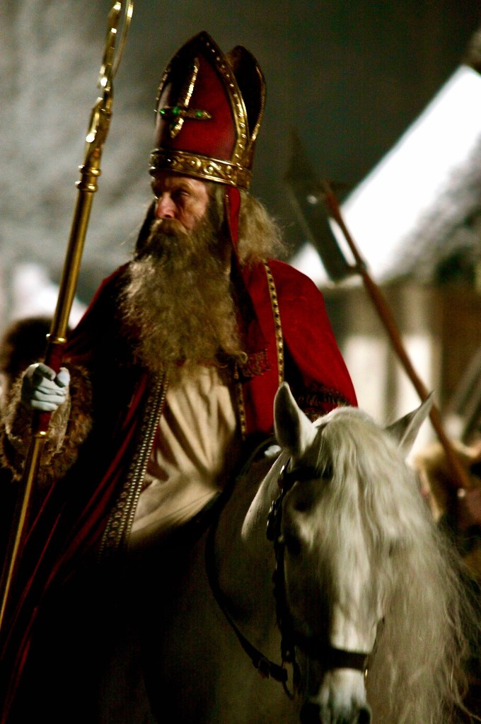 SAINT (2010) – His duds (obviously not the modern Santa look) are based on St. Nicholas, the fourth-century Greek Bishop of Myra. The ghostly Saint Nick wears traditional bishop’s vestments while carrying a crosier or staff, which he uses as a spear.