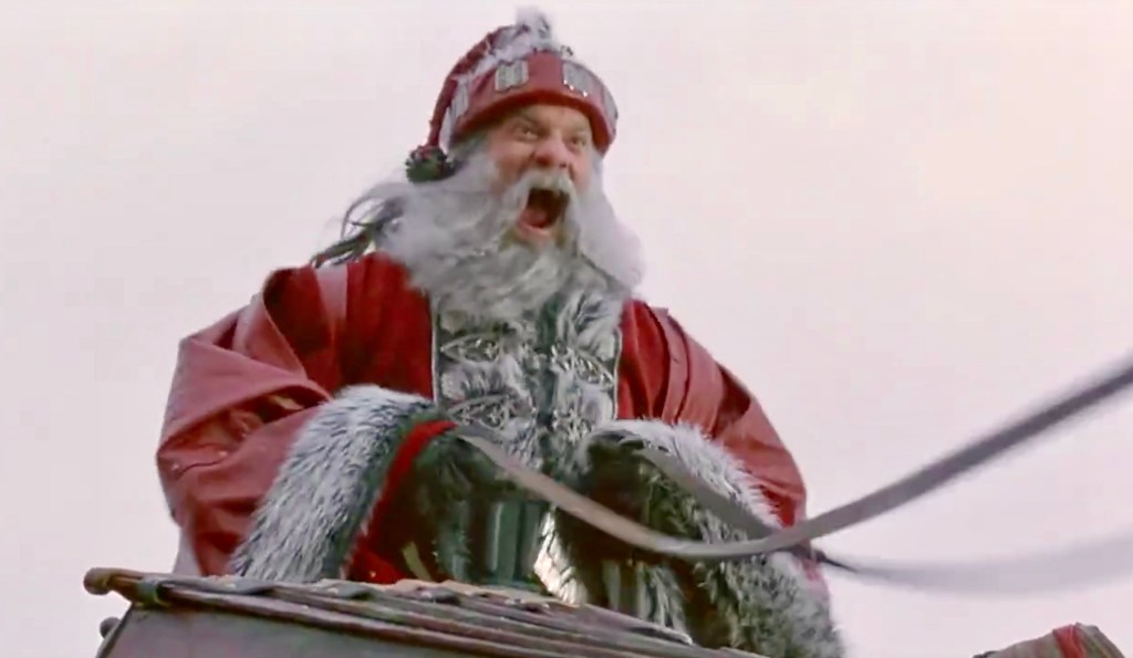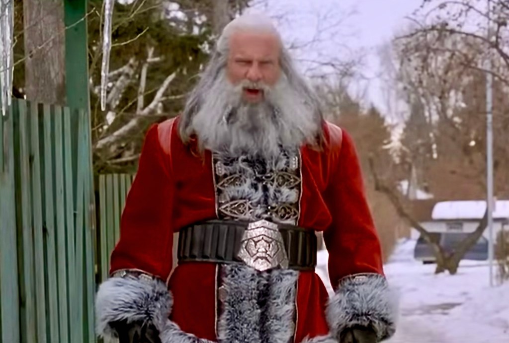 SANTAโS SLAY (2005) – The Santa from Santa’s Slay may be deranged but he has a unique sense of style. The hat, which is made of leather and fur with metal decorations on the brim and a studded black ball substituting for a pom pom, could be inspired by Midevil hat design or weaponry. His demeanor is far from warm and cuddly, though his soft, plushy suit seems to be. Other accouterments include a thick black belt with a silver metal angry Santa face for a buckle and a red leather cape with grey fur trim.