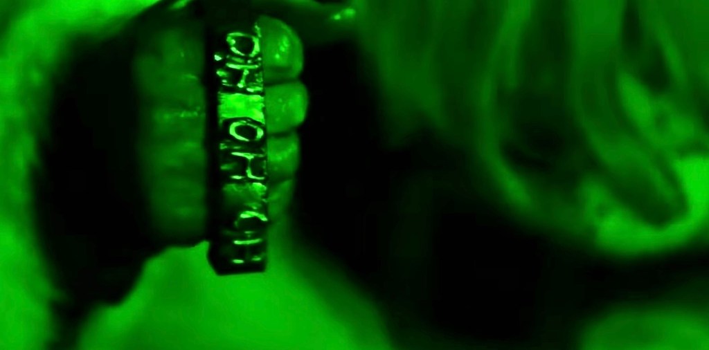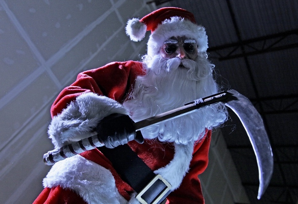 SILENT NIGHT (2012) – The opening scene introduces a killer Santa Claus who grooms himself and crafts together a creepy-looking translucent plastic mask with blackened eyes. His accessories include a cattle prod, a double-edged axe, a fire poker, a flame thrower, and a pair of HO-HO-HO brass knuckles which he uses to beat fellow Santa Donal Logue to death.