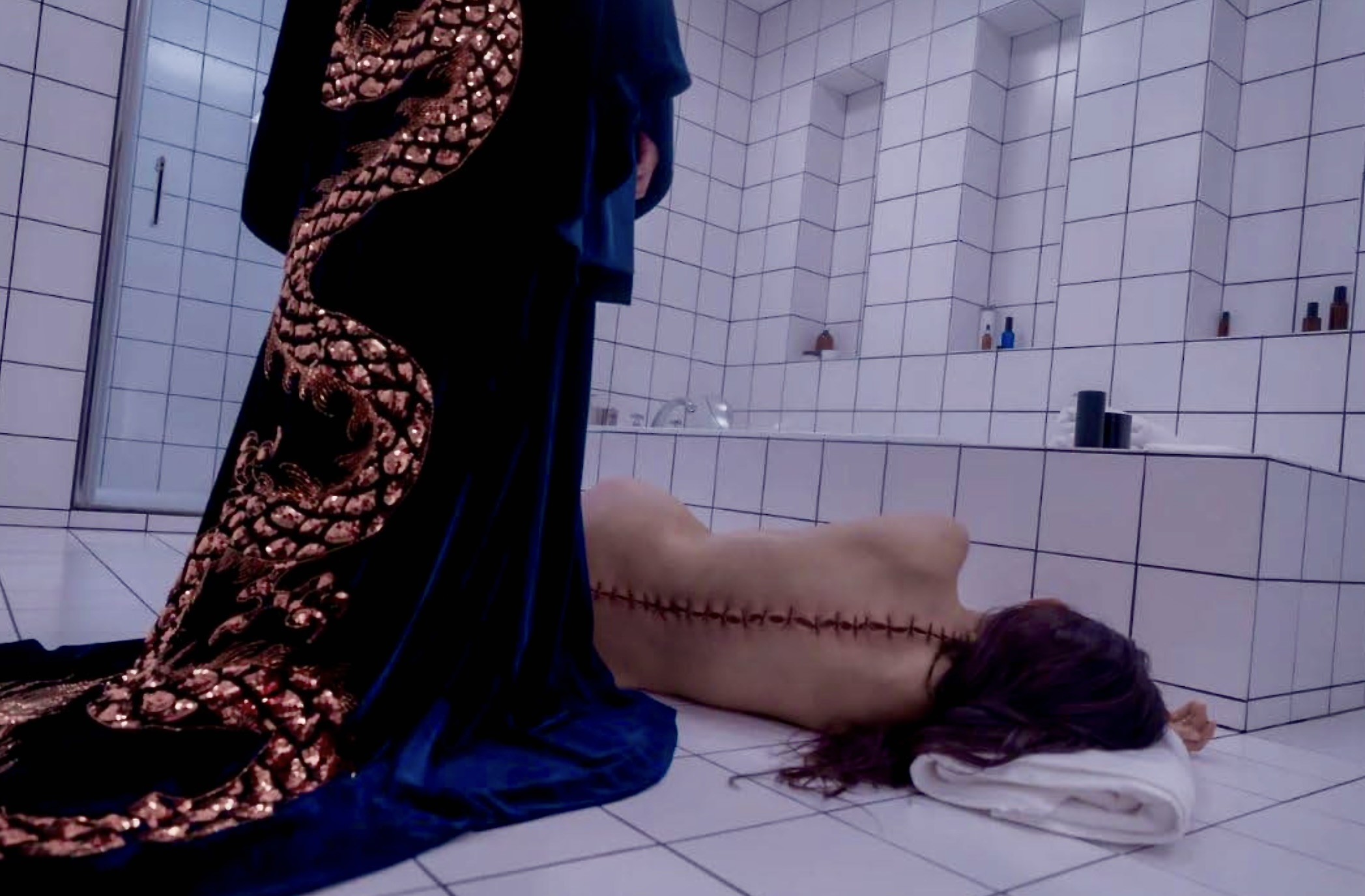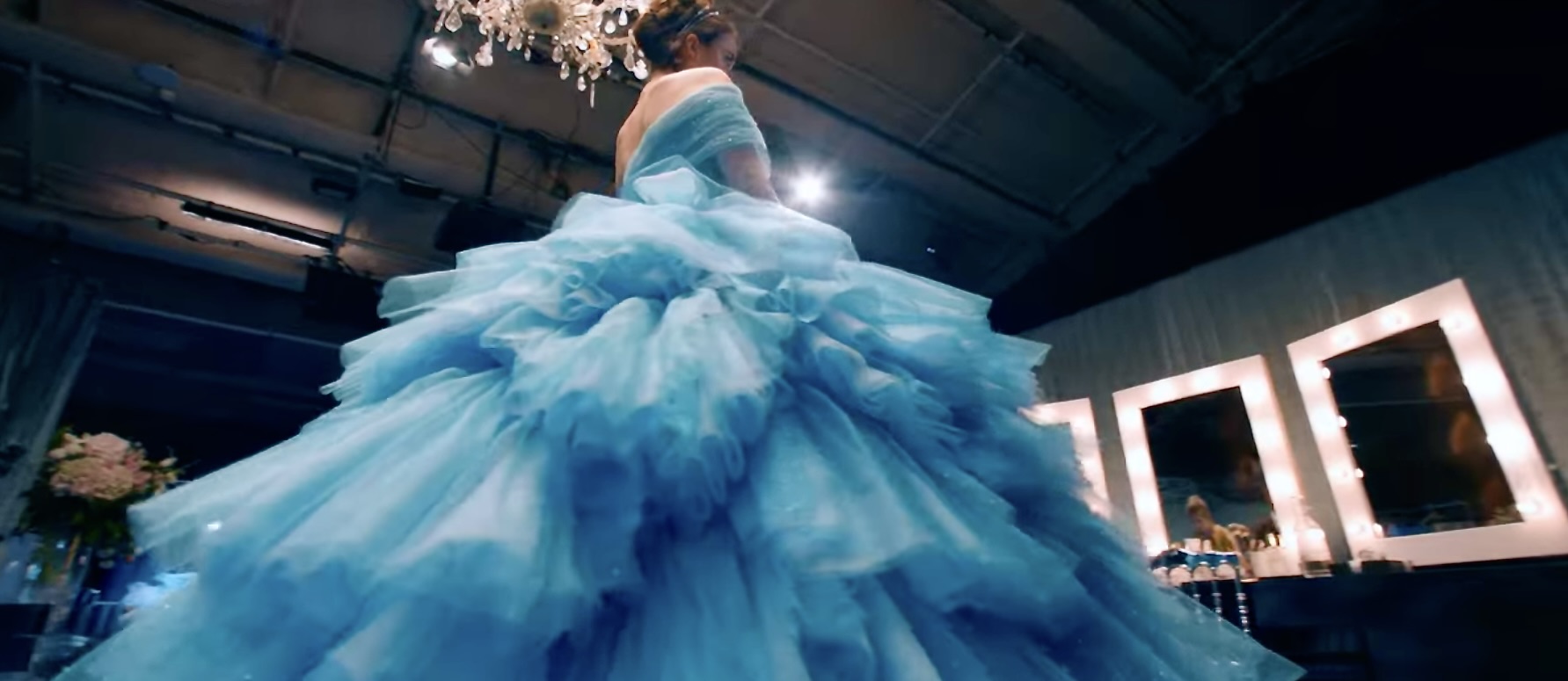 Surreal cinematography, dreamlike body horror imagery, and a bold primary color palette of blues, reds, and yellows make THE SUBSTANCE a visually striking experience. Many fashion moments stand out as well: the to-die-for velvet dragon robe, a beautiful blue pantsuit worn by Elisabeth while she is getting fired, Dennis Quaid’s gross TV exec character’s flashy suits, a black Bond-Girl leather catsuit paired with thigh-high Louboutin stiletto boots, and a sexy metallic neon pink workout one-piece worn by Sue that evokes an ’80s exercise video vixen throwback look. As a final touch, there is a voluminous blue Cinderella ball gown.