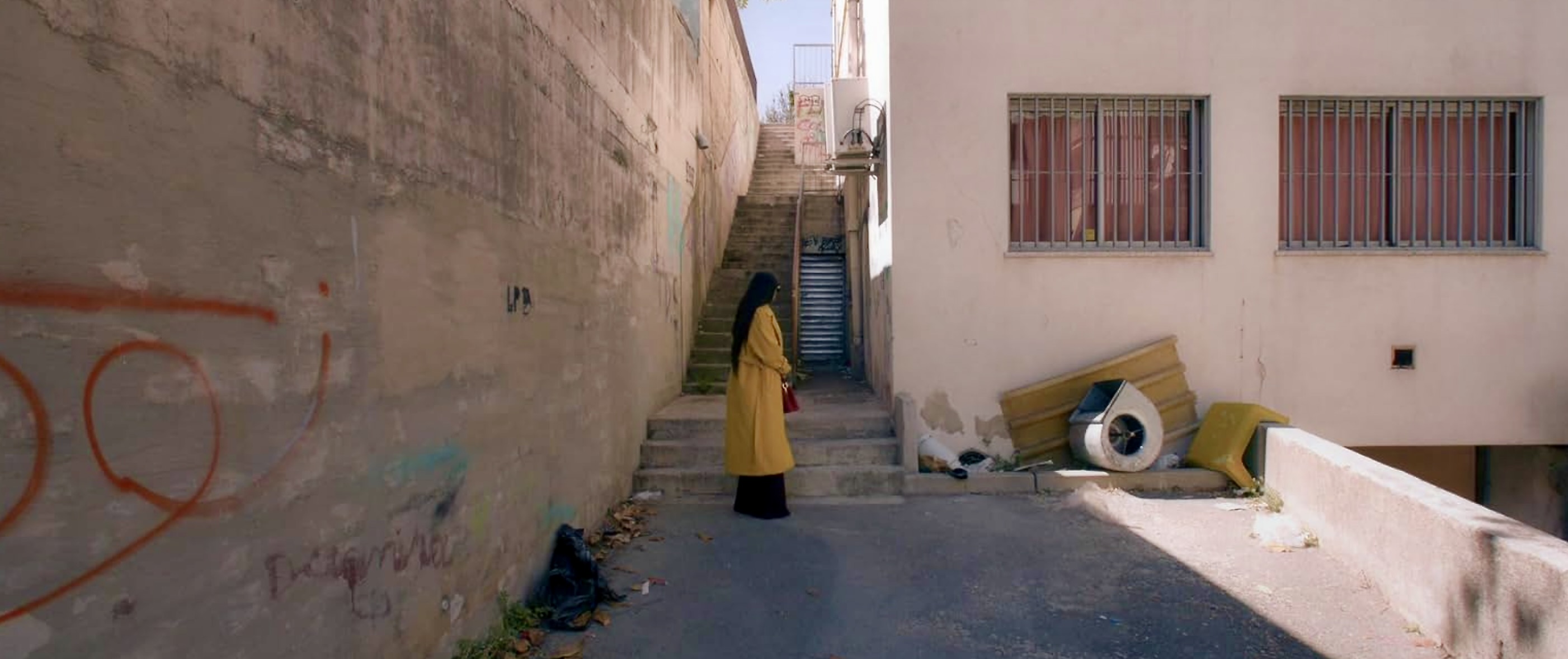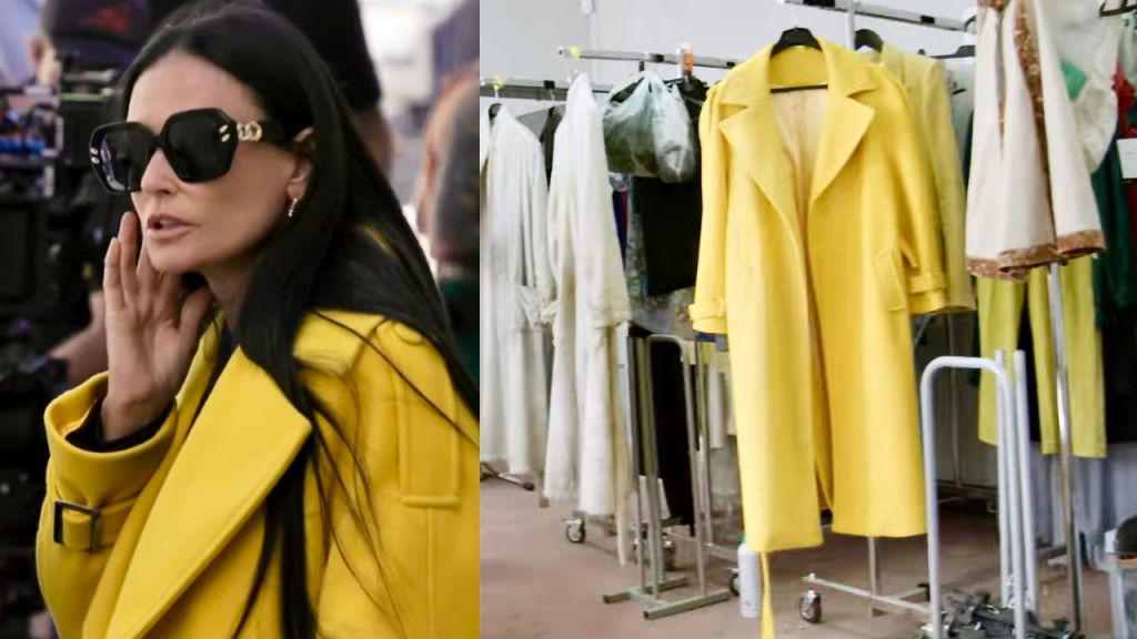 Of all THE SUBSTANCE’s gorgeous garbs, nothing rivals my love for Elisabeth Sparkle’s vibrant yellow wool belted trench coat. Created by costume designer Emmanuelle Youchnovski, the wool trench acts as a character in its own right, seemingly serving as a stylish security blanket for Elisabeth. The coat’s brilliant hue symbolizes the yellow of the egg yolk that replicates itself after being injected with “The Substance”. Elisabeth frequently wears it throughout the film, from surviving a car accident to picking up her refill kit in Byron Alley, or wearing it as ‘Better Version’ Sue while walking to a fitness show audition.
